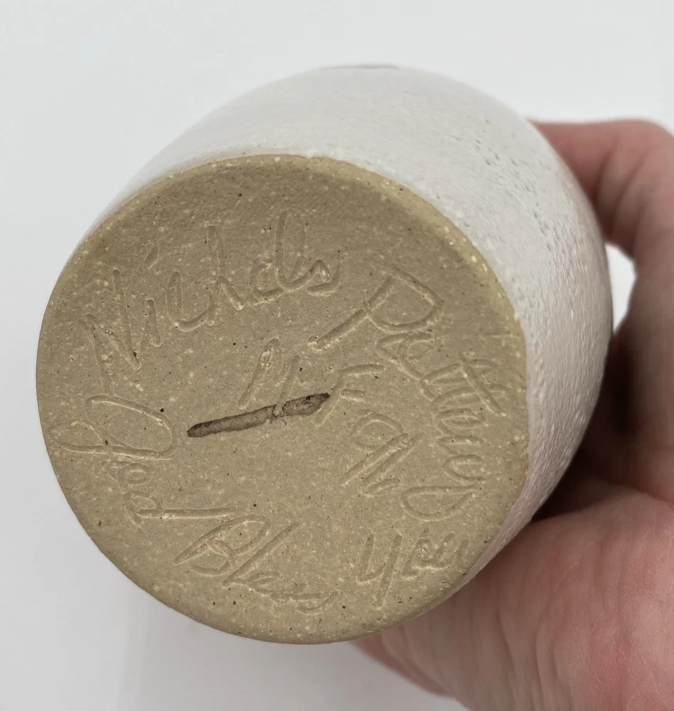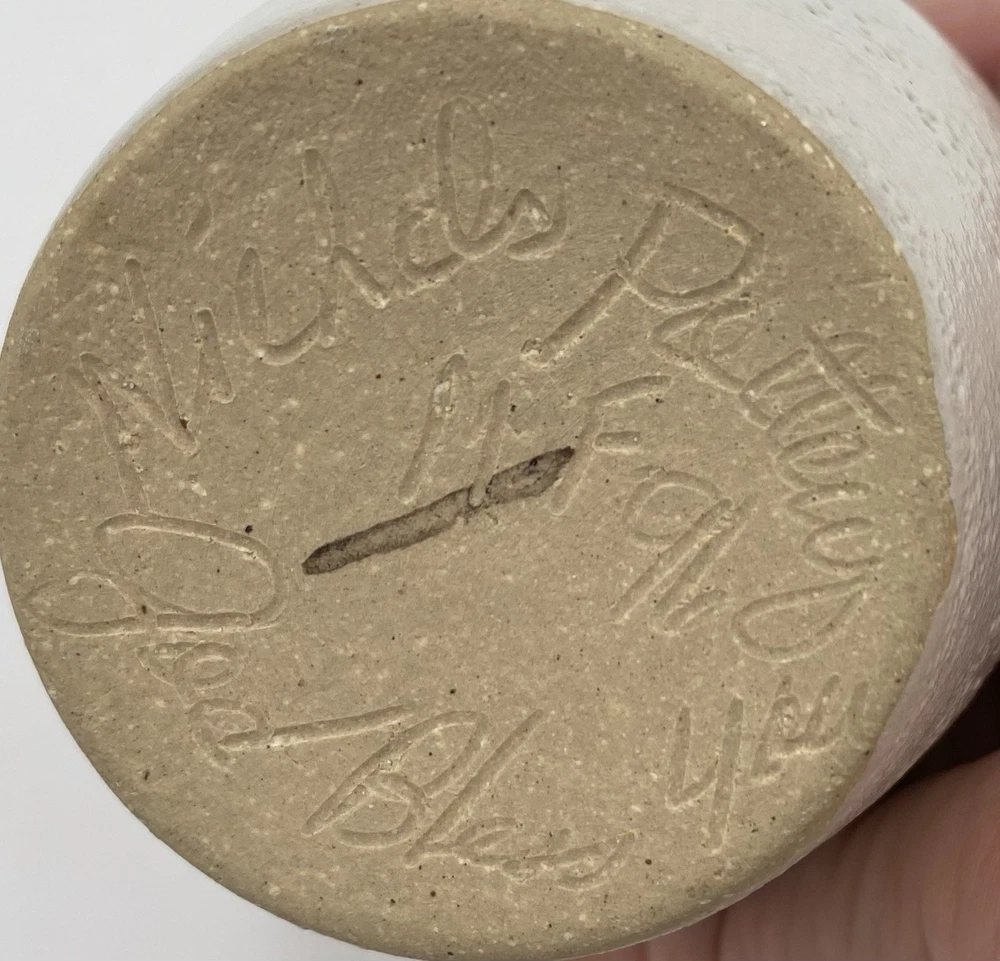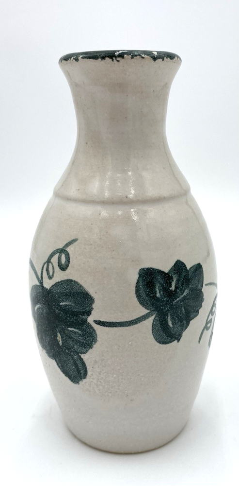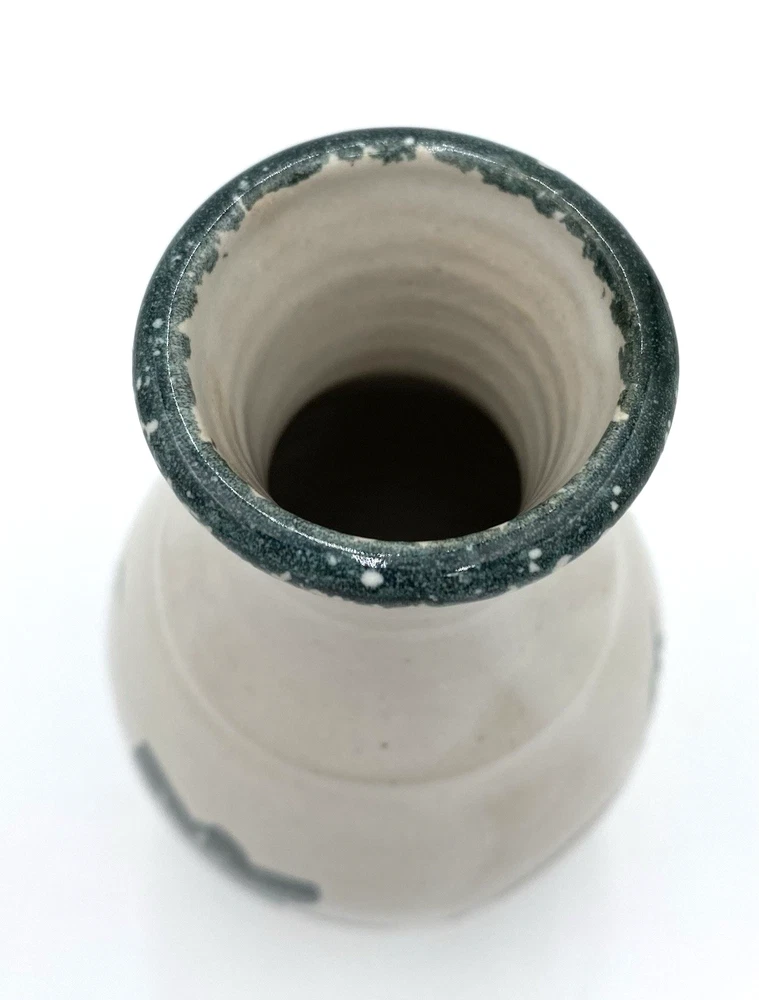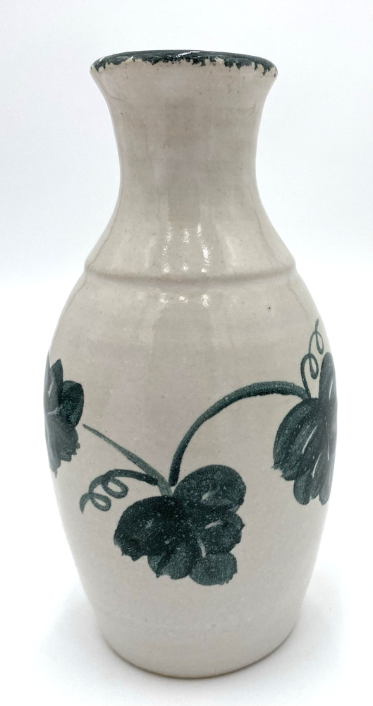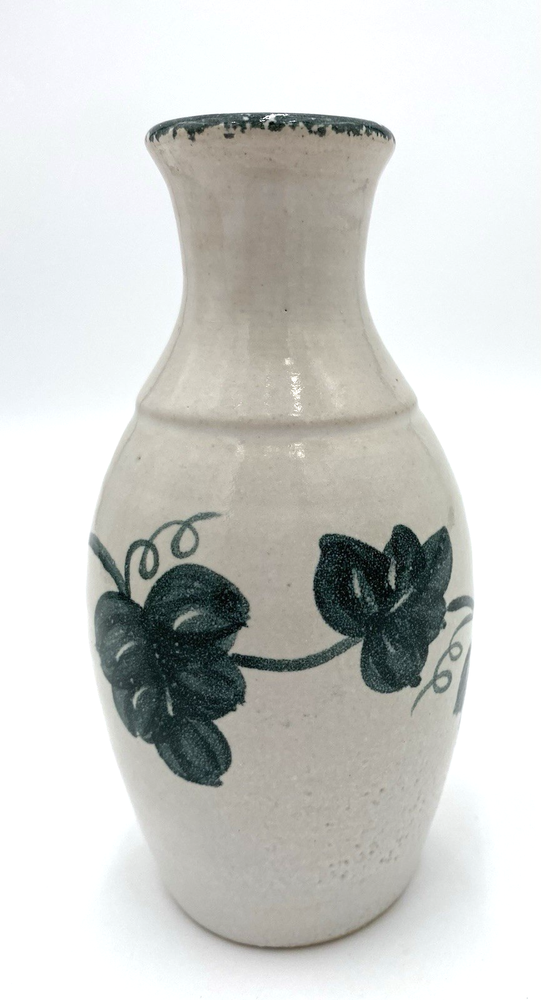 This vintage Nichols Pottery vase is a beautifully hand-crafted piece of art pottery from 1996, featuring a glossy majolica white finish with a green ivy hand-painted design circling the center. This 6.1" vase is signed by Nichols Pottery and bears a lovely ivy vine design as well as a green spongeware circling the rim. The vase is in excellent condition. There are no chips, cracks or signs of wear.