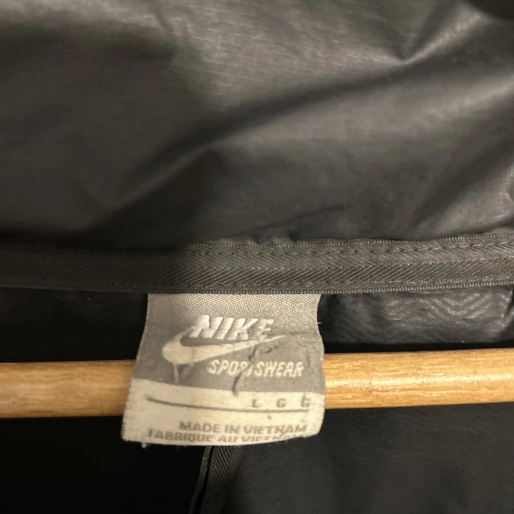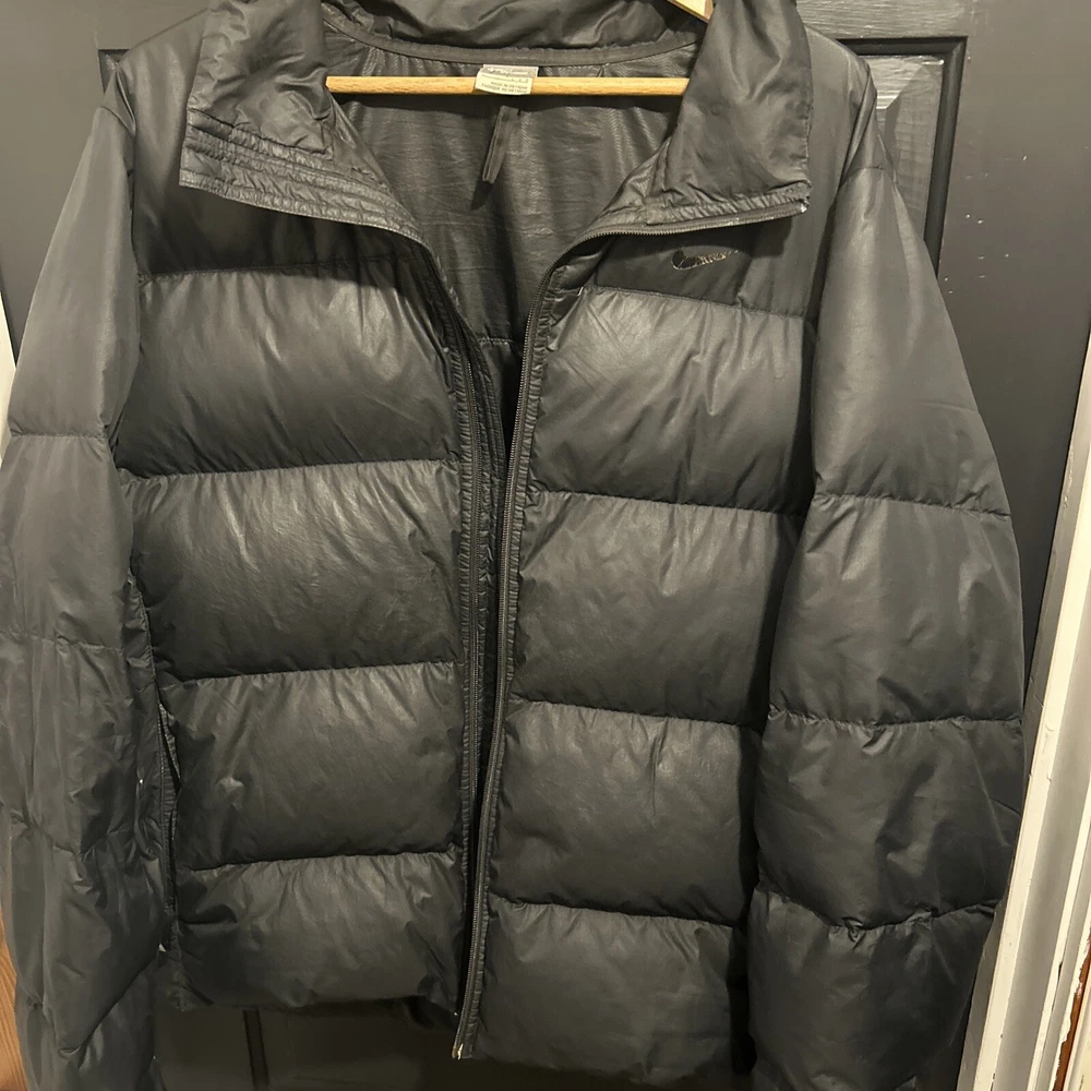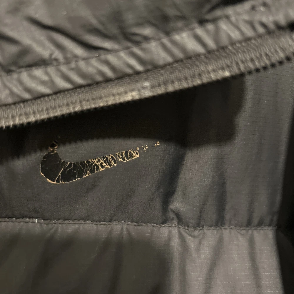 In good condition. Nike emblem is peeling slightly and there are very few holes/imperfections! Stay warm and stylish with this vintage Nike puffer jacket. The black polyester outer shell and nylon lining provide a sleek and classic look, while the down insulation keeps you cozy in colder weather. This jacket features a full zip closure, stand-up collar, and pockets for added convenience. With its solid pattern and regular fit, this puffer jacket is perfect for casual occasions and outdoor activities. The Nike brand and 90s theme add a touch of retro flair to your outfit. This jacket is handmade and comes in a size L, making it a unique addition to any wardrobe.