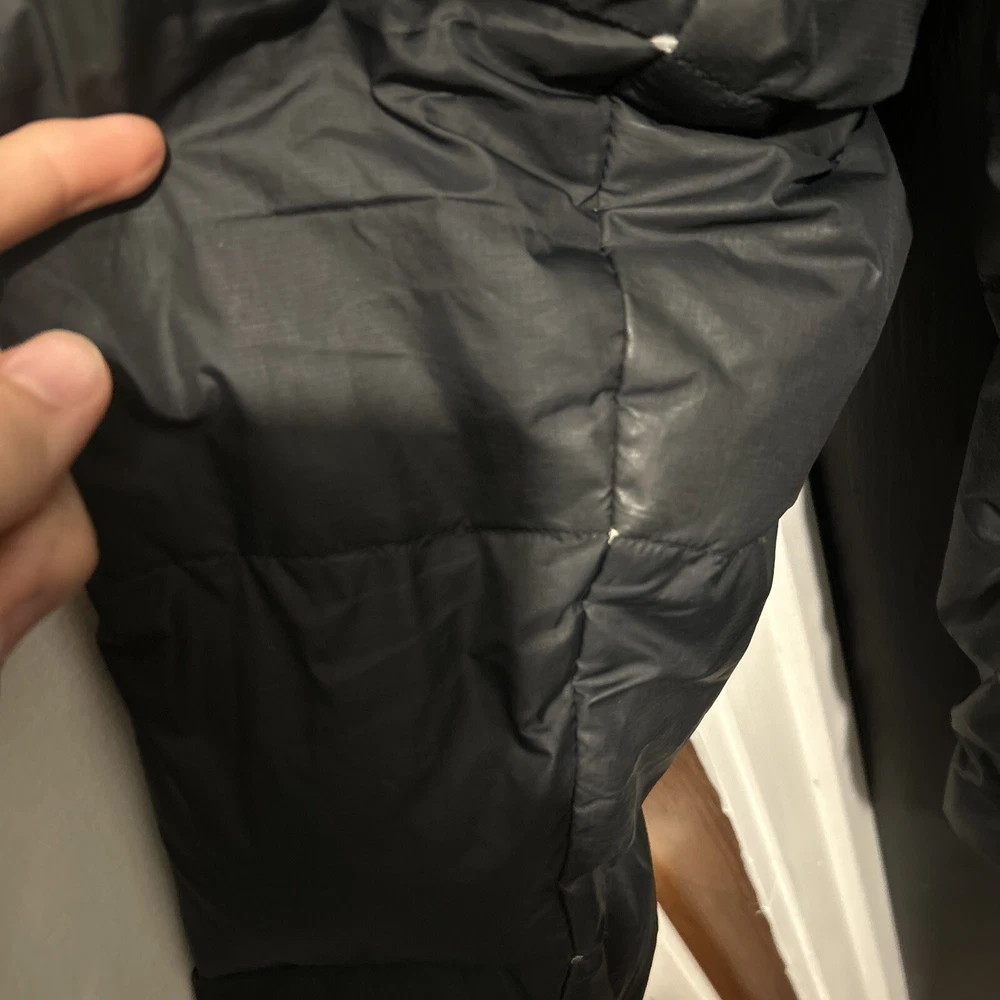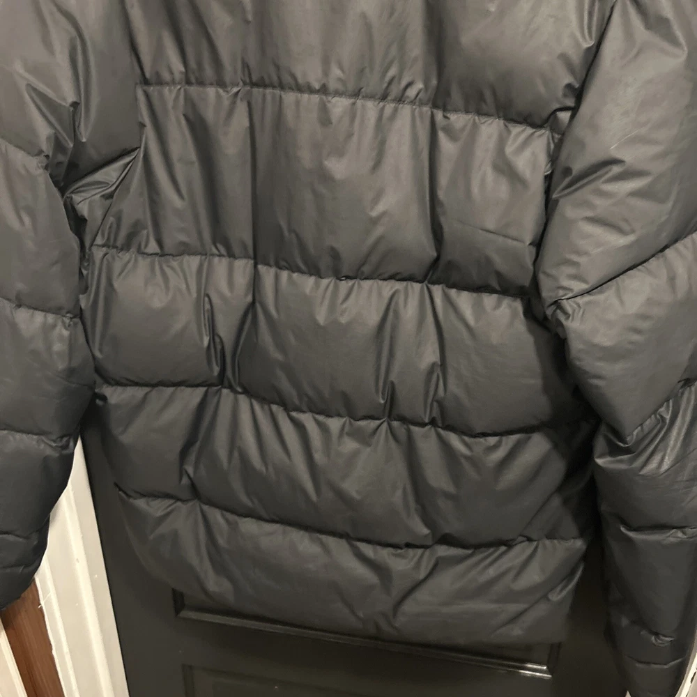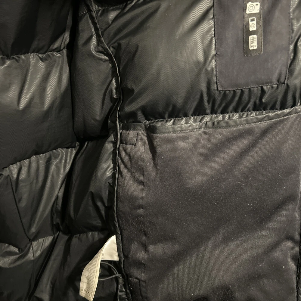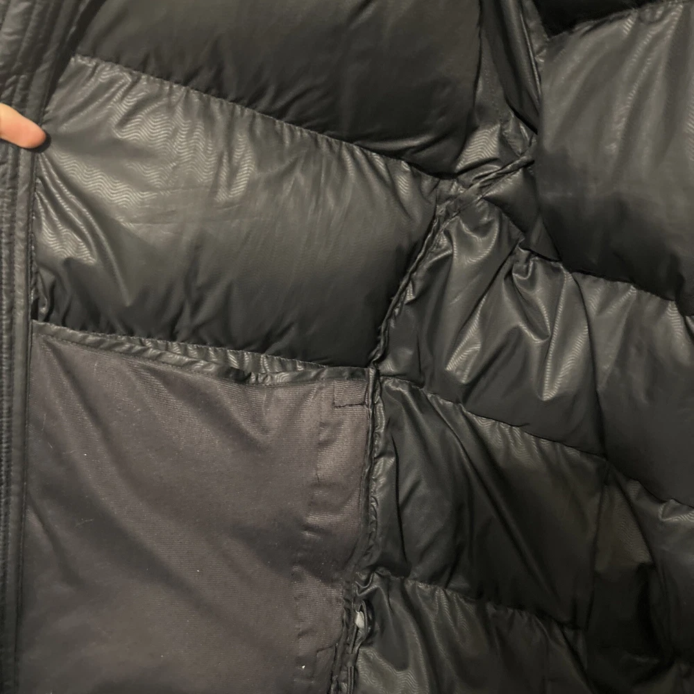 In good condition. Nike emblem is peeling slightly and there are very few holes/imperfections! Stay warm and stylish with this vintage Nike puffer jacket. The black polyester outer shell and nylon lining provide a sleek and classic look, while the down insulation keeps you cozy in colder weather. This jacket features a full zip closure, stand-up collar, and pockets for added convenience. With its solid pattern and regular fit, this puffer jacket is perfect for casual occasions and outdoor activities. The Nike brand and 90s theme add a touch of retro flair to your outfit. This jacket is handmade and comes in a size L, making it a unique addition to any wardrobe.