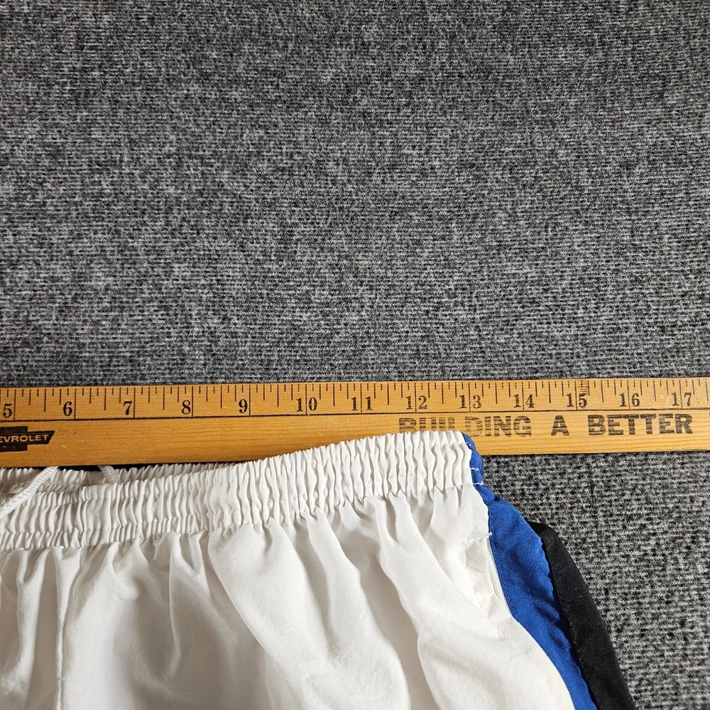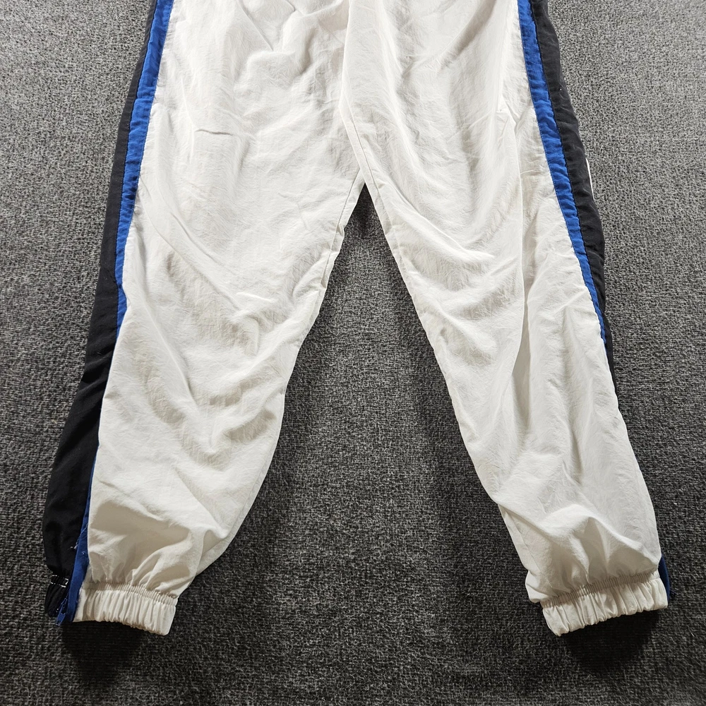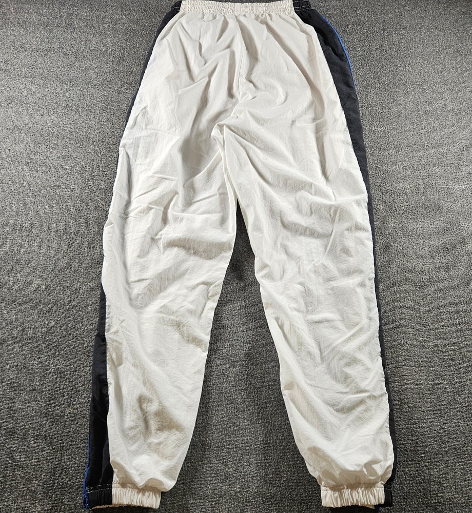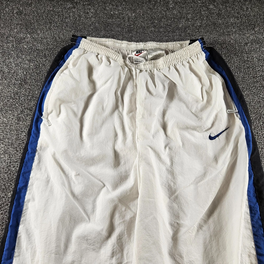 These Vintage Nike Track Pants in white and blue are a nostalgic throwback to the 90s, perfect for a youth size large boy looking for a statement piece of activewear. Made of nylon material, these pants feature an elastic waist for comfort and are machine washable for easy care. The solid pattern and Nike branding add a touch of retro style to the wardrobe, ideal for the winter, fall, or spring seasons. Made in Taiwan, these track pants are a unique and stylish addition to any young boy's clothing collection.