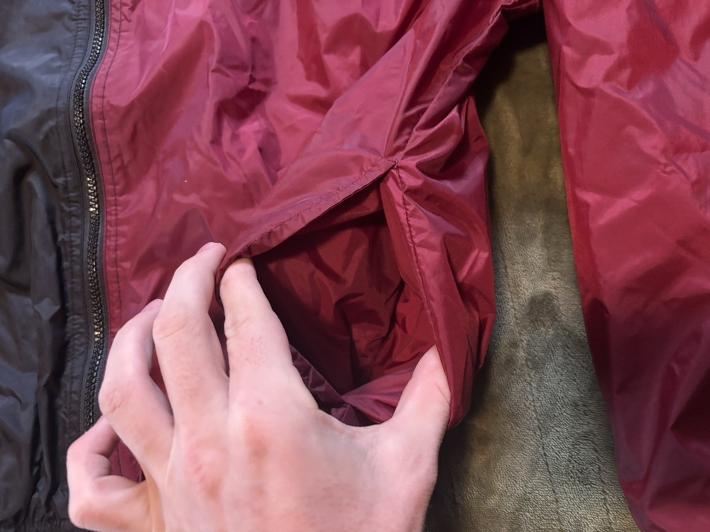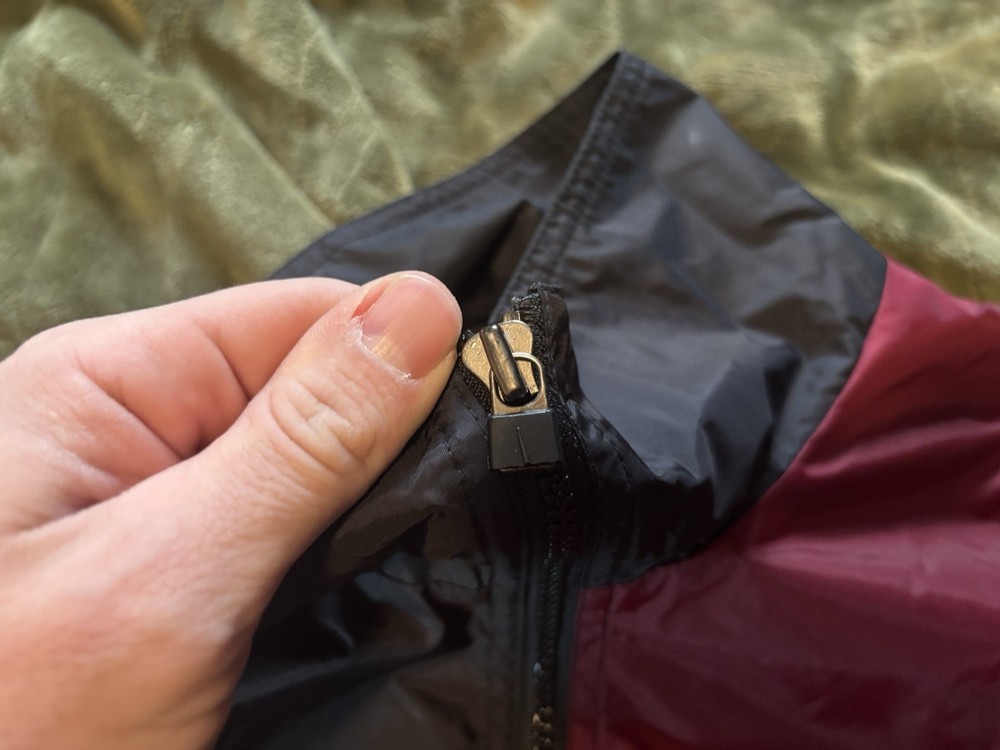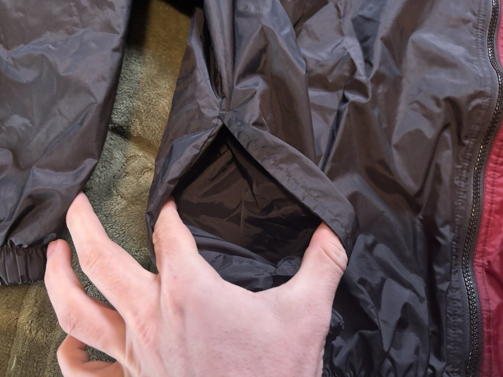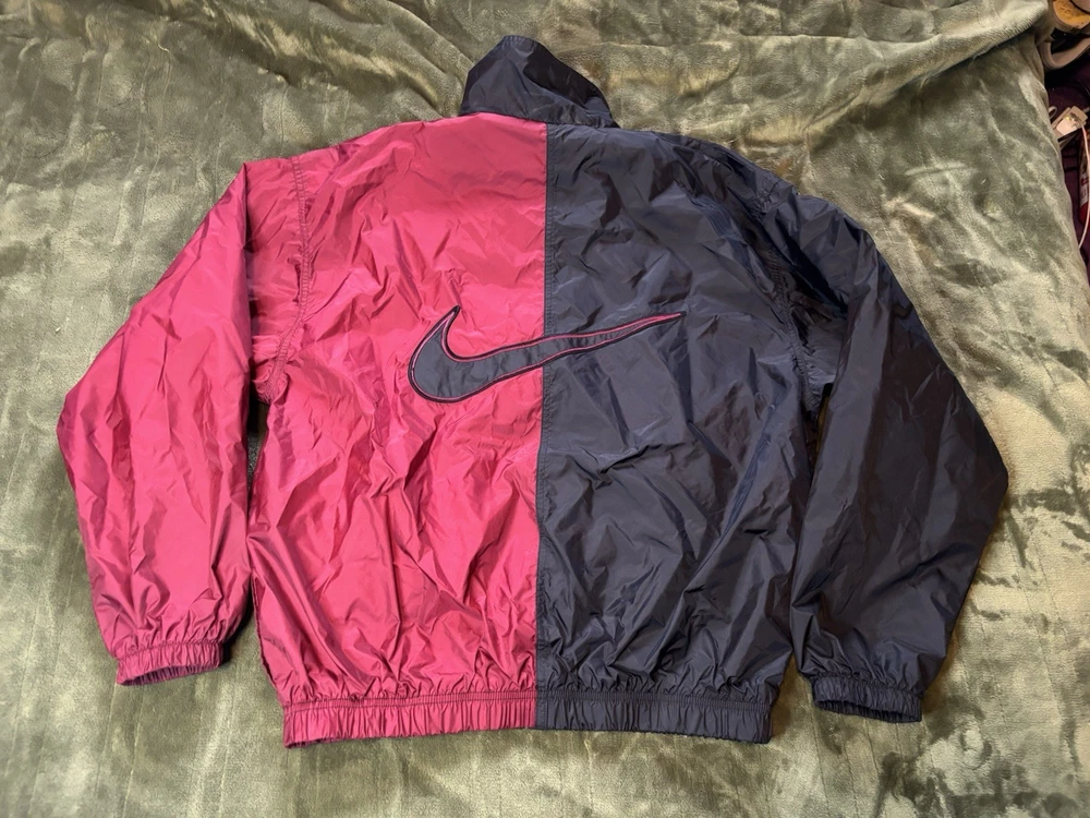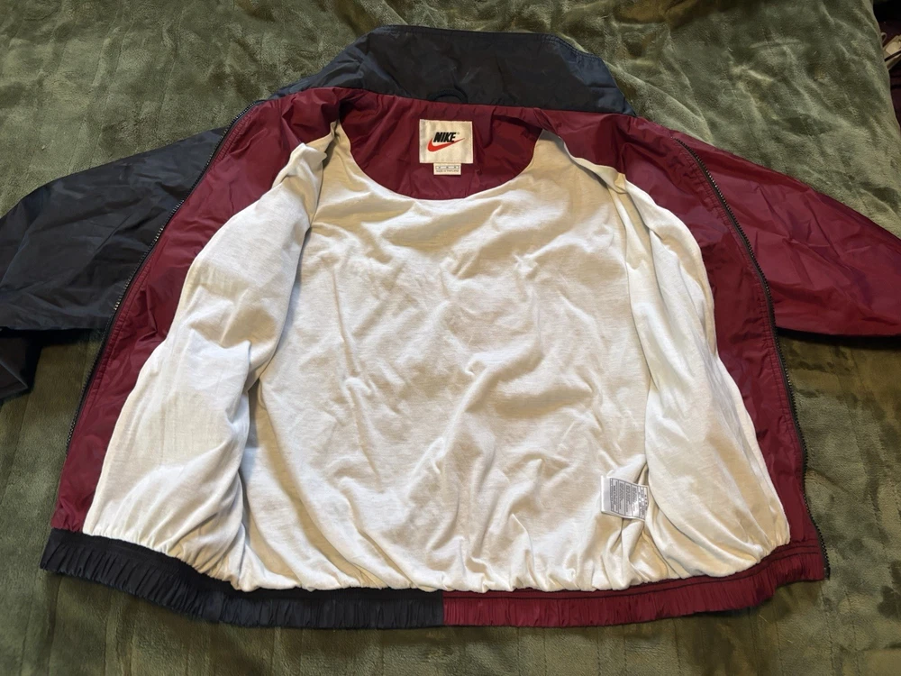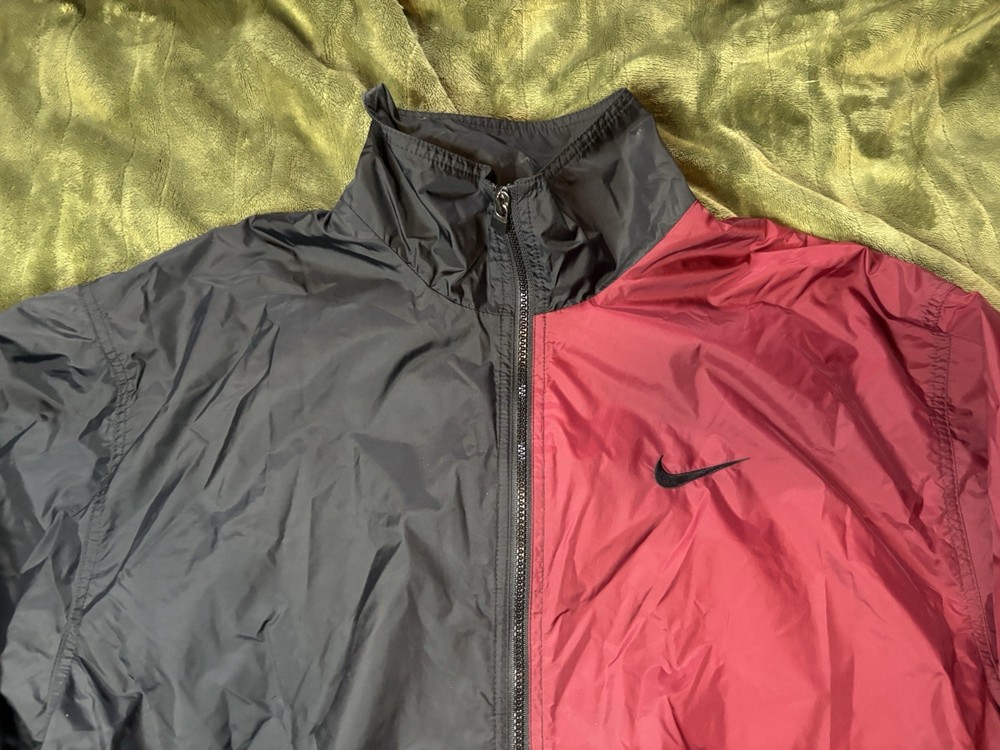 The Vintage Nike Windbreaker Jacket is a stylish and lightweight garment perfect for a variety of occasions. Made of durable nylon with a comfortable polyester lining, this jacket features a stand-up collar, full zip closure, and colorful red and black colorblock design with the iconic Nike Swoosh logo. Ideal for fall, winter, and spring, this mid-length windbreaker is a great addition to any casual or sporty outfit. Easy to care for with machine washable fabric, this jacket combines retro style with modern functionality for a versatile and timeless piece. The zipper fully works but half of the pulltab has been broken off.