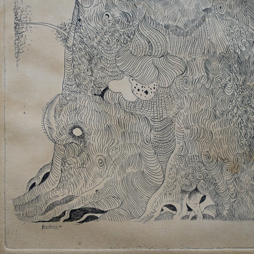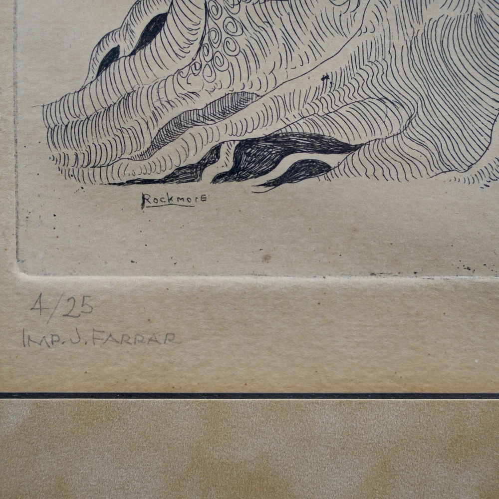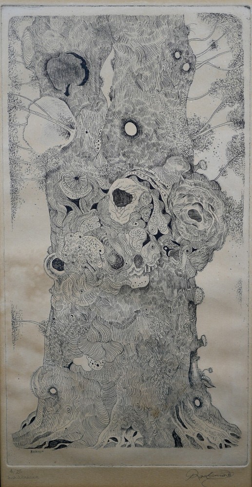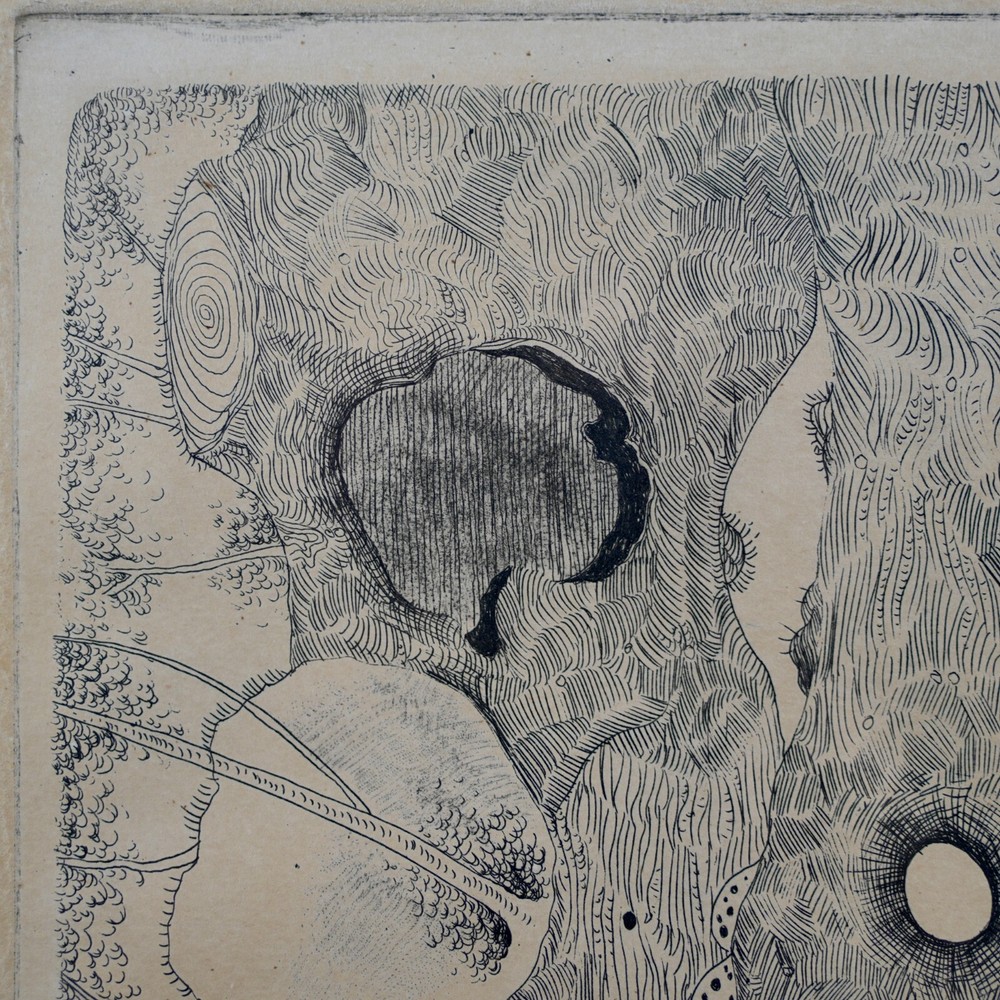 The Vintage ( Circa.1960s ) Framed Limited Edition Abstract Expressionist Etching on Paper "Tree of Life" , Pencil Signed By Artist Noel Rockmore ( American, 1928-1995 ) in Lower Right, Numbered 4/25 and IMP. (Impression) J. FARRAR in Lower Left. It Depicts the Scene of A Giant Tree of Life in the Style of Abstract Expressionism, with Extremely Delicate and Vivid Details. The Etching Shows Toning, Foxing, and Some Wear on the Frame Consistent with Age, In Good Condition. About Artist: "Noel Rockmore (December 15, 1928 – February 19, 1995) was born Noel Montgomery Davis to his mother, Gladys Rockmore Davis, and his father, Floyd Davis, in New York City. Rockmore was an American painter, draughtsman, and sculptor. He produced more than 15,000 works of art in his lifetime. He is known for his portraits, his early rise to fame, his Preservation Hall portraits, and for changing his name at the height of the popularity he had developed in New York City. Noel painted in a realistic and old masters style throughout his childhood and adolescence. He experimented with different artistic theories, techniques, and ideas in the New York art world of the 1950s. Rockmore reached what for most artists would have been a career pinnacle when he was given a show at the Metropolitan Museum of Art in New York in 1952 at the young age of 24. A few years later, his paintings were shown at the Whitney Museum (1958), the Pennsylvania Academy in Philadelphia and the Cleveland Institute of Art. As the abstract expressionist movement gained momentum, Rockmore left New York and went to New Orleans, where he changed his name from Noel Davis to Noel Rockmore, adopting the surname of his mother. Once the Preservation Hall series was complete, Rockmore traveled back and forth between New York and New Orleans throughout the 1970s and 80s, creating many different series, including a Civil War series, an Ancient Egyptian series, and an Immigration series. In 1998, a retrospective was held at the New Orleans Museum of Art (NOMA), sponsored by Shirley Marvin, Preservation Hall, and NOMA. The show "Noel Rockmore: Fantasies and Realities" was presented by curator Gail Fiegenbaum and included a brochure and panel discussion with George Wein, Shirley Marvin and Rita Posselt. In November 2006, one year after Hurricane Katrina, Rich and Tee Marvin, Shirley's son and daughter-in-law, discovered over fourteen hundred (1,400) Rockmore works in Shirley Marvin's storage facility in New Orleans. They also found 35 years worth of correspondence, every Rockmore brochure and news article, as well as a documentary film all related to the life of Noel Rockmore. Museums such as the Hirshhorn Museum of Art, Museum of Modern Art, Metropolitan Museum of Art, New Orleans Museum of Art (NOMA) and Ogden Museum of Southern Art are graced with his brilliant works we know to be in existence. It is alleged that there are paintings we are still unaware of, which are located in homes and bars throughout New Orleans. His daughter, an affluent artist, had a recent opening in the New Orleans Jazz Museum last December 2019, titled, New Orleans Music Observed: The Art of Noel Rockmore and Emilie Rhys. New Orleans Music Observed: The Art of Noel Rockmore and Emilie Rhys promises to illuminate new insights into the work of these great artists, the venerated musicians who are their subjects, and even the mysterious nature of New Orleans music and New Orleans itself. " Title: "Tree of Life" Artist: Noel Rockmore ( American, 1928-1995 ) Time Period: 1960s Medium: Etching on Paper Signature: Pencil Signed Numbered: 4/25 Condition: Good Condition Frame Size: 29-1/4" By 20" Sight Size: 18-3/4" By 10" Available For Domestic Shipping and International Shipping. Thanks!