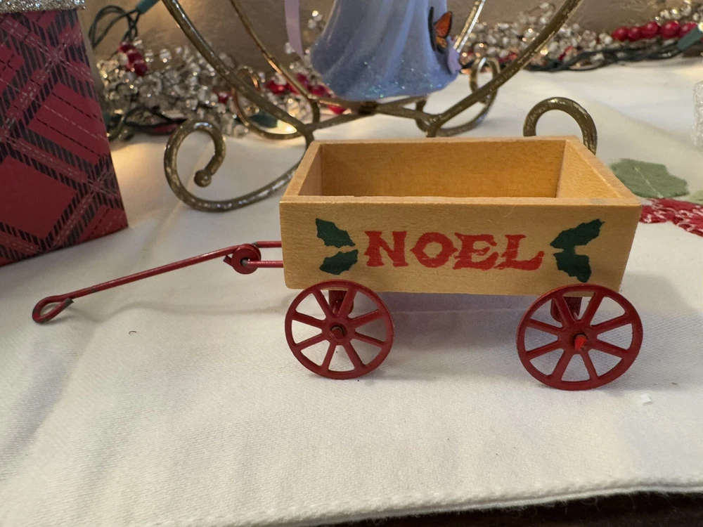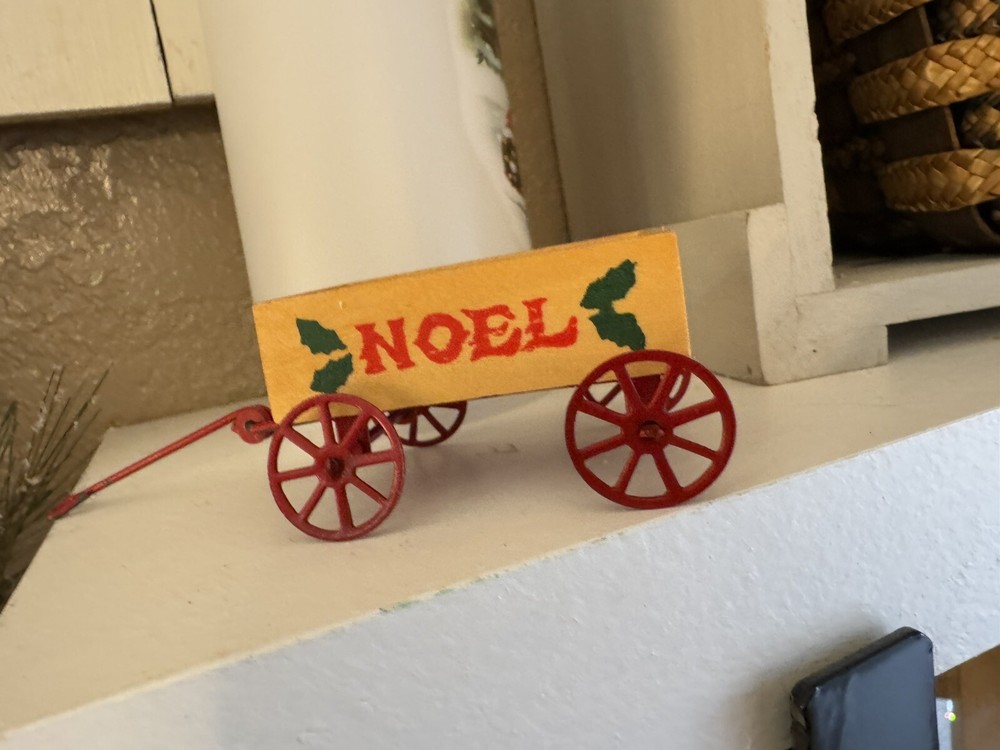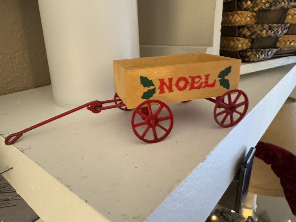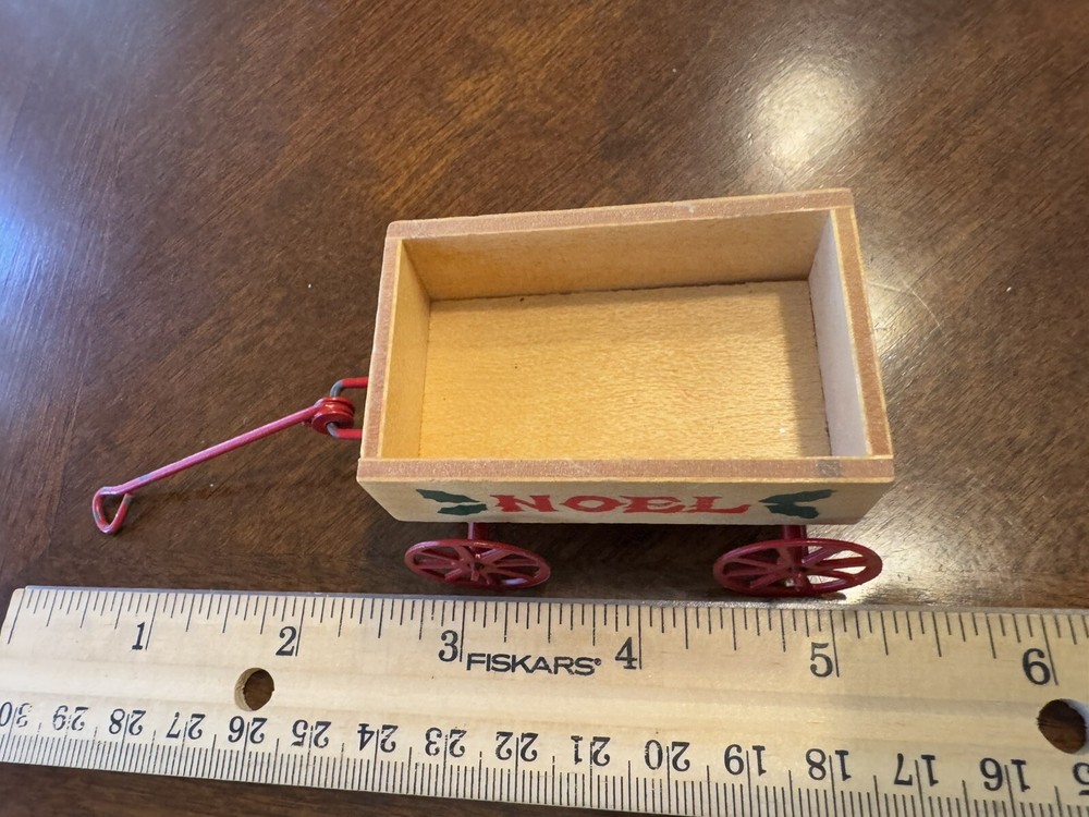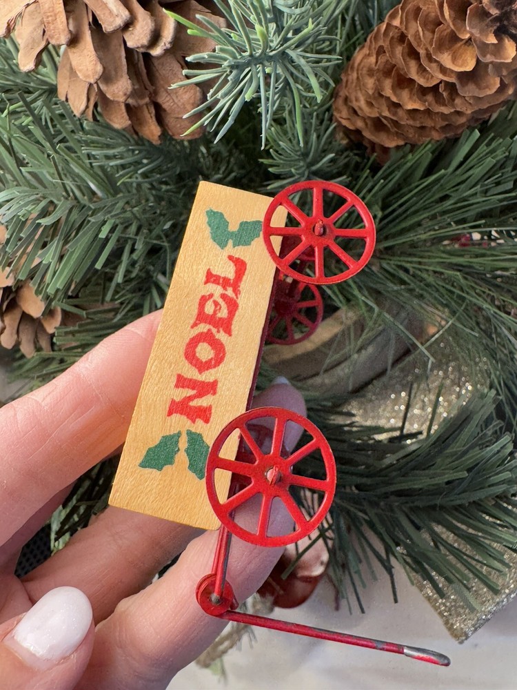 Vintage Noel Wood Wagon with Metal Wheels Christmas Ornament Dollhouse Miniature Decor