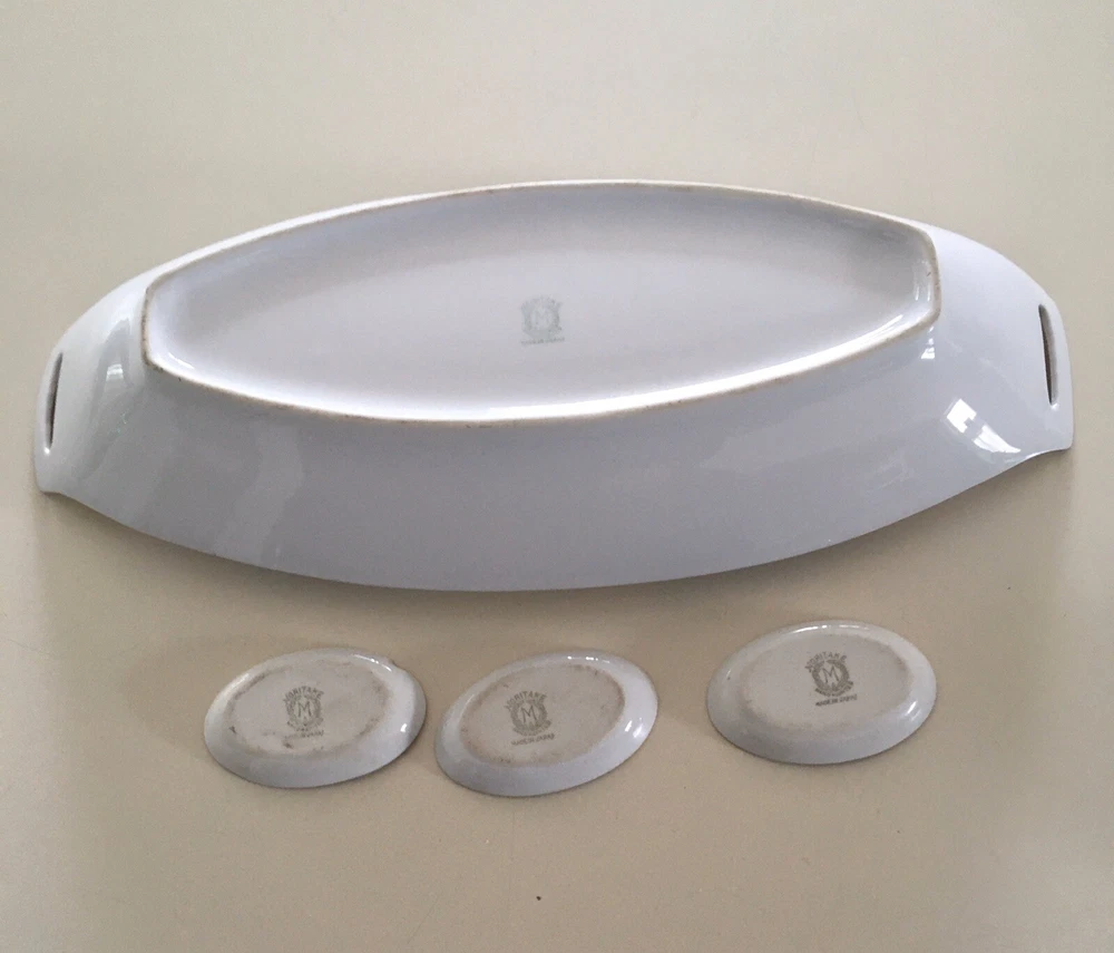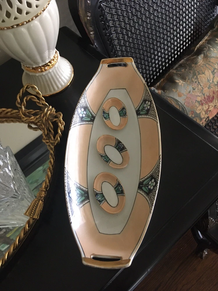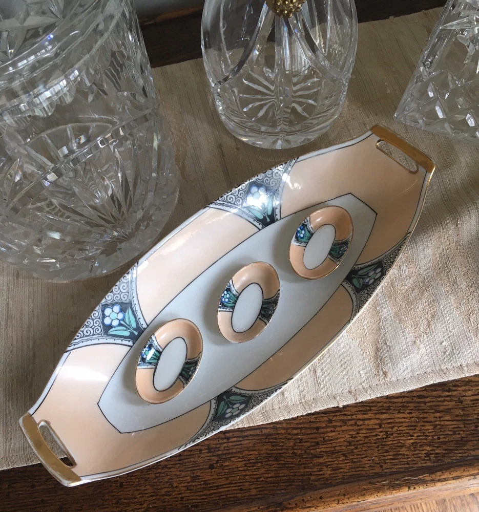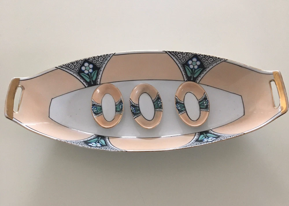 Vintage Noritake Morimura Japan Celery/Relish Dish & 3 Salt Cellars Art Nouveau. Beautifully Retro & Hand painted in pale peach, black & teal on white porcelain. Gold trim. Celery Dish is 12” long, 5 1/8” wide. Salt cellars 2 3/8” long, 1” wide. Preowned/Condition is Used. Please use zoom to see detail & condition. Estate find. Not perfect with some age related wear (one salt cellar has a chip on the bottom rim). Very lovely overall. Shipping in Continental US only. Shipping USPS Ground Advantage.