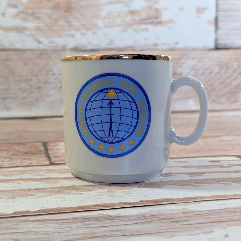 Vintage North Atlantic Girl Scouts Mug North Atlantic Girl Scouts are troops in Europe 3" diameter x 3.25" tall Gold Rim - rim shows signs of use From Smoke Free/Cat Friendly Home