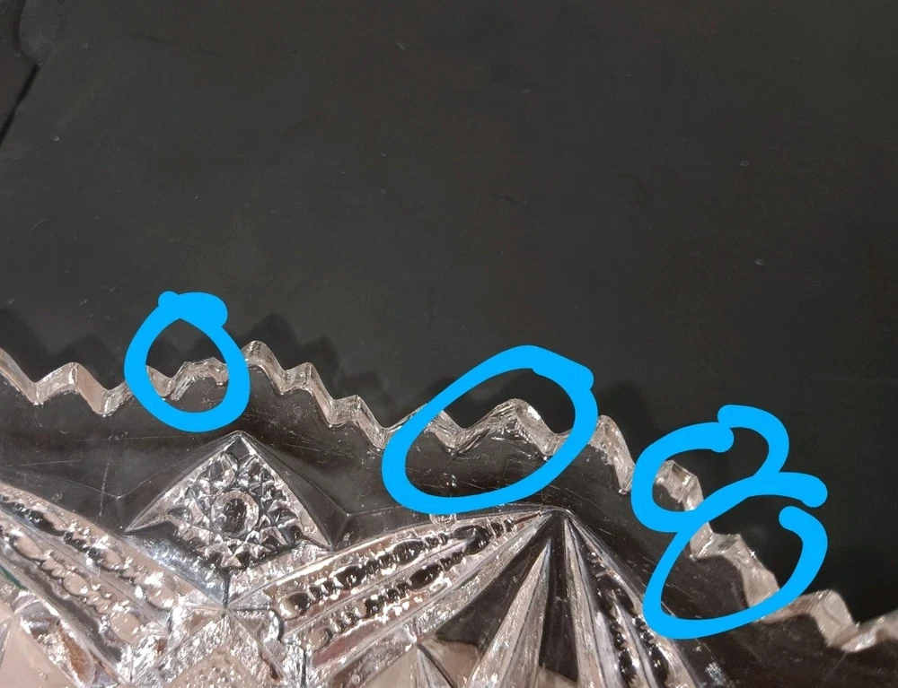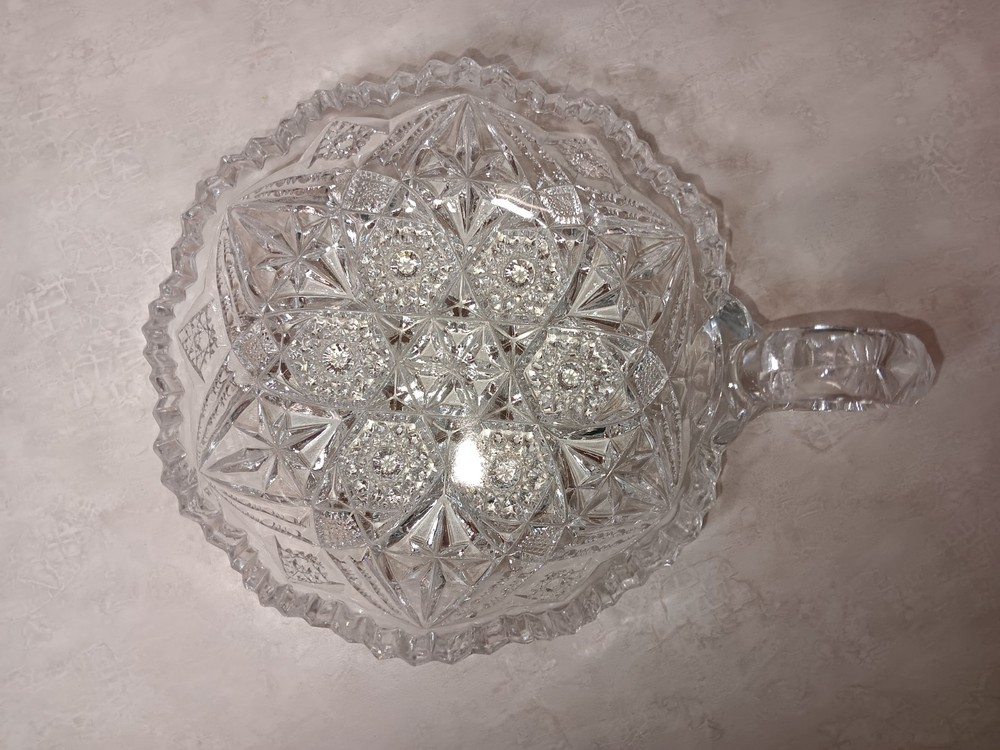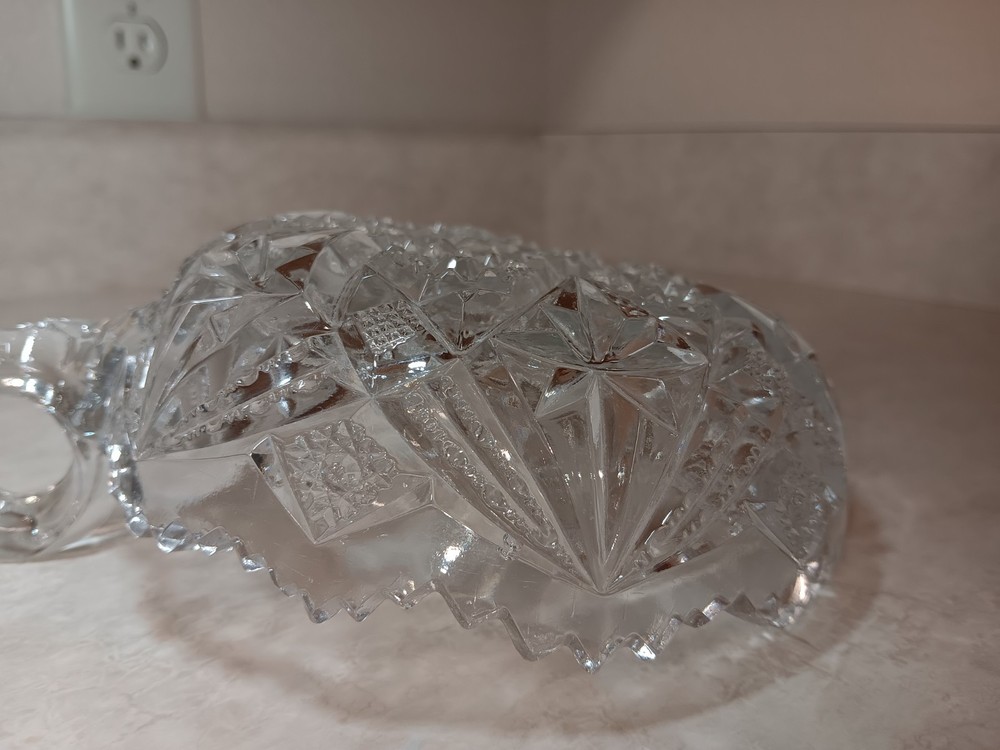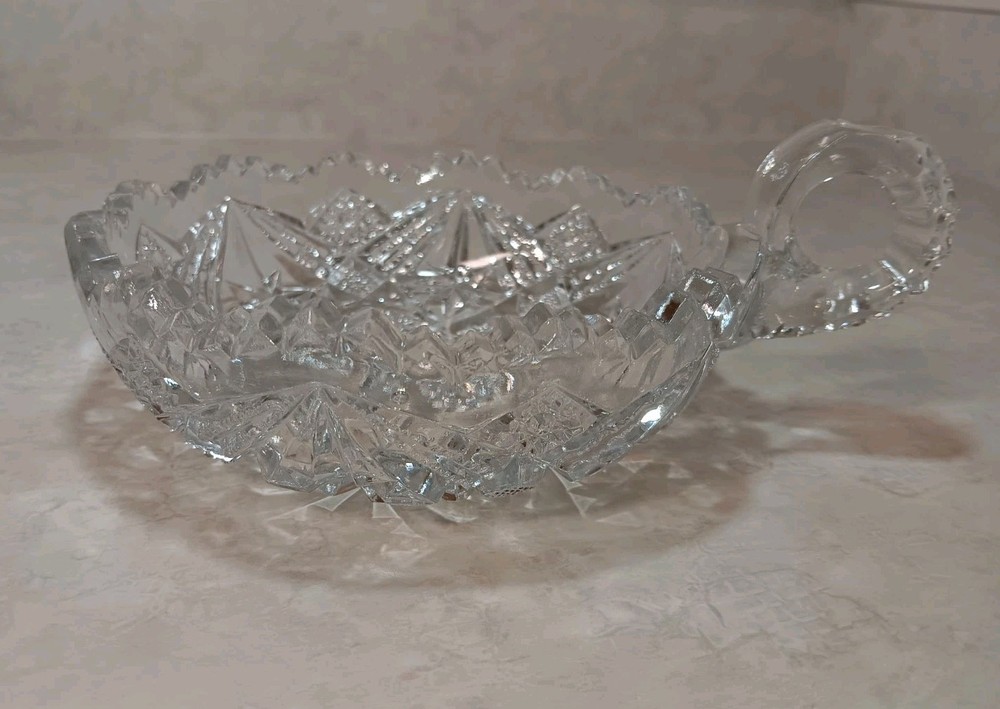 CHIPPED--Please view photos to see the chips present. Lovely design cut into this glass nappy. Approx Dimension Height: 2" w/ handle it is 2.75" Length from Handle: 7" Diameter: 5.5"