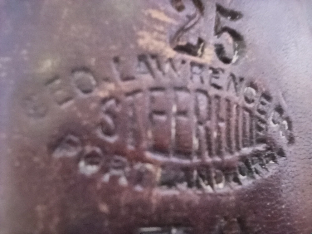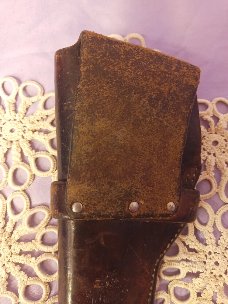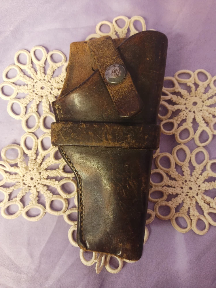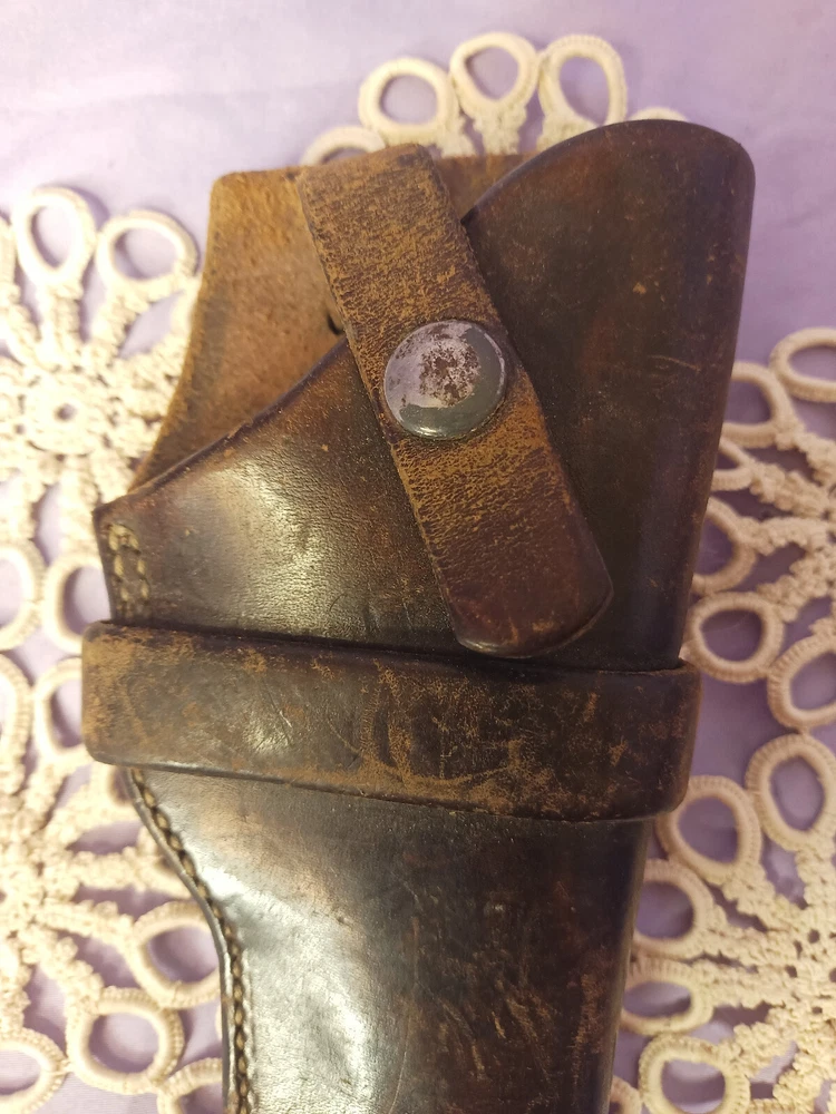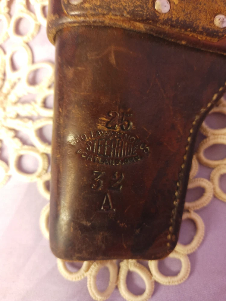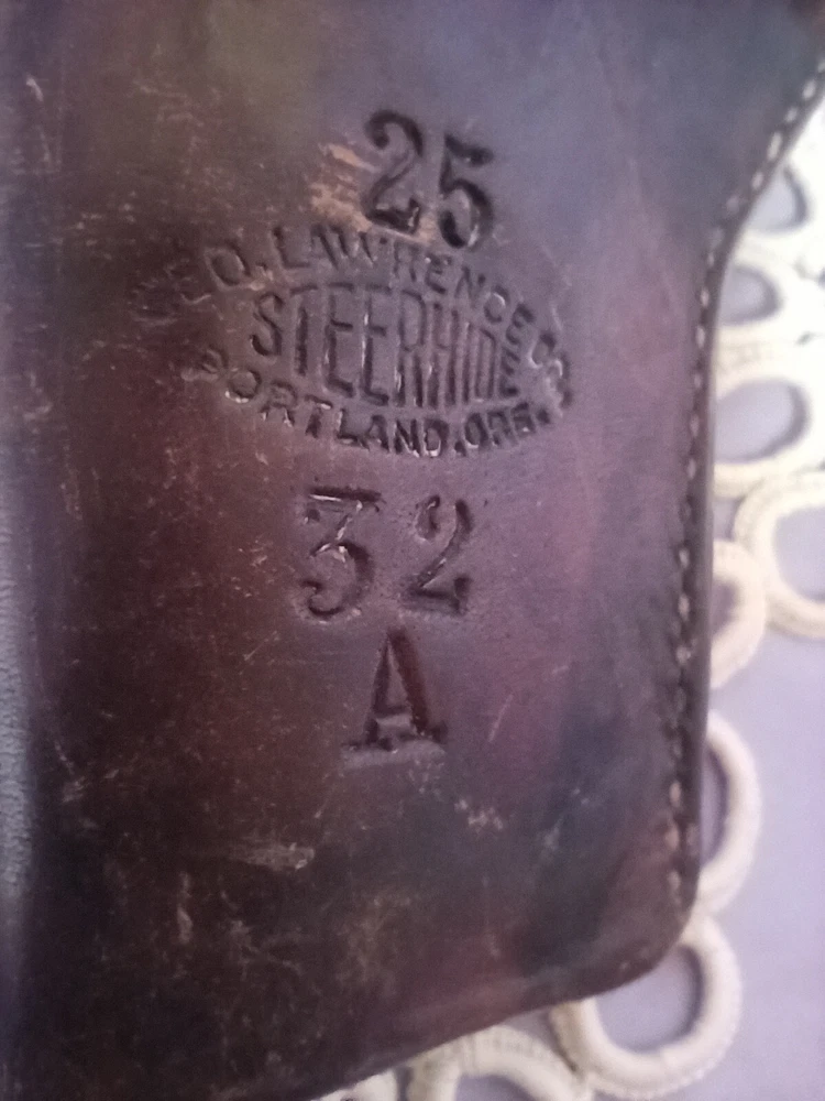 This is a vintage holster, made by George Lawrence. The dark brown leather steerhide material gives it a classic look. This holster is perfect for anyone looking for a high-quality, reliable option for their gun. Whether you're a collector or an active shooter, this holster is sure to impress. Condition is worn but solid.