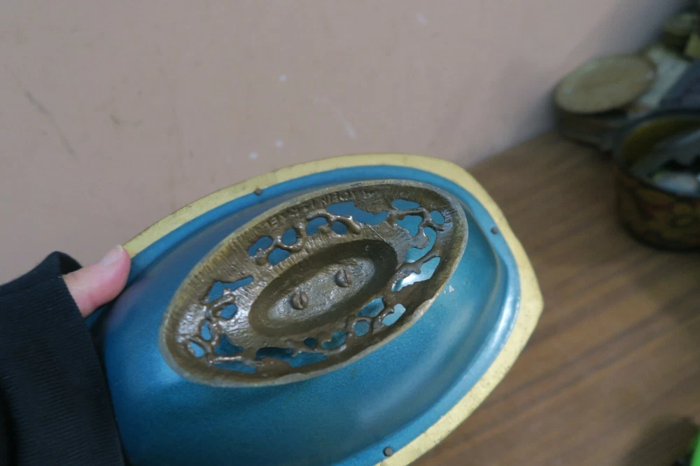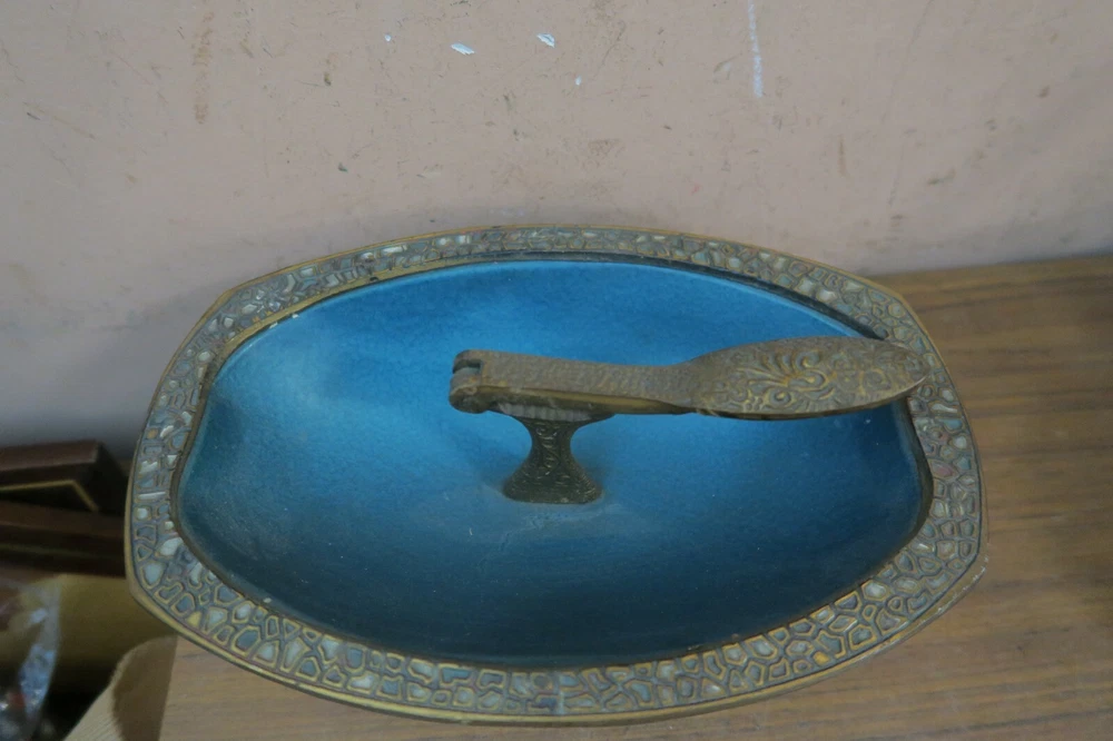 Beautiful Large Enameled Brass Nut Cracker Bowl in very good condition with normal use marks measures 10" x 6.5" and 3.5" High