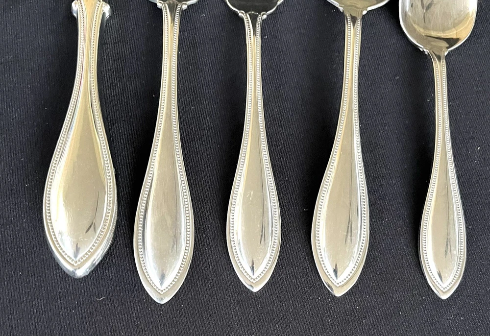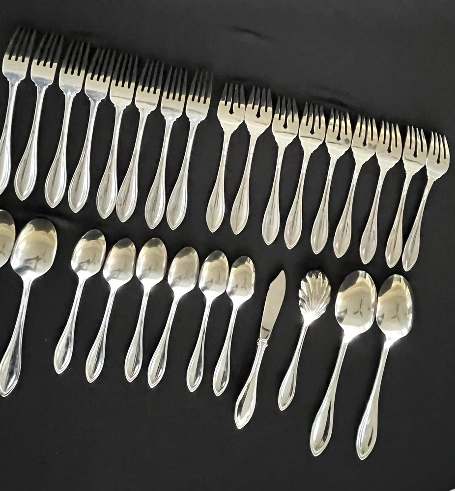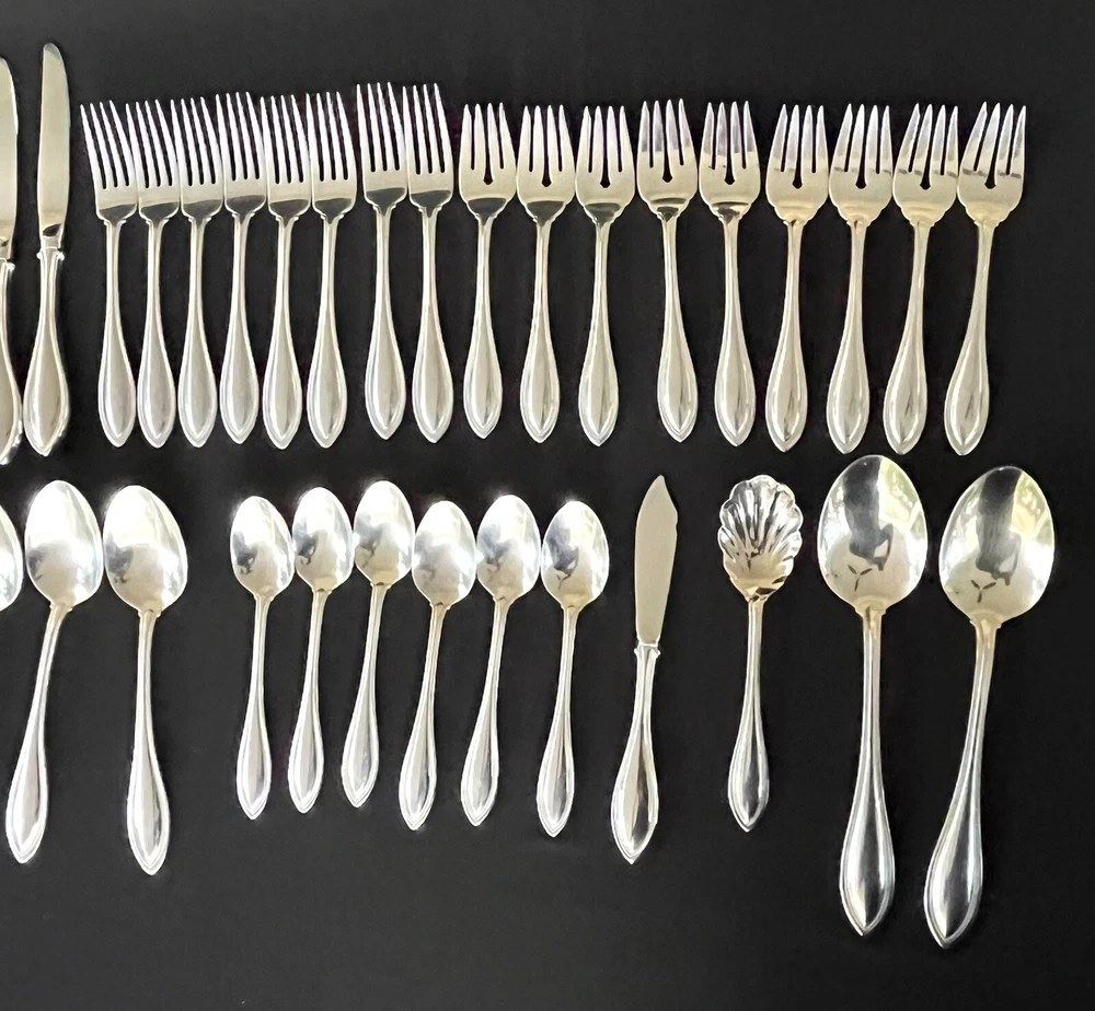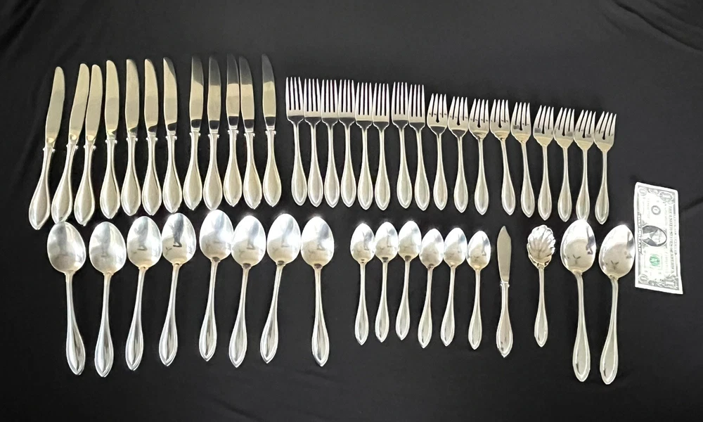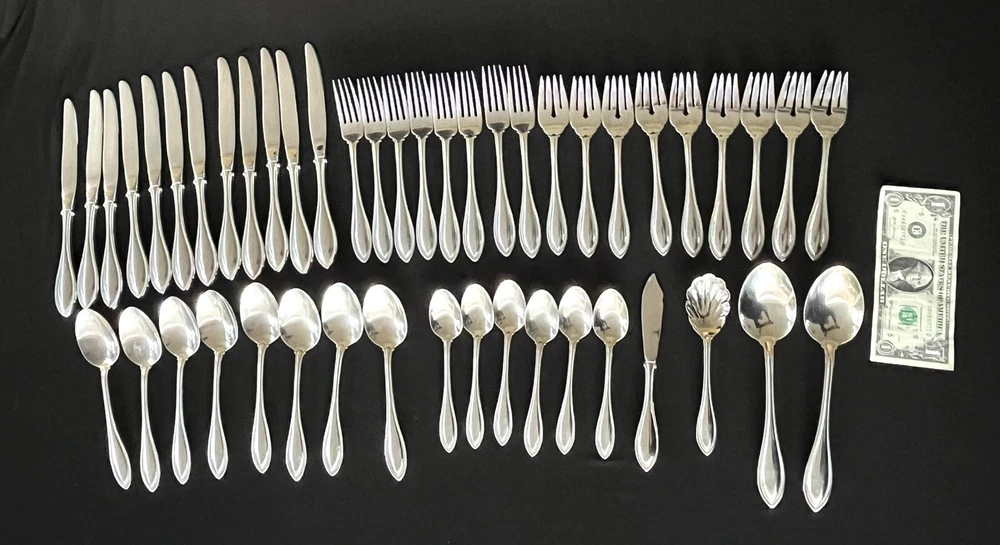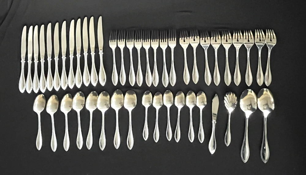 This listing is for 47 pieces Oneida "ARbor-American Harmony" design stainless steel flatware lot. These are in contemporary style with beaded glossy design and made in the U.S.A. in the 1990's. Markings are "STAINLESS BY ONEIDA ", "ONEIDA USA" or "ONEIDA" on the back side, knives have no marking. • Dinner Knife - 12 • Dinner Fork - 8 • Salad Fork - 9 • Table Spoon - 8 • Tea Spoon - 6 • Sugar/Jam Scallop Spoon - 1 • Butter Knife - 1 • Serving Spoon - 1 Total: 47 pieces The weight for this lot is 5 lbs 8 oz. These are in silver-tone stainless steel flatware. Any color or gold tone is just light reflection. These are previously owned condition as shown. A $1 bill is placed for size reference and not included. I do not wish to take return, so please review photos and ask all the necessary questions before purchasing this item. * * * Non-smoking environment! * * *
