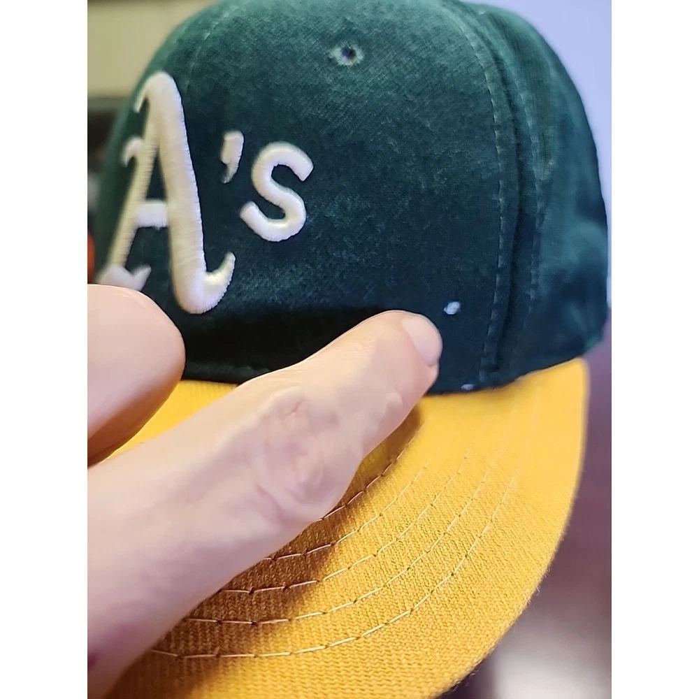 Show your team spirit with this vintage Oakland A's baseball cap in green and yellow. Ideal for fans and collectors alike. • Green cap with yellow brim • Embroidered A's logo on front • Adjustable fit • Vintage design Minor wear and small holes on the back and side.
