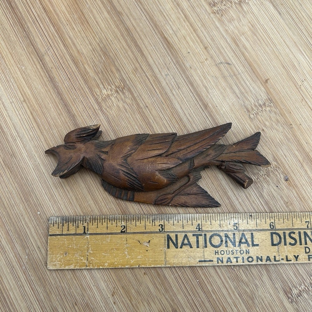 The product is a vintage German Black Forest Cuckoo Clock with intricate carvings and a 6" trim featuring a bird design. The clock is in a multicolor scheme, adding a unique and decorative touch to any space. This collectible piece would make a charming addition to any clock or decorative item collection, showcasing traditional German craftsmanship and design.