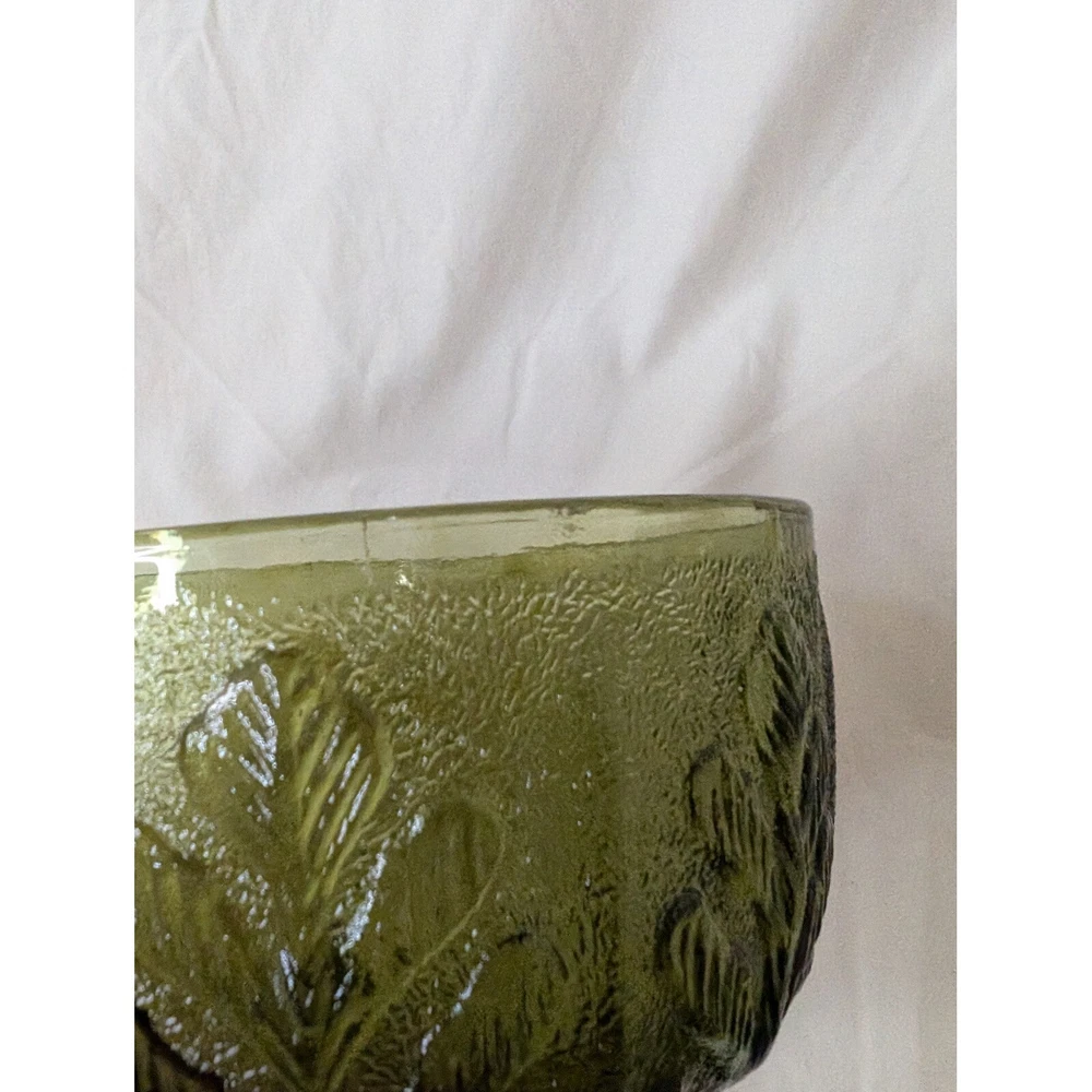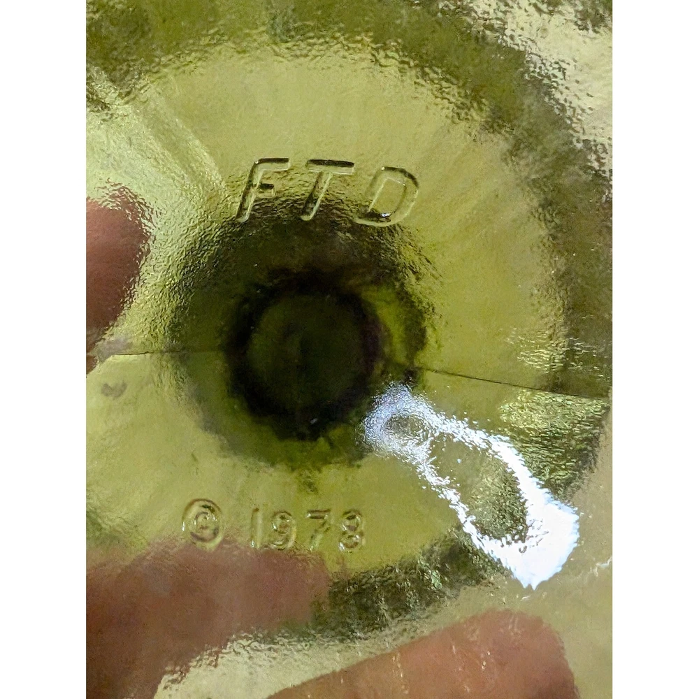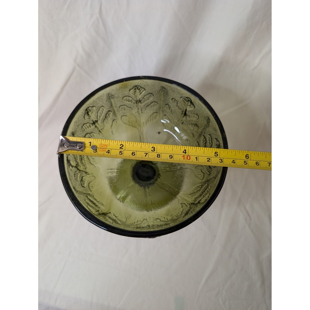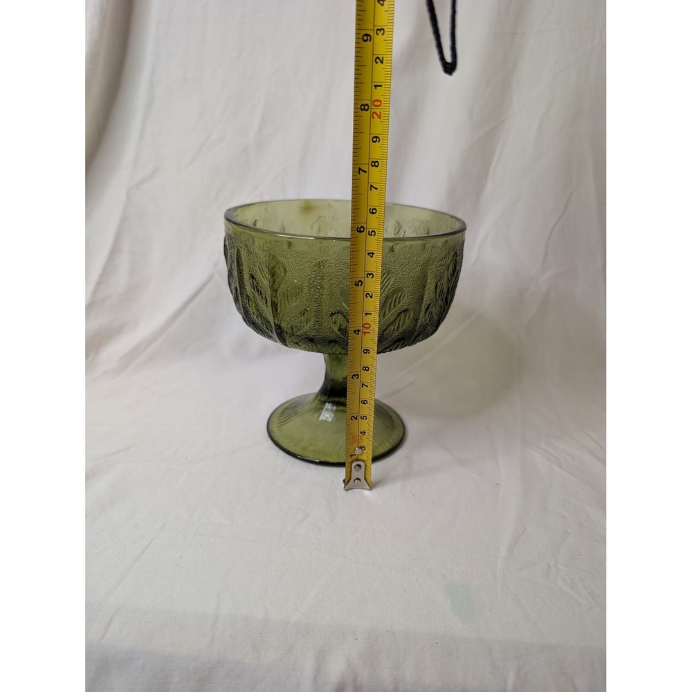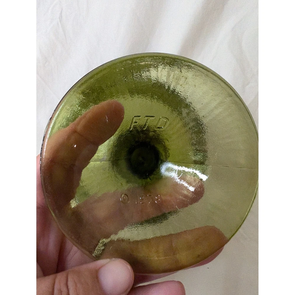 Evoke a sense of vintage charm with this FTD olive green glass compote bowl. The footed design and delicate floral pattern add a touch of elegance to any table setting. This versatile piece is perfect for serving desserts, displaying decorative items, or simply adding a pop of color to your home decor. Imagine it filled with fresh fruit at a brunch gathering, this piece has a slight service scratch that I tried my best to capture in a photo showcasing potpourri on a vanity, or holding candies during the holidays. Material: Glass Type: Dessert Bowl Color: Green Pattern: Floral Keywords: FTD, compote bowl, olive green, glass bowl, vintage bowl, footed bowl, dessert dish, floral design, table decor, home decor, vintage glass, decorative bowl, centerpiece