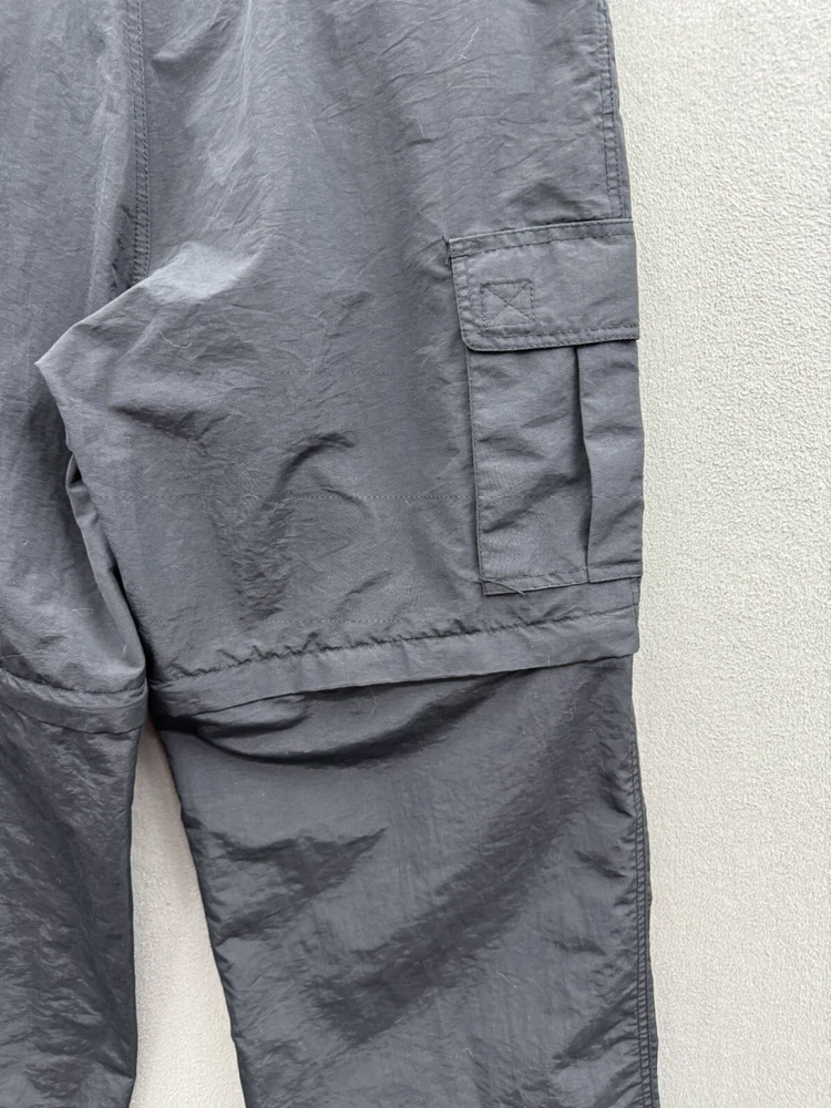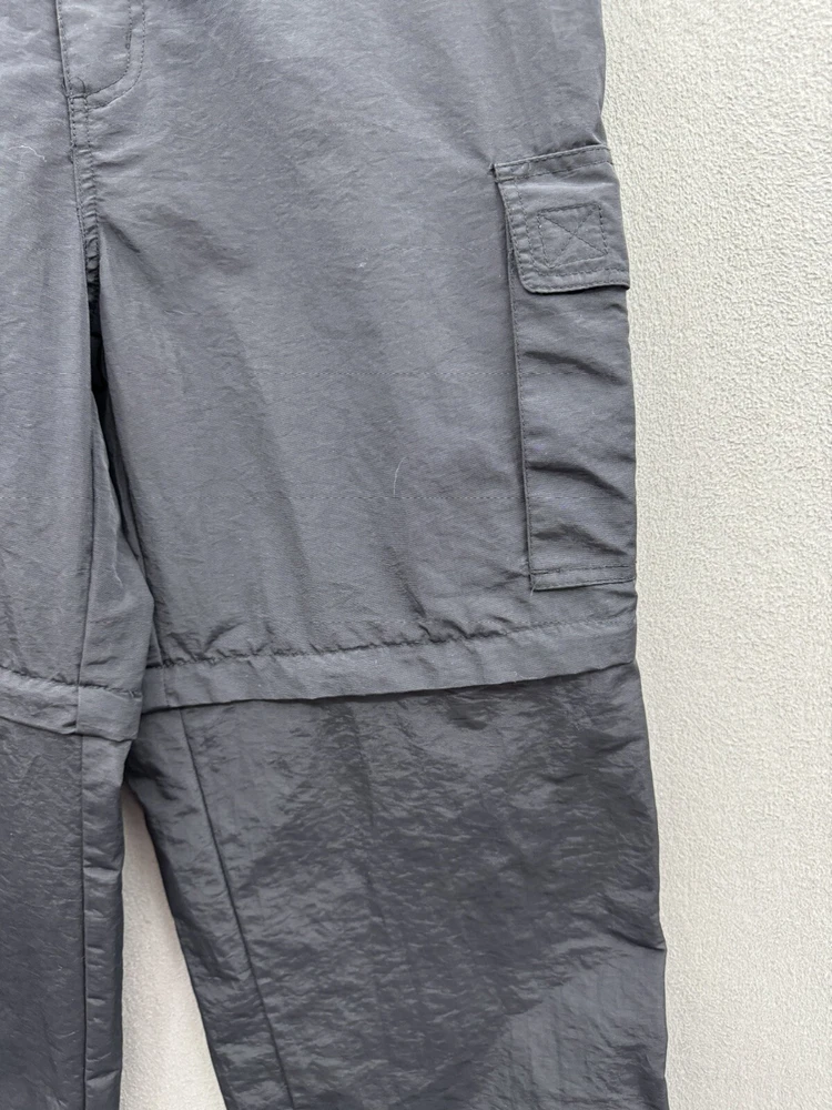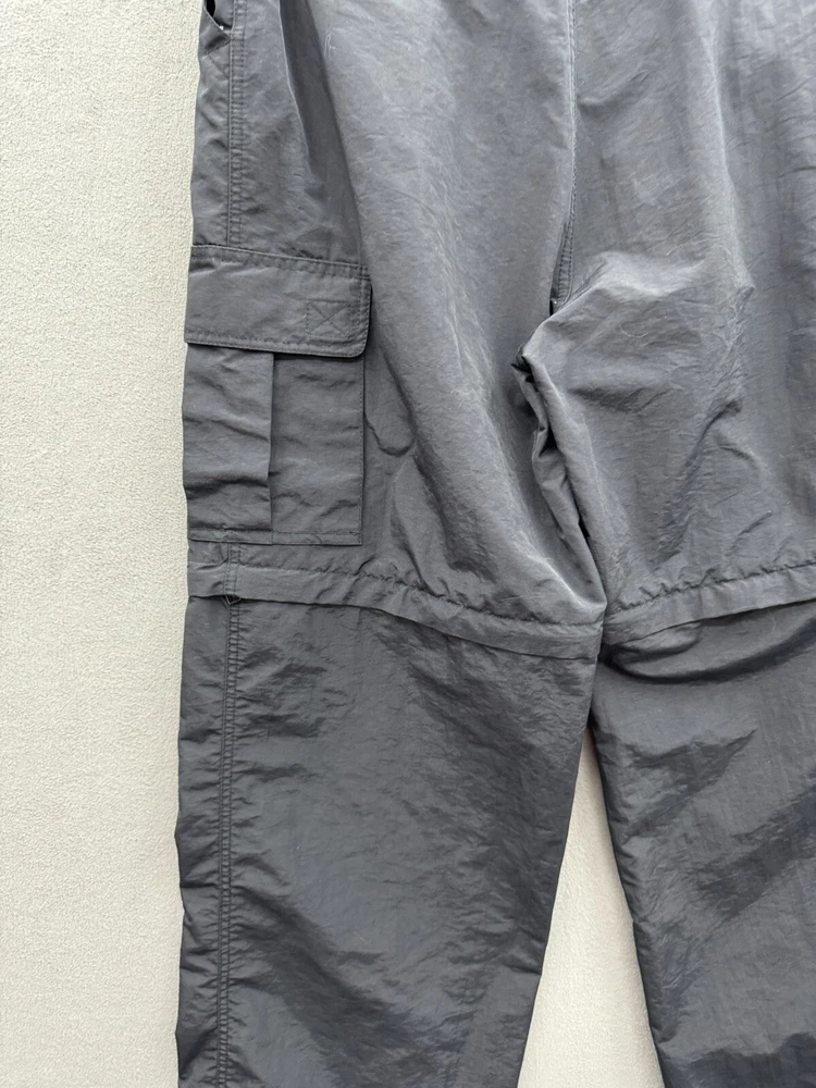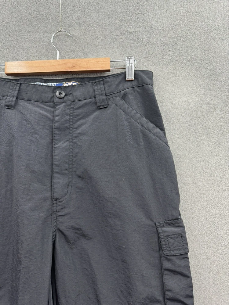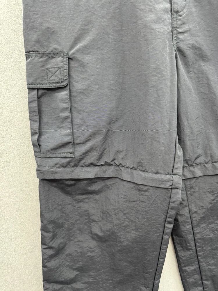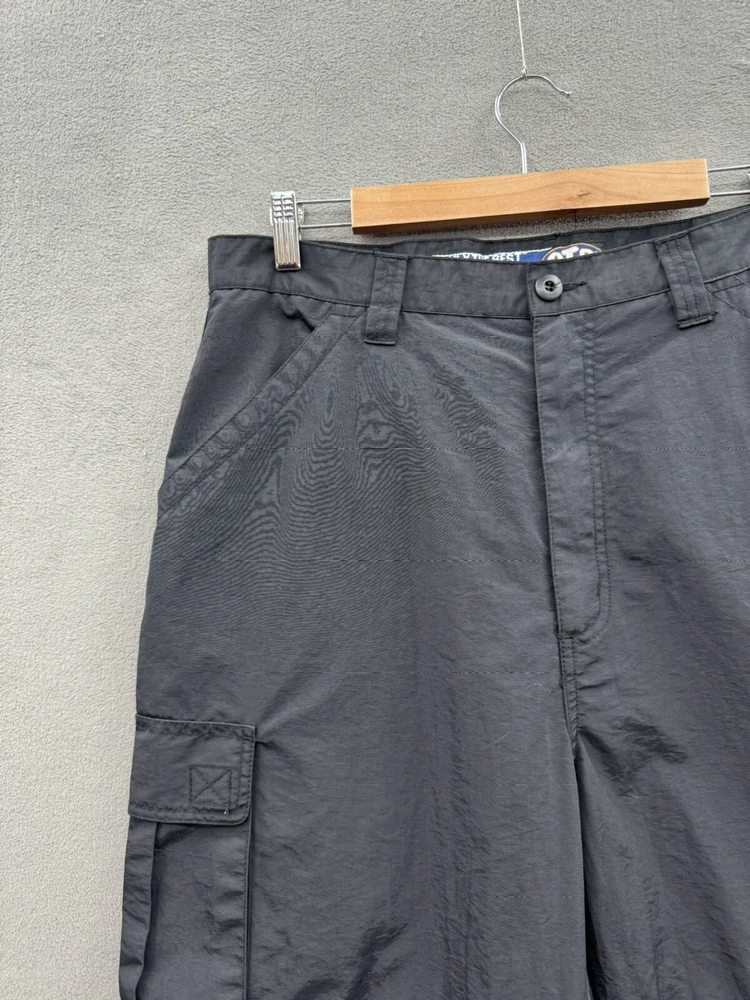 Elevate your casual style with these On The Brink cargo pants. The black nylon material gives a grungey outdoor vibe, perfect for skaters and outdoor enthusiasts. The pants feature a solid pattern, high-rise waist, and wide-leg fit with a relaxed closure for easy wear. These versatile pants have a cargo pocket for added convenience and come in a size 33 waist and 32 inseam. The flat front and convertible features make them suitable for all seasons, whether it's winter, summer, fall, or spring. Machine washable for easy care, these pants are a must-have for any casual wardrobe.