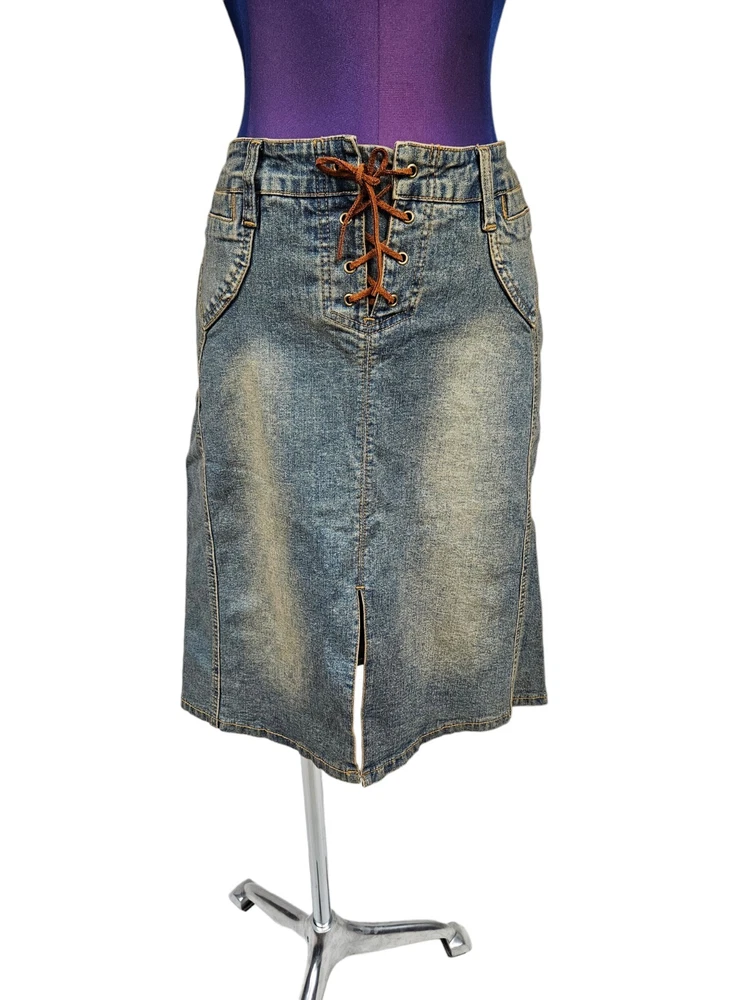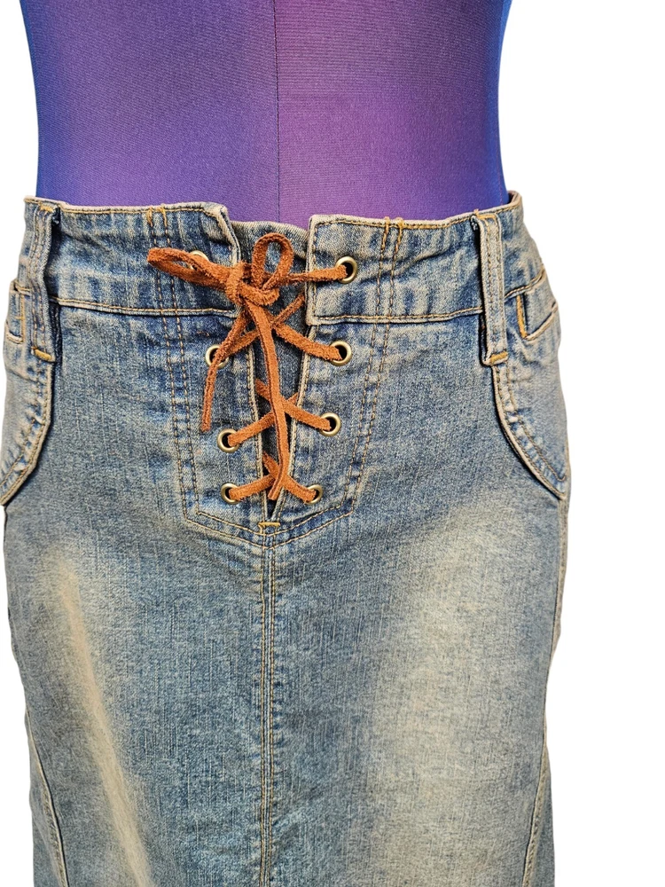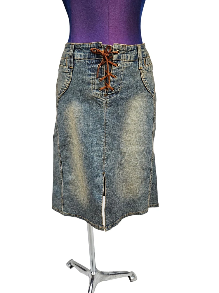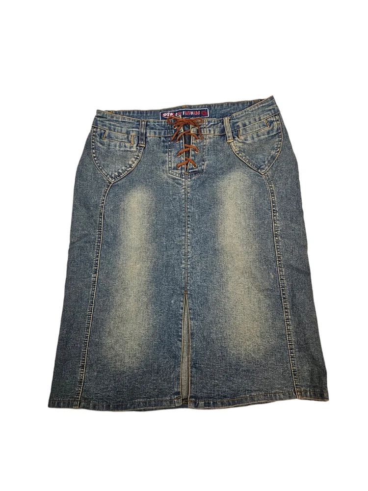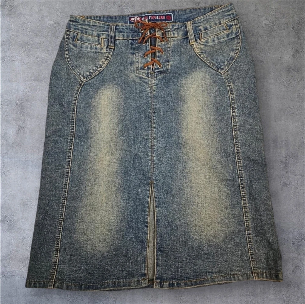 Vintage One Tuff Babe Y2K Corset Lace Up Front Slit Jean Midi Skirt Size 5/6 H39 In excellent condition Vintage One Tuff Babe Y2K Corset Lace Up Front Slit Jean Midi Skirt Size 5/6 Juniors Features 90s Y2K style vintage OTB One Tuff Babe faded medium wash denim jean skirt, corset lace up closure, mid rise, 2 small coin pockets, front slit, stretch, exposed seams, 90s vibes. Measurements laying flat waist 14" hips 18" length 21.5" Fabric cotton, spandex This is a pre-owned item that may show signs of wear. In excellent condition, no flaws.