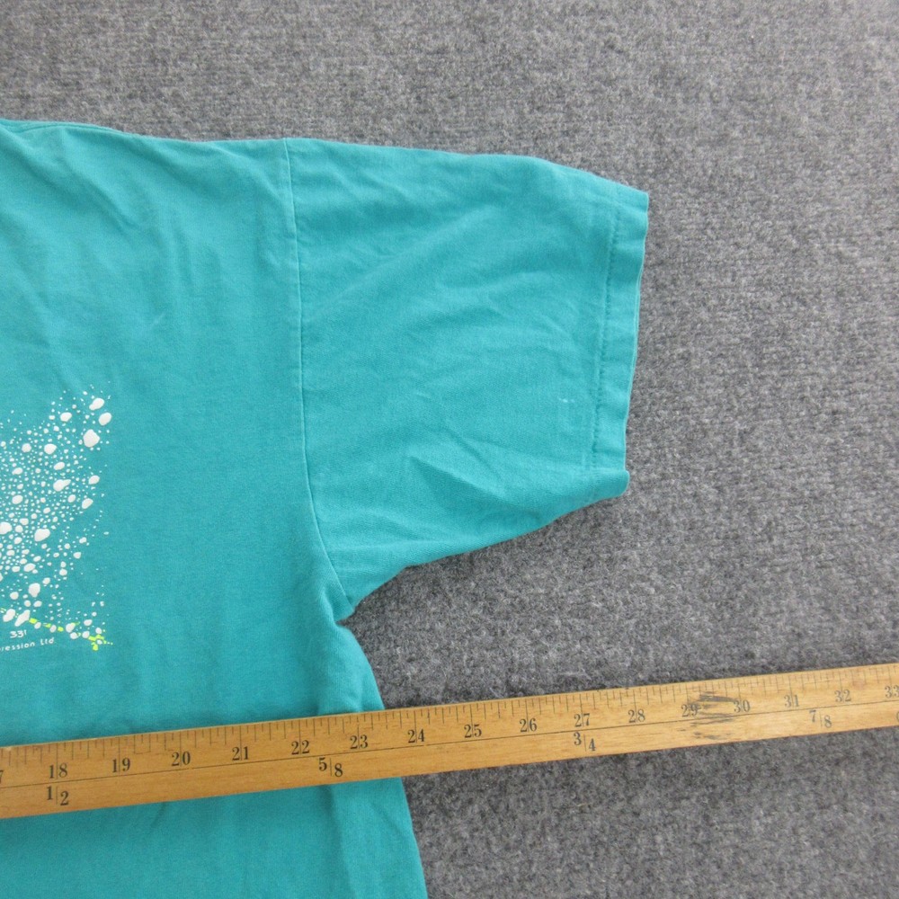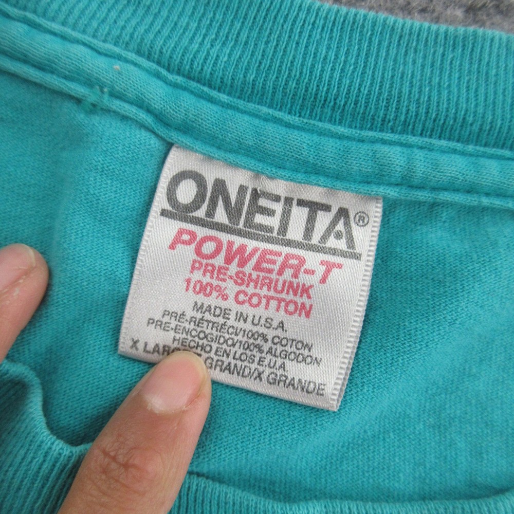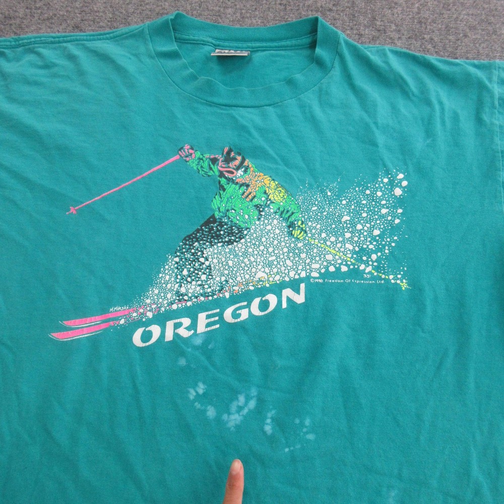 Brand: Oneita Power-T Style: Vintage short-sleeve crewneck Oregon downhill snow skiing graphic shirt in teal. Color: Teal with multicolor skier and white "OREGON" text on front. Size on tag: X Large (generally fits like a Mens XL). Material: 100% cotton, pre-shrunk; Made in U.S.A. (per tag). Front graphic features a neon skier kicking up snow with bold Oregon text; back is solid teal with no print. Artwork includes a 1990 copyright date from Freedom of Expression Ltd near the front graphic. Nice piece for vintage ski, Oregon, or 1990s souvenir T-shirt collectors.