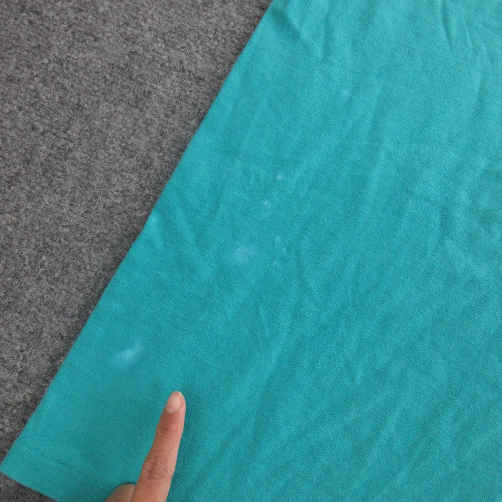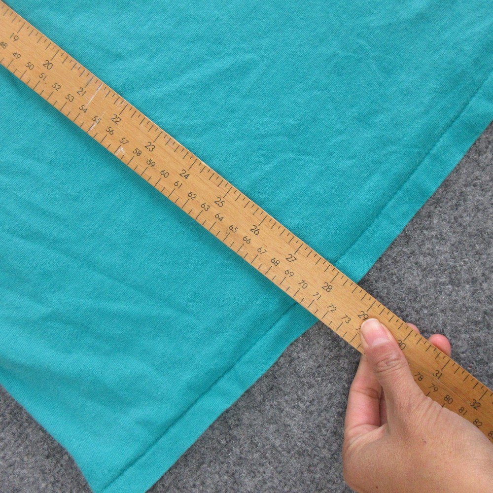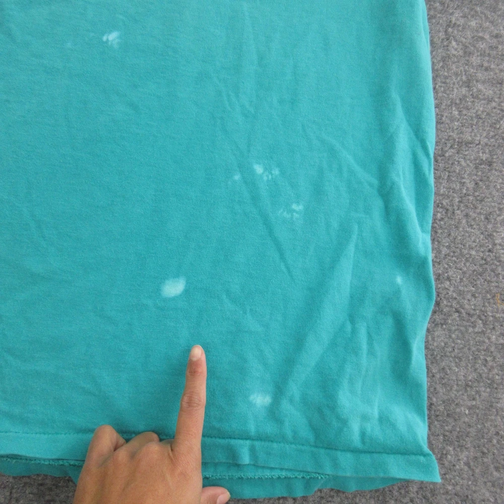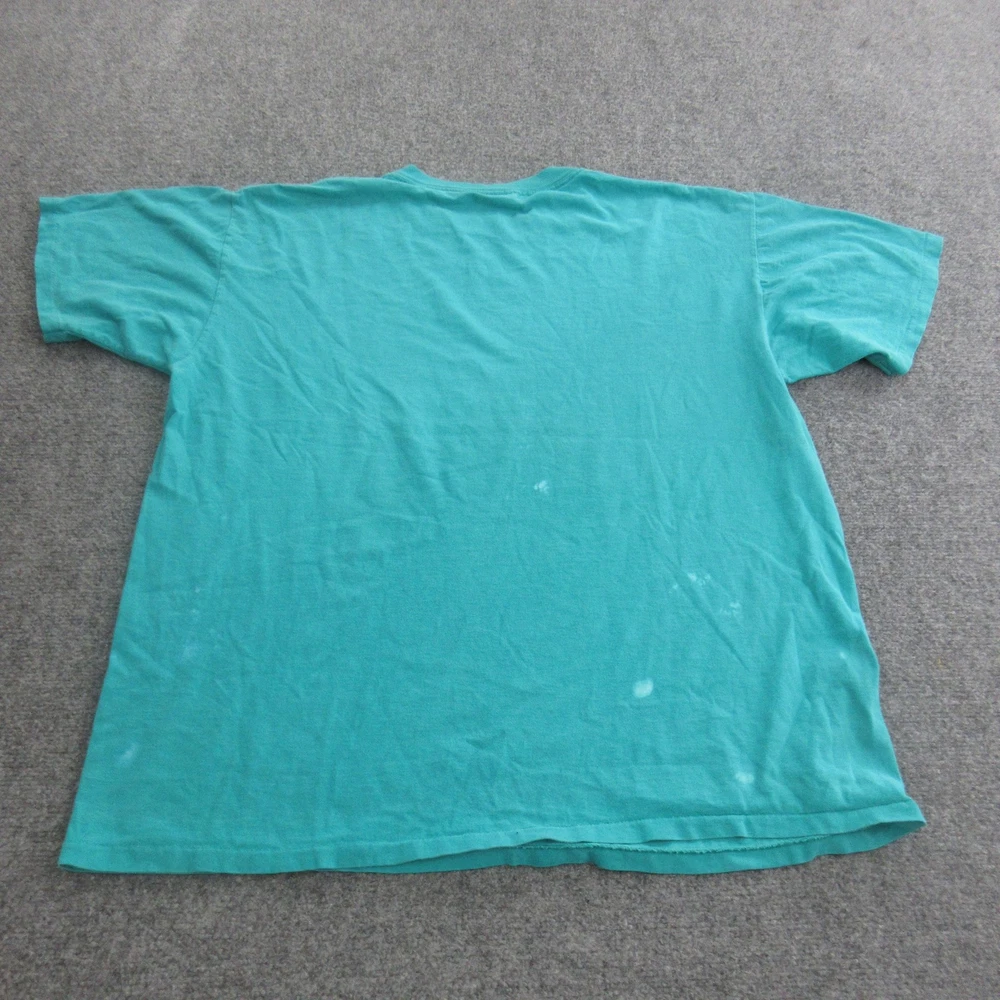 Brand: Oneita Power-T Style: Vintage short-sleeve crewneck Oregon downhill snow skiing graphic shirt in teal. Color: Teal with multicolor skier and white "OREGON" text on front. Size on tag: X Large (generally fits like a Mens XL). Material: 100% cotton, pre-shrunk; Made in U.S.A. (per tag). Front graphic features a neon skier kicking up snow with bold Oregon text; back is solid teal with no print. Artwork includes a 1990 copyright date from Freedom of Expression Ltd near the front graphic. Nice piece for vintage ski, Oregon, or 1990s souvenir T-shirt collectors.