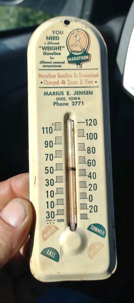 Vintage Original Marathon Gasoline Thermometer. Measures approximately 2" x 6". Condition is used with some wear as seen in the pictures. The thermometer works, but unsure if it keeps accurate temperature. Pictures are part of the description. Thanks for looking.