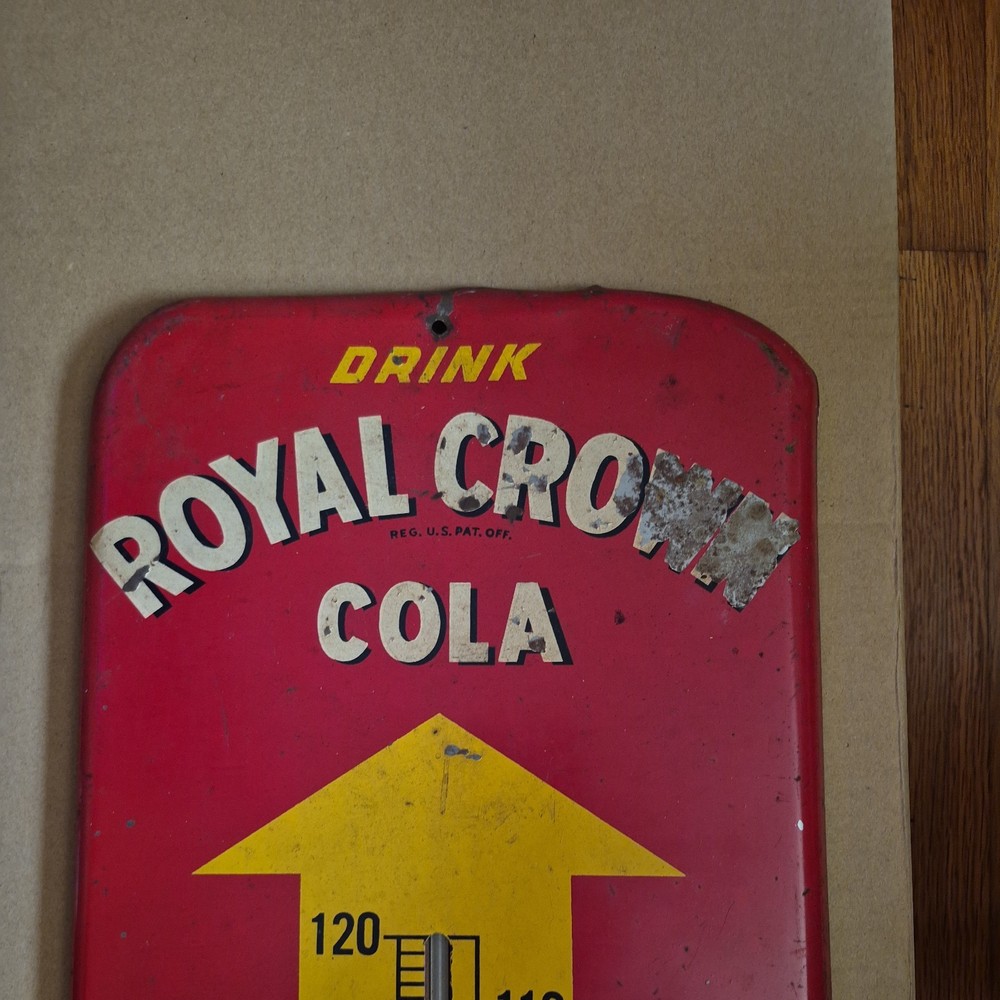 The Vintage Original Royal Crown Cola Thermometer Sign is a unique collectible advertising piece from 1954, featuring the iconic Royal Crown Cola brand in a multi-color design. This original sign showcases a vintage patina, adding to its charm and authenticity. Made in the United States, this sign is a nostalgic piece of soda memorabilia that would make a great addition to any collection or vintage decor.