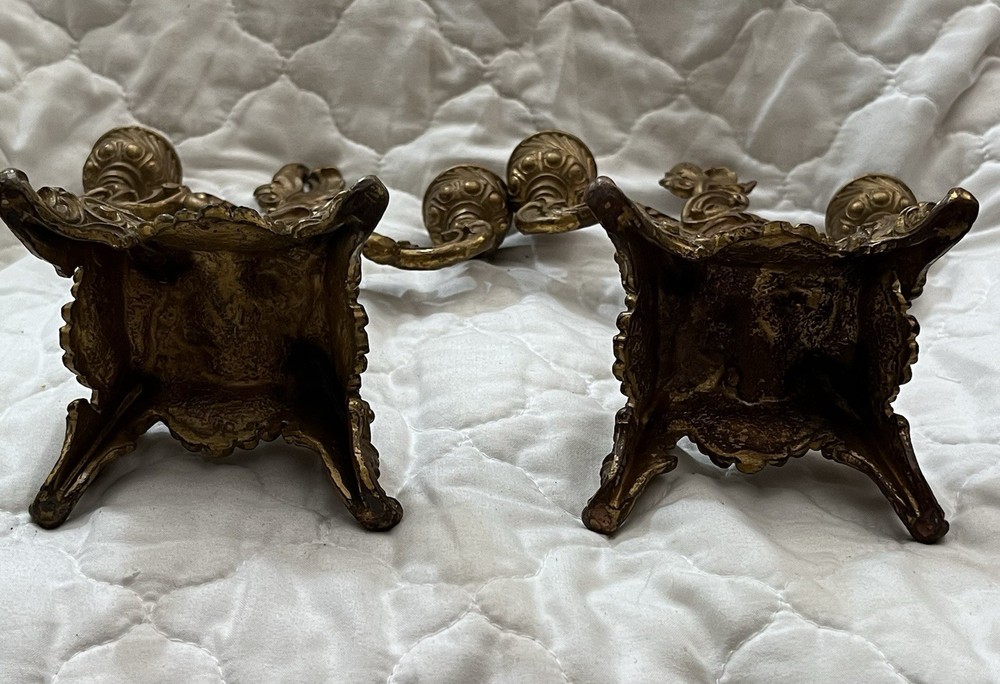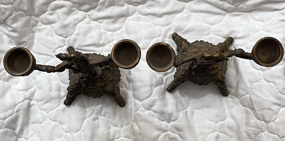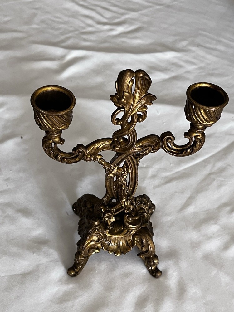 This vintage pair of ornate brass candelabra candle holders features a Baroque/Rococo style with an asymmetrical shape and scroll pattern. The antique brass finish adds a touch of elegance, making them suitable for all occasions and perfect for adding a touch of design to any living or dining room. These candle holders are unboxed and easy to clean with a damp cloth, making them a practical and stylish addition to any collection of decorative collectibles. Size 8 x 6 x 3 1/2 inches.