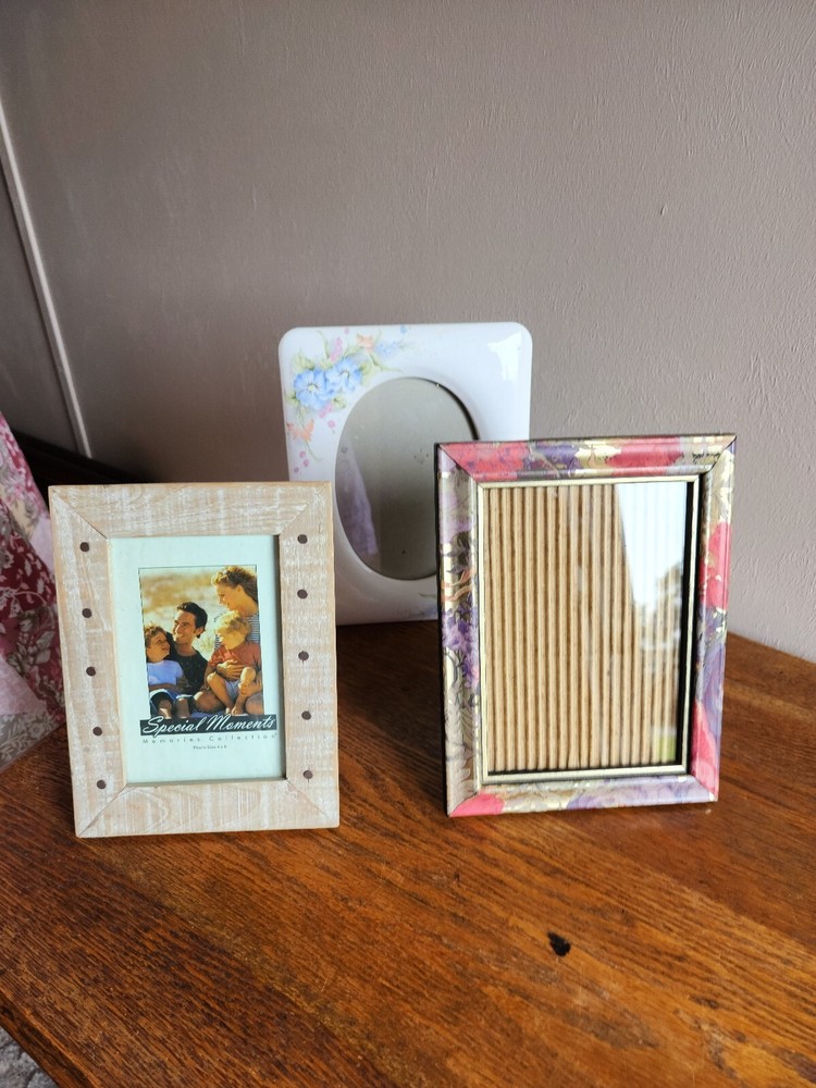 Lot of 3 Vintage Ornate Floral Table Top Picture Frames Art Gallery Shabby Chic. frame size photo size The ceramic frame has grazing . Please look at all 9 x 7 in 6.5 x 4.5 in Pictures. 8.75 x 6.75 in 7 x 5 in 8 x 6 in 6 x 4 in