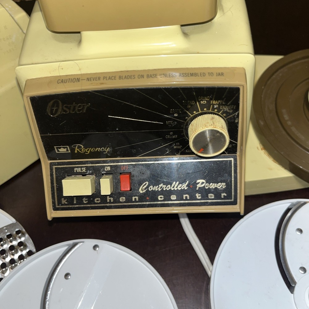 The Vintage Oster Kitchen Center is a versatile food processor with a wide range of capabilities including blending, slicing, beating, grating, and salad functions. This electric appliance, with a beige color and 10 different speeds, was manufactured in the United States by the trusted brand Oster. With 13 included components such as blades, slicers, a measuring cup, mixer,m, chopper, base, and grinder, this kitchen center offers convenience and efficiency for all your kitchen needs. The 450W power source and variable speed control make it a reliable choice for home cooking.