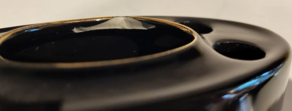 This is a vintage Otagiri bathroom accessory set made in Japan. The set includes a tumbler, toothbrush holder, and soap dish, all in black with a blue Iris pattern. The pieces are made of porcelain and are in great shape. The only flaw is a chip on the inside rim of the toothbrush holder. No other issues. See pics for full condition details including measurements and let me know if you have any questions. Thank you!