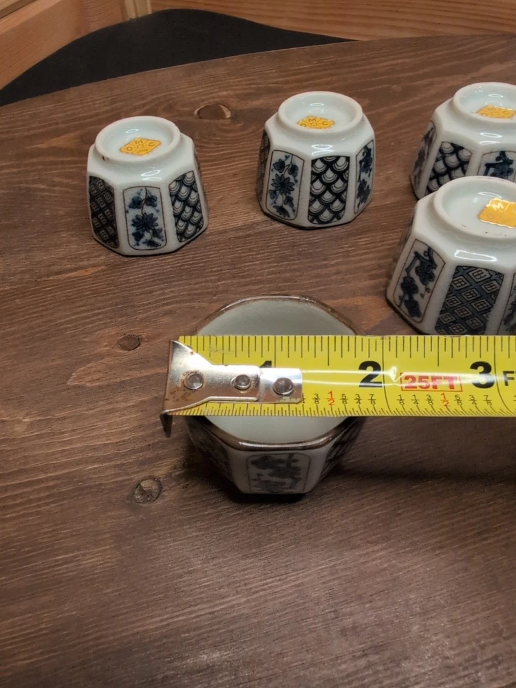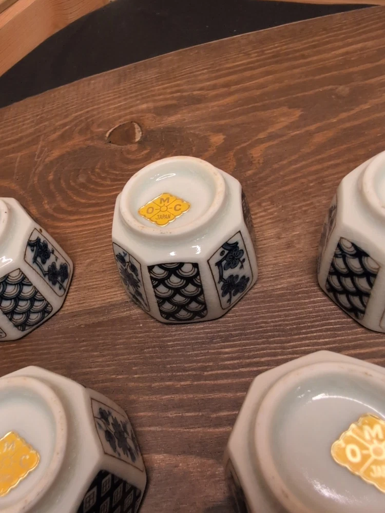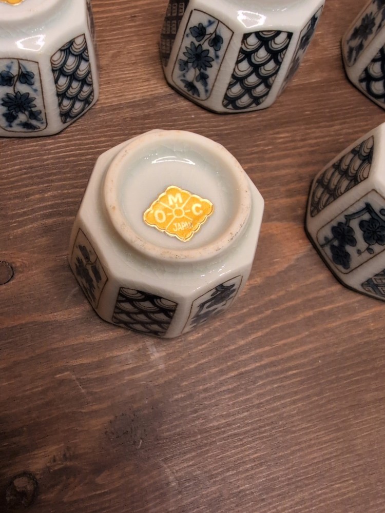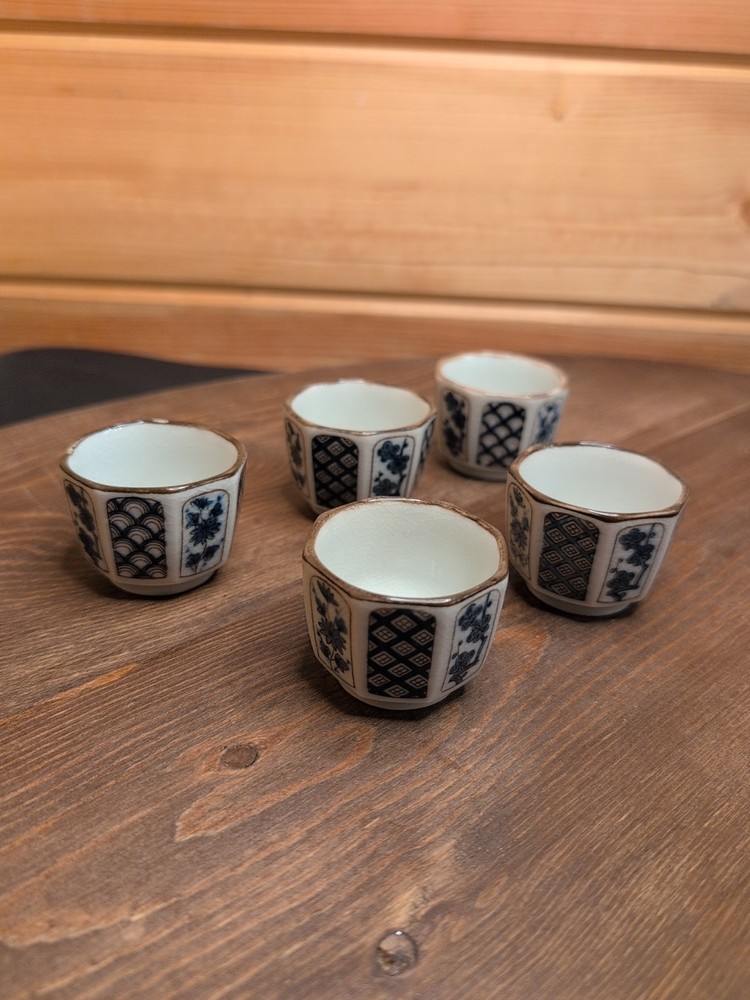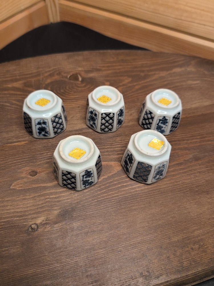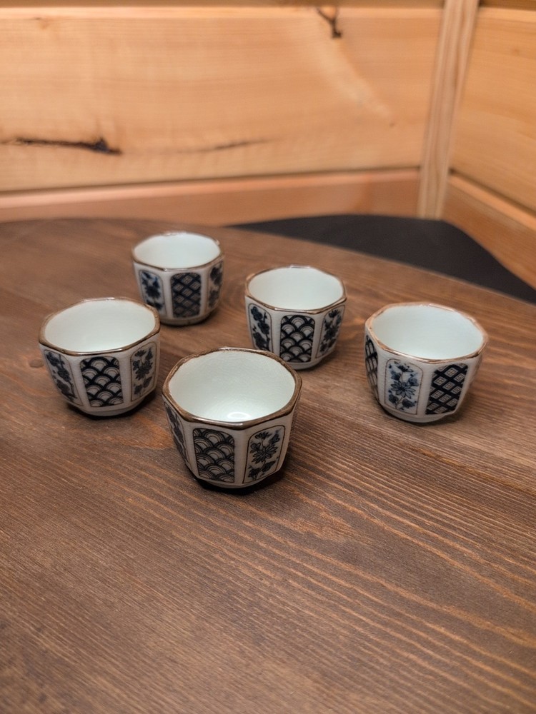 Vintage Otagiri Sake Cup Set 5 Pc Blue White Flower Japan 60s Marked OMC