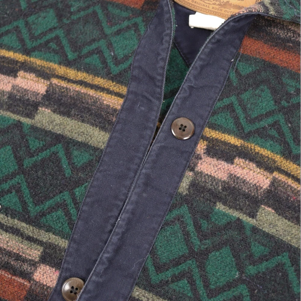 This vintage vest from Outback Trading Company is a must-have for any fashion-conscious man. With a spread collar and button closure, it's perfect for both casual and workwear occasions. The vest is made from a lightweight and breathable triblend fabric with a geometric pattern in multicolor, making it a great addition to any wardrobe. Featuring a mid-length jacket/coat style, this vest has a regular fit and is available in size 2XL. The lining material is polyester, and the insulation material is wool. The vest is machine washable and suitable for winter, fall, and spring seasons. This Outback Trading Company vest is a great choice for those who want to go for a Western, Aztec, cowboy, or outdoor theme. Tag Size: N/A Best Fit: * Men: 2XL Approximate Flat Measurements: * Chest: 27” * Length: 30” * Material: 70% Cotton 30% Wool Condition: Missing three buttons All items are second hand, many being vintage and may have small imperfections. Anything major is noted.