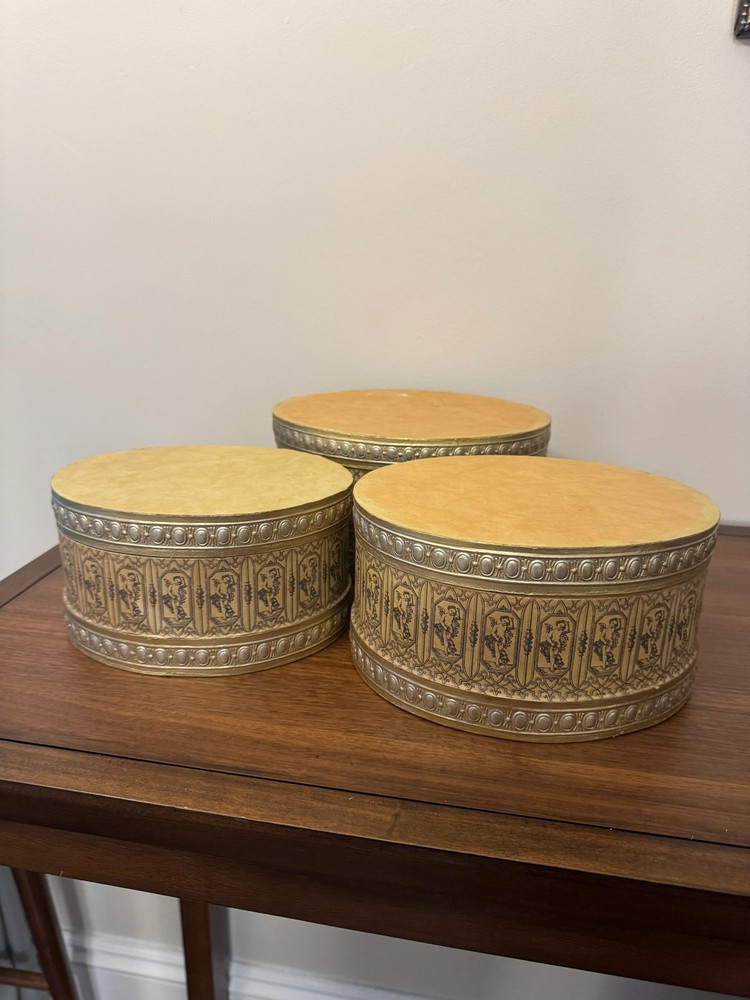 CONDITION: They are pre-owned but in good condition. It is slightly yellowish, but this could be due to age. So far, there have been no breaks or significant scratches. See attached photos Color: Beige, old gold tone, gray Style: Vintage Materials: Carboard Measurements: 9.1 in W, 8.5 in W, and 7.6 in W, approximately "All our items are sold as is." We are committed to providing you with the best customer experience and affordable prices. Thank you for supporting our small business and contributing to a better and cleaner world.