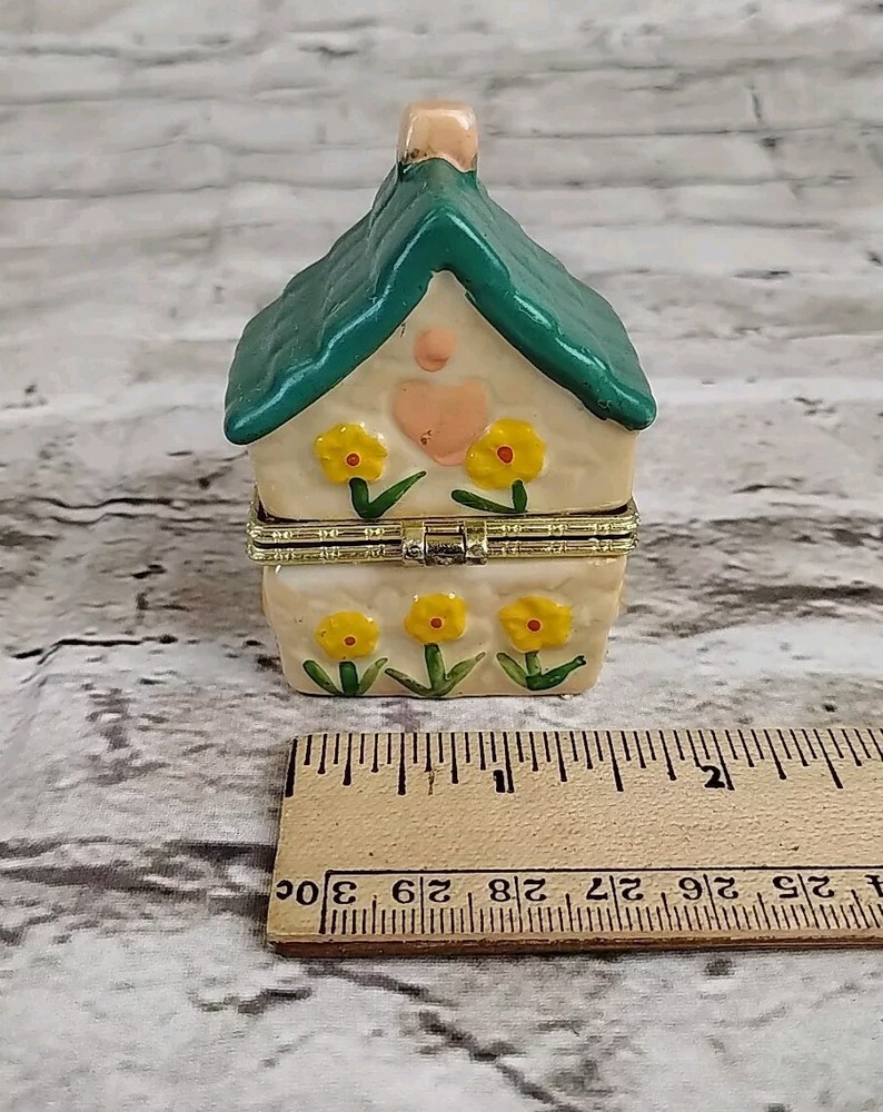 Adorable small hand painted heart shaped trinket box is as described, has pink roses and brass trim; is used but is in great condition, a great addition to Valentine collection; was reasonably priced, packed well and shipped quickly. Would buy from this seller again. Thank you.