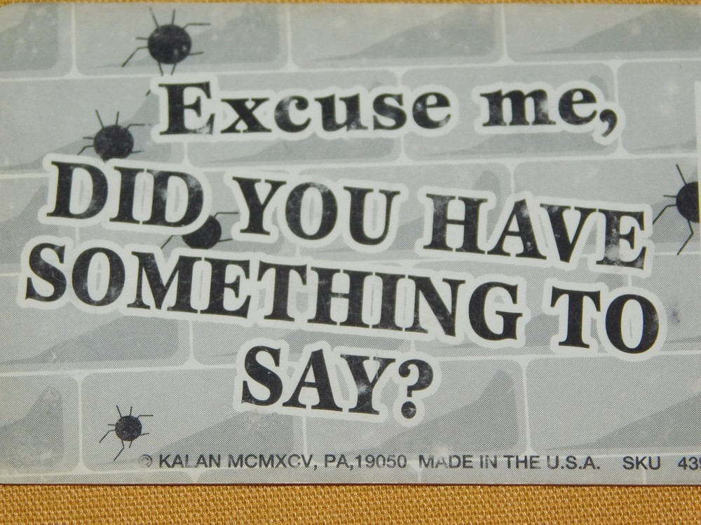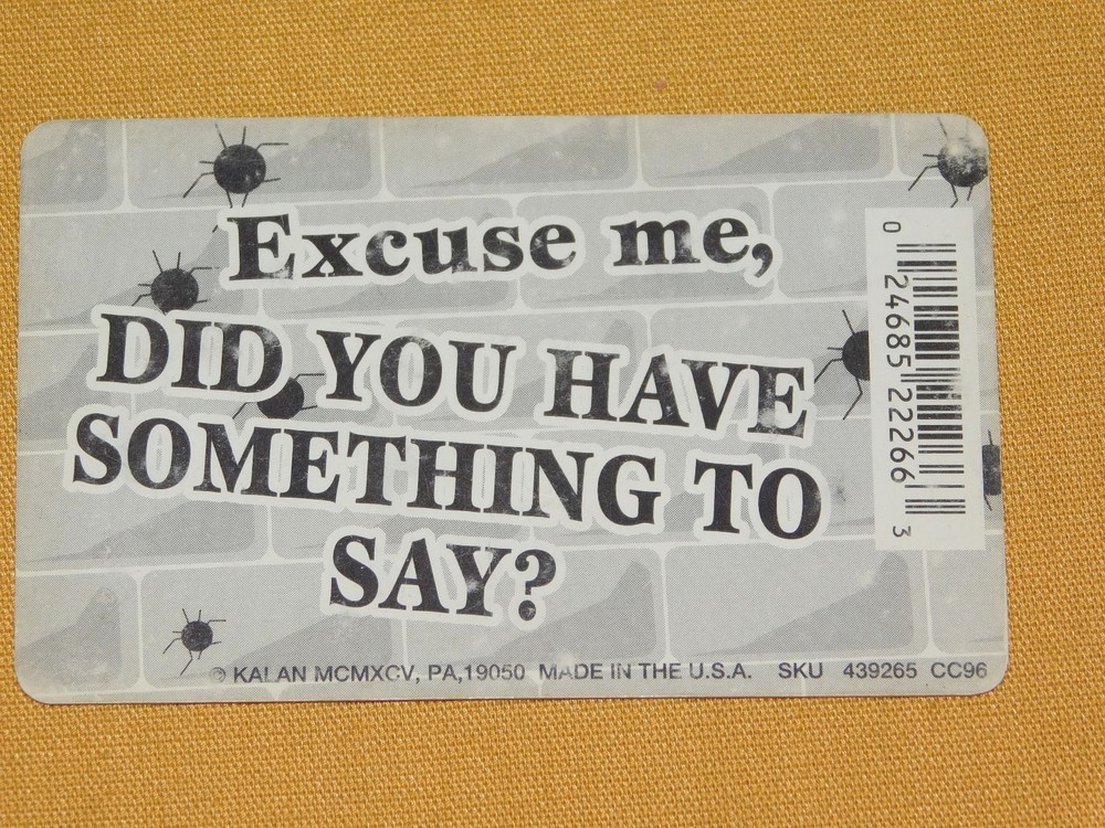 YOU ARE BIDDING ON...... . . VINTAGE NOVELTY GAG GIFT COOL STUFF I HAVE P.M.S. AND A GUN EXCUSE ME CARD ... .. ..PLASTIC.... MEASURES APPROX 3 3/8" X 2 1/8"........ SHOWS SOME HANDLING/ AGE WEAR..........PLEASE VIEW PHOTOS FOR CONDITION.***PLEASE E-MAIL IF YOU HAVE A QUESTION OR WANT AN ADDITIONAL PICTURE....PLEASE VISIT MY EBAY STORE FOR ADDITIONAL VINTAGE ITEMS..THANK YOU*** 12P-8765-XXXX