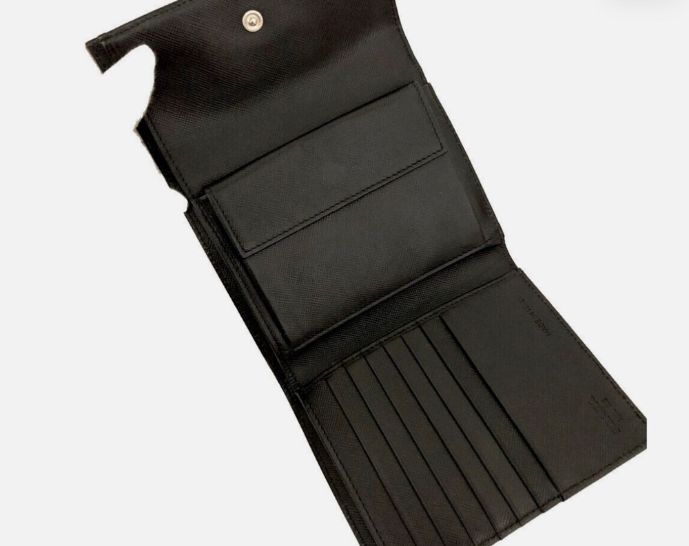 The Vintage PRADA Logo Plate Nylon Trifold Wallet in Black is a stylish accessory designed for women. Made of high-quality nylon material, this wallet features the iconic PRADA logo plate for a touch of luxury. With a trifold design, it provides practicality and organization for storing cards, cash, and other essentials. Perfect for adding a sophisticated touch to any outfit, this wallet is a timeless piece