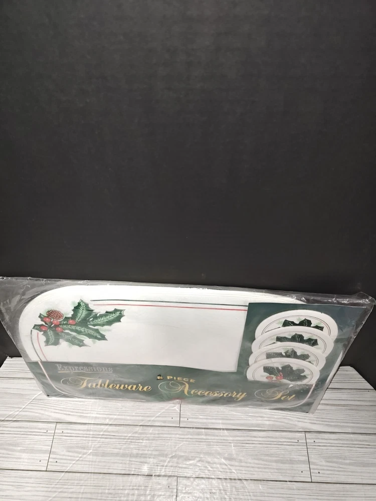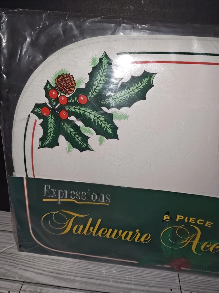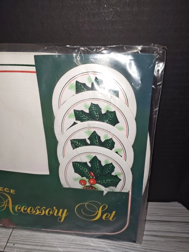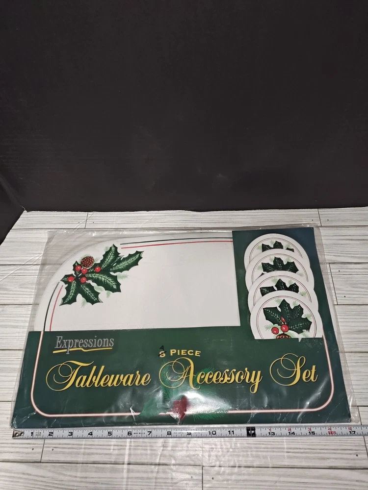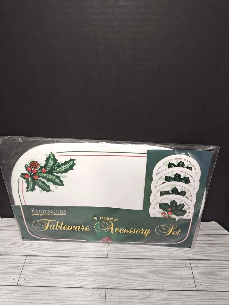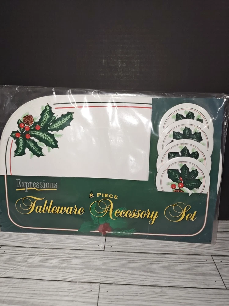Vintage PVC Placemat Coaster Set Holly Berry Christmas Holiday Design 8 Pc Set. Packaging has wear from age and storage. See pictures. Sold as is.