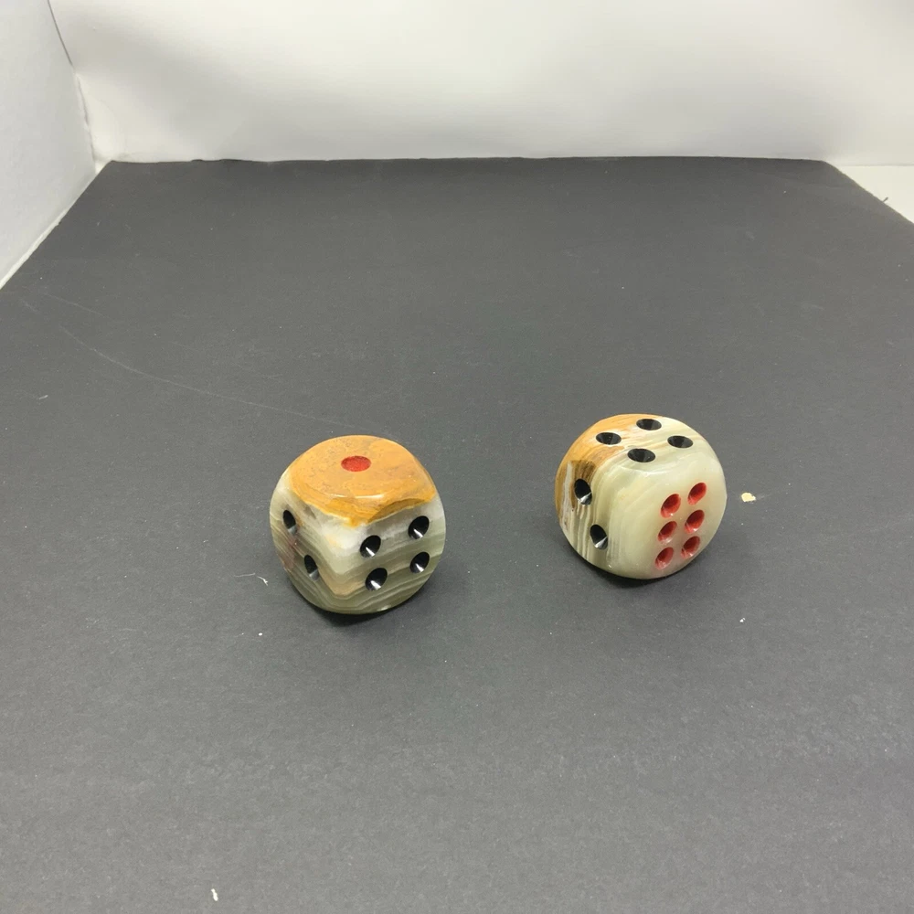 This is a vintage pair of hand-made onyx/marble dice measuring 1.57 inches . They can be used as office décor or paperweights. The dice are made of marble and were likely crafted by an unknown artisan. They are a unique and decorative addition to any collection. Located in mini cabinet