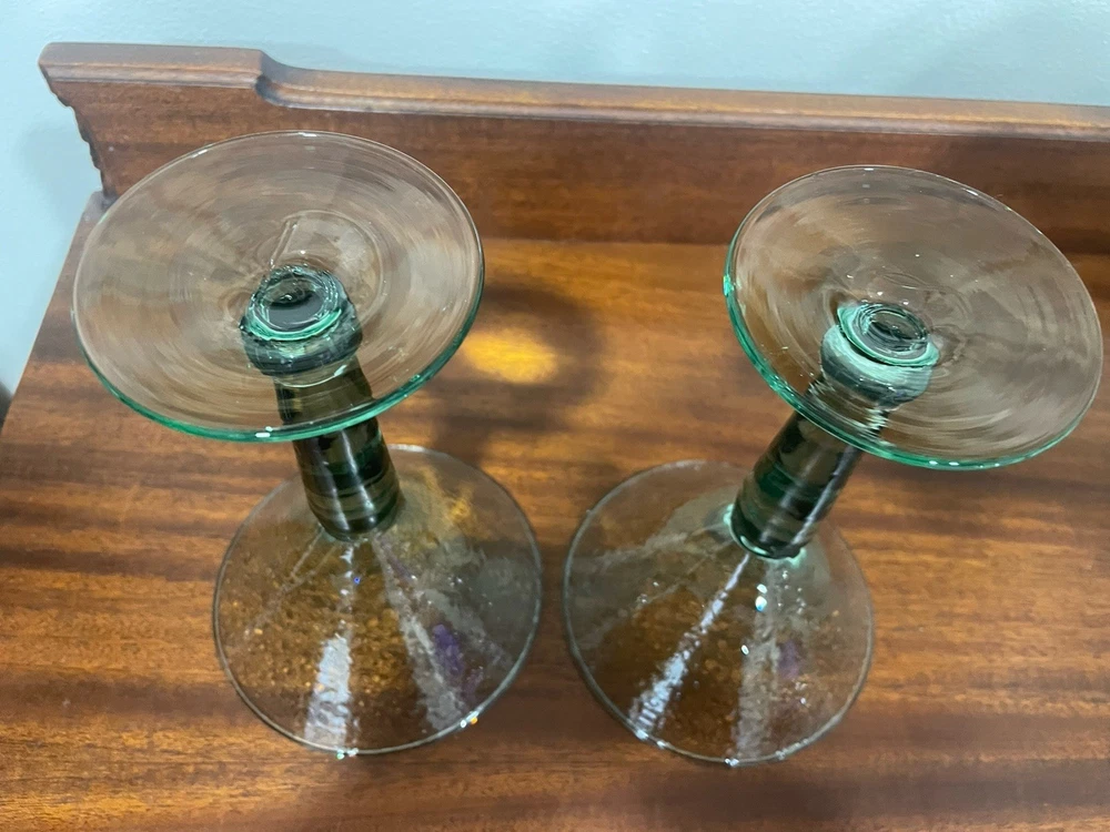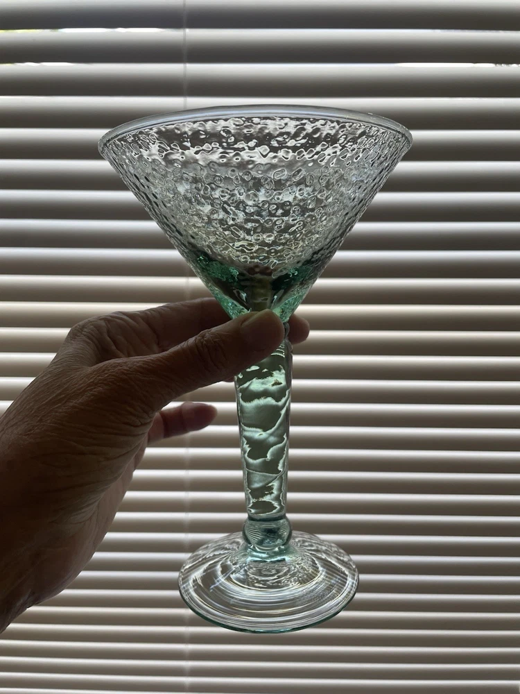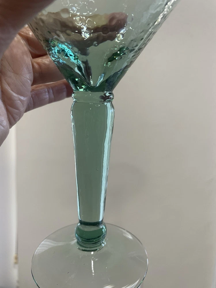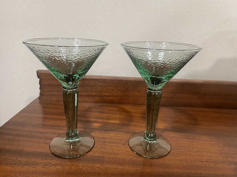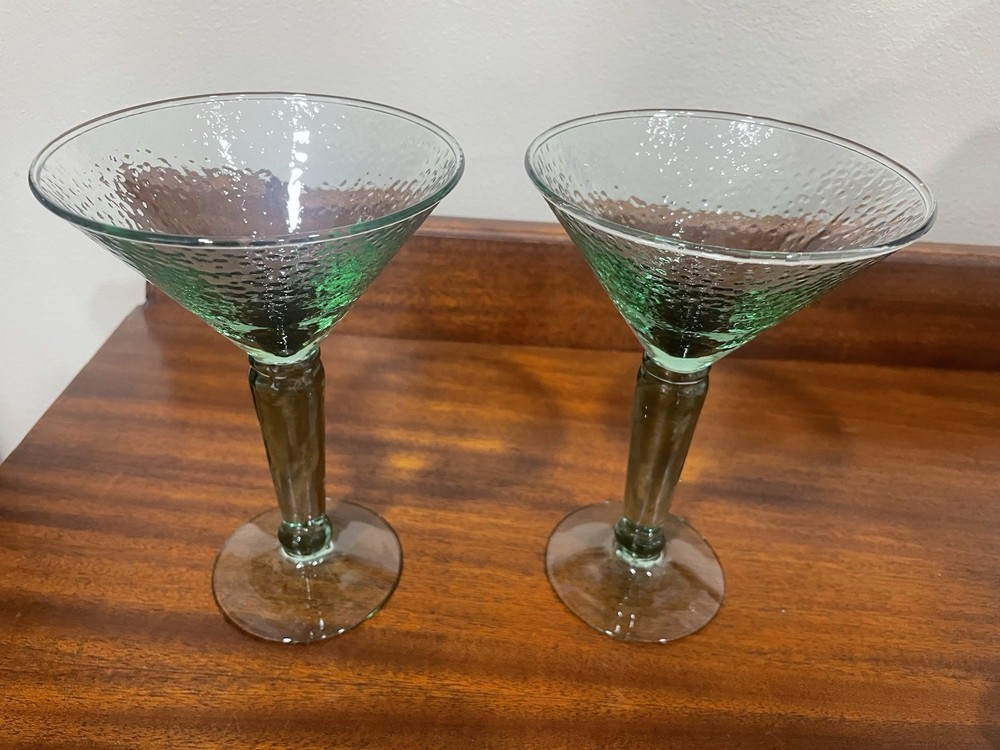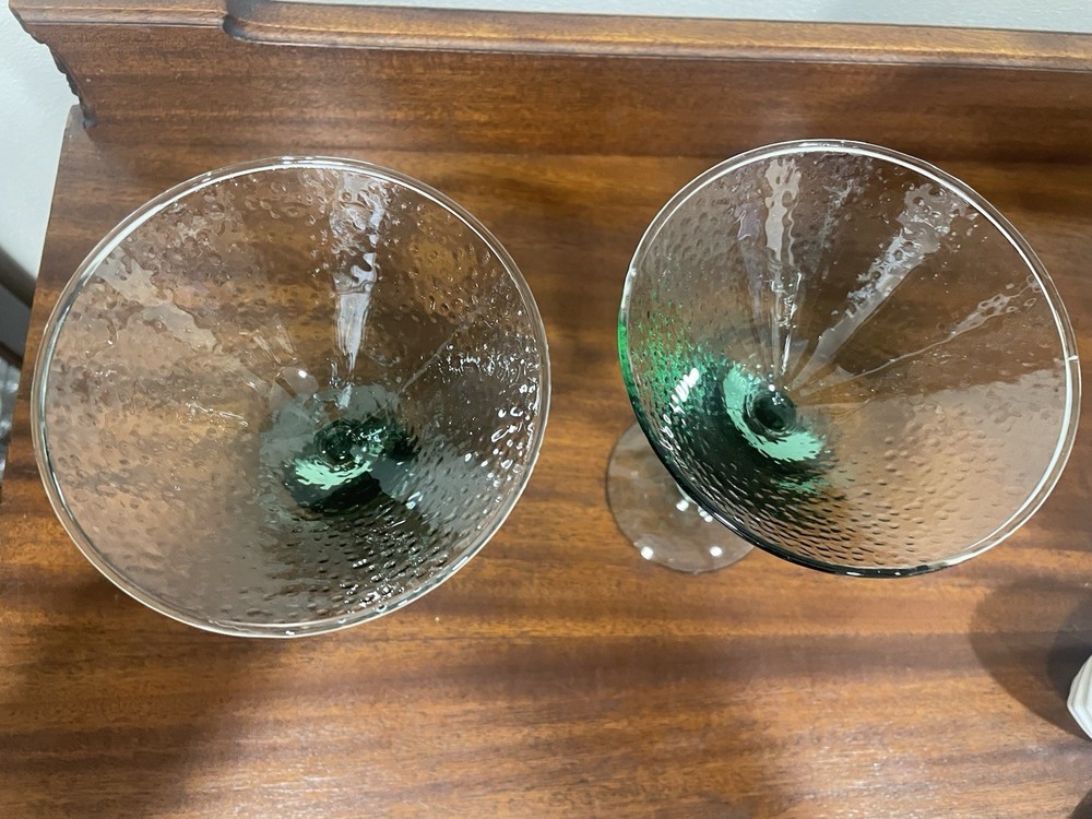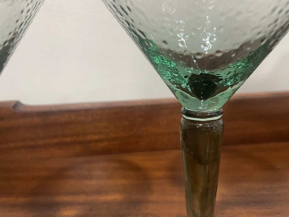 Elevate your home bar collection with this vintage lot of two light green pebbled martini glasses. The glasses stand at an impressive 7 inches tall and showcase a glossy finish that catches the eye. The unmarked glasses are made of pressed glass and have a production style of art glass, making them a unique addition to your drinkware. Each glass is handmade, adding a touch of craftsmanship to your collection. The glasses are perfect for serving margaritas or any other cocktail that you enjoy. Add a touch of elegance to your parties with these beautiful glasses.