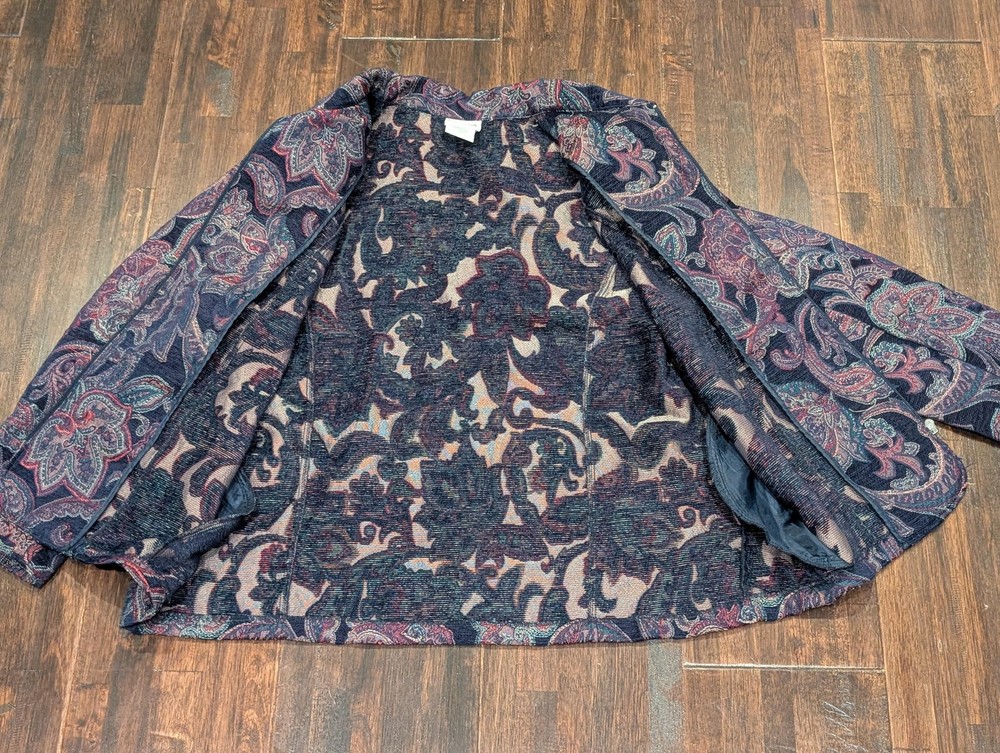 $ 13.2Vintage Chicos Tapestry Carpet Jacket Medium Brick Red Long Boho Witchy Artsy