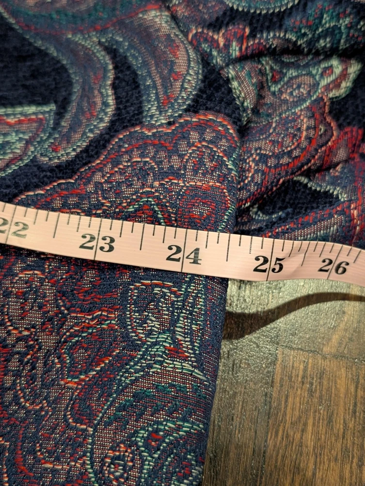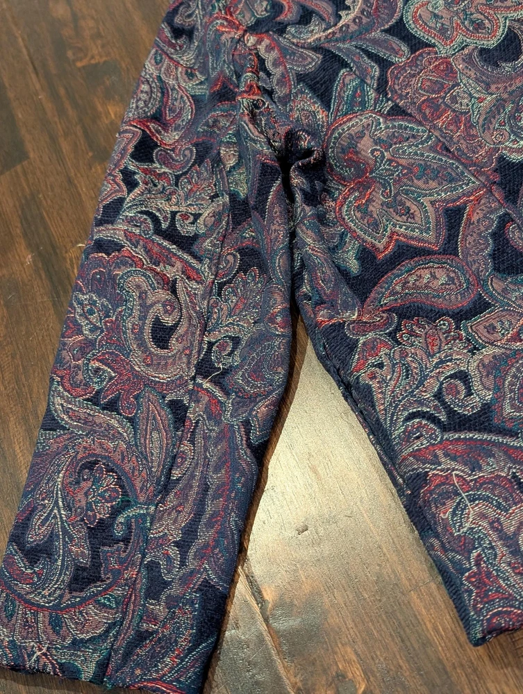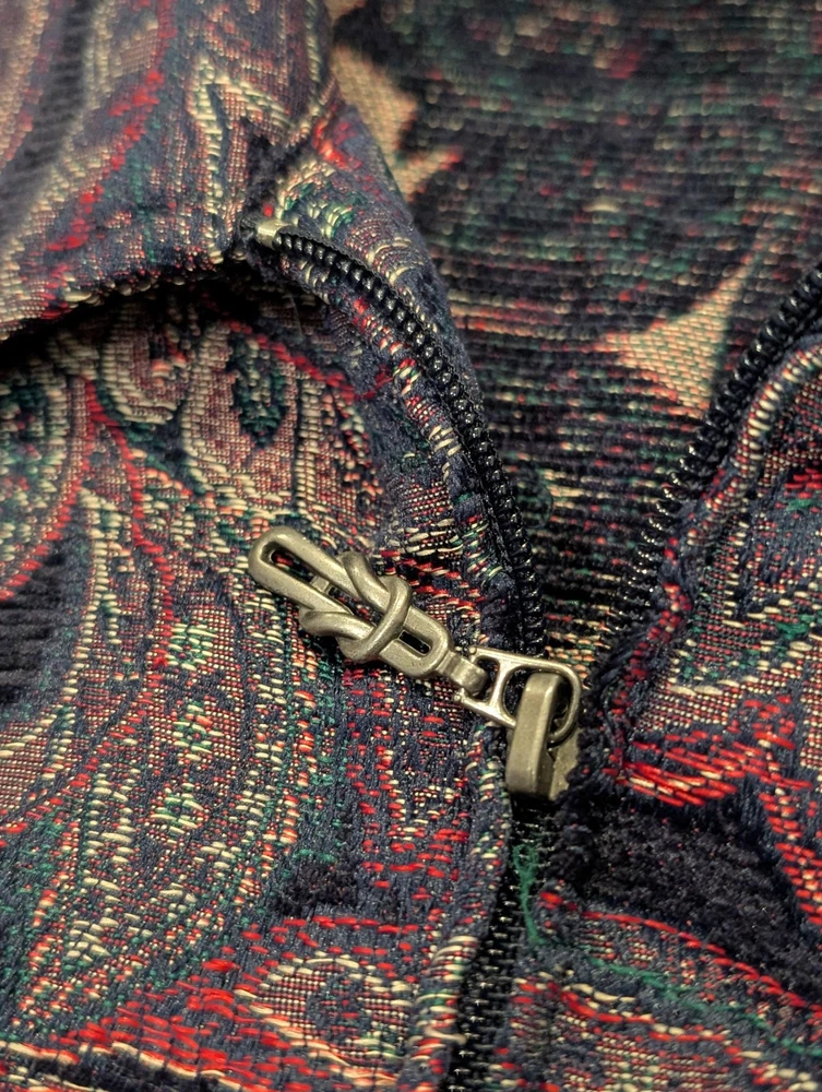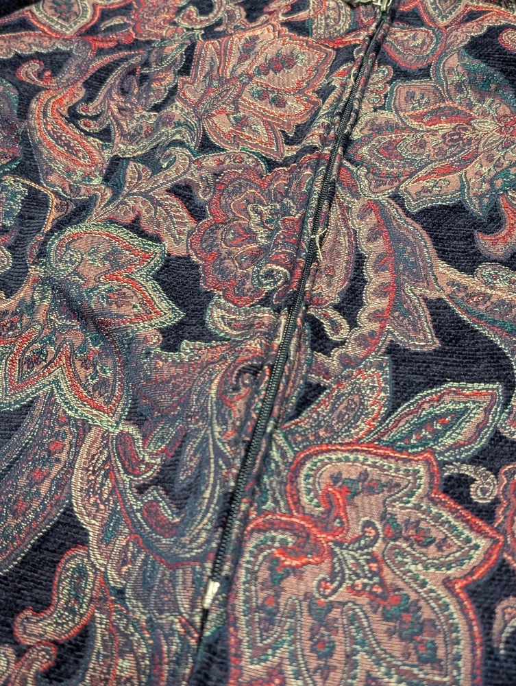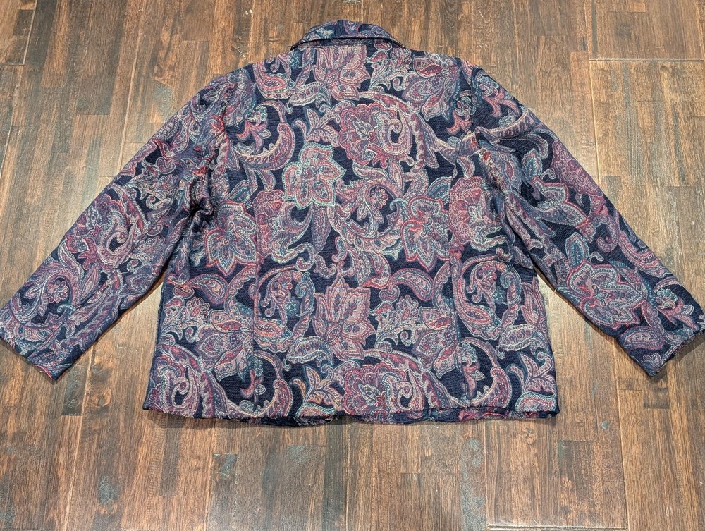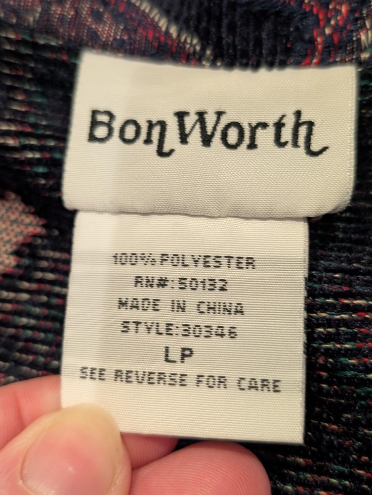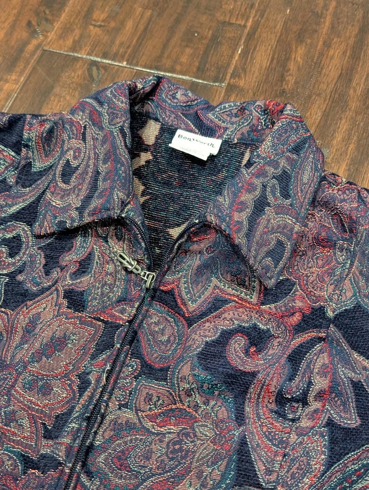 Brand: BonWorth Item: Womens zip-front jacket with a collared neckline in a textured jacquard paisley pattern. Color: Navy blue base with multicolor paisley accents in burgundy, teal, and green. Material: 100% polyester. Size on tag: Large Petite (LP). Style/Model code: 30546; RN 50132; Made in China. Details: Long sleeves, metal zipper pull, unlined knit body, allover paisley design; casual layering piece.