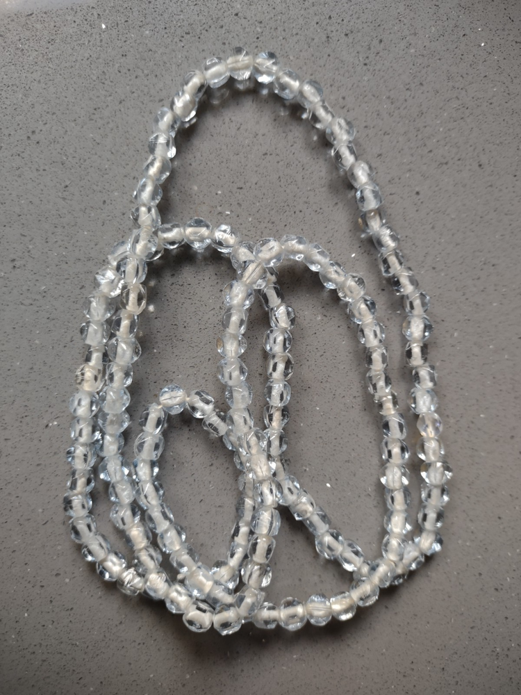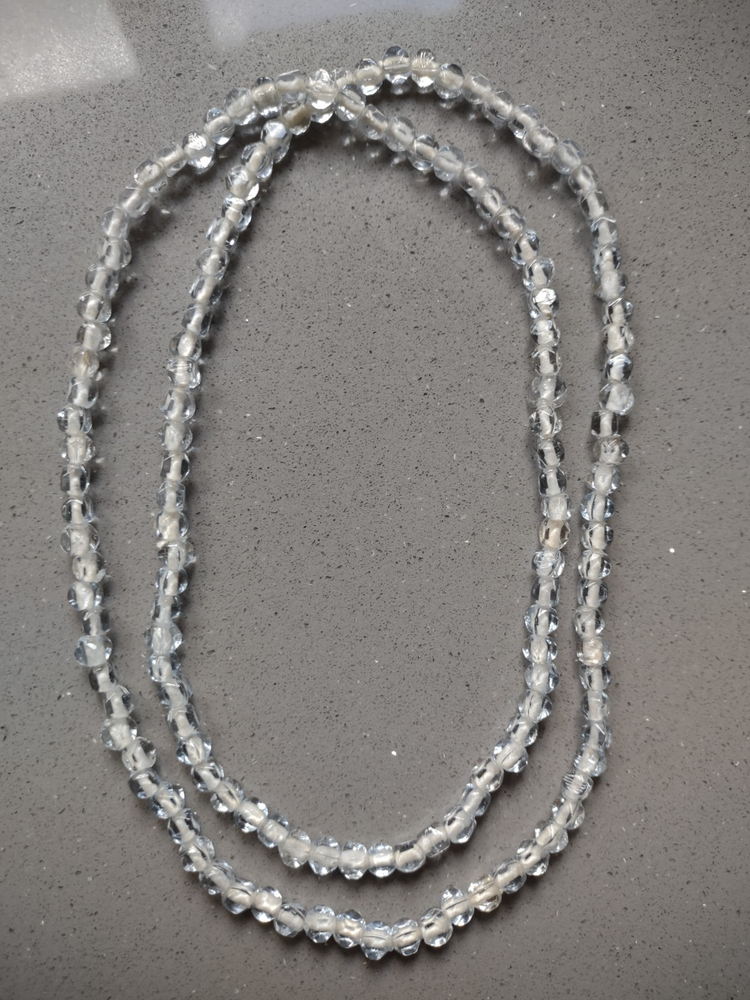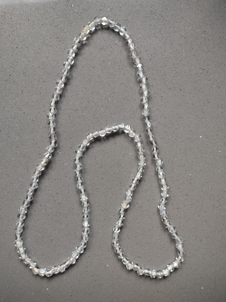Vintage pale blue, square faceted, glass bead necklace. Approx. 71cm in length, each bead approx. 4mm in diameter. Beads are in excellent condition.