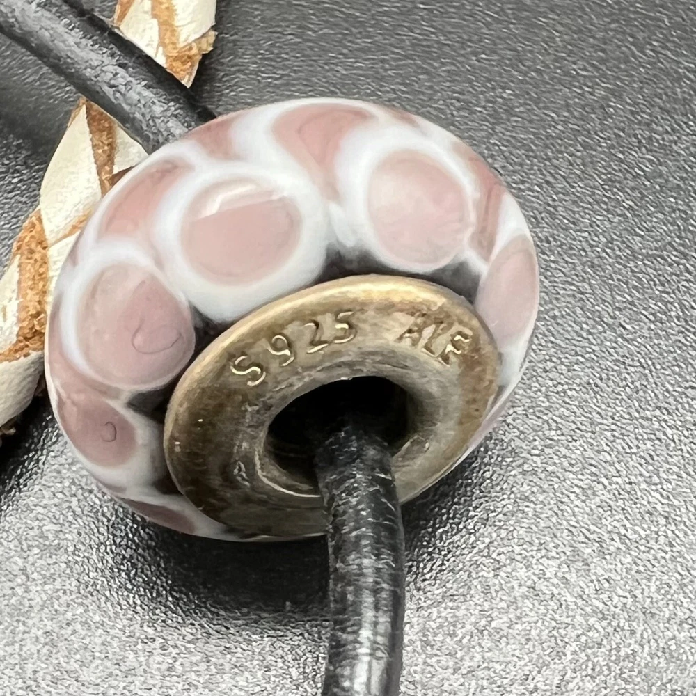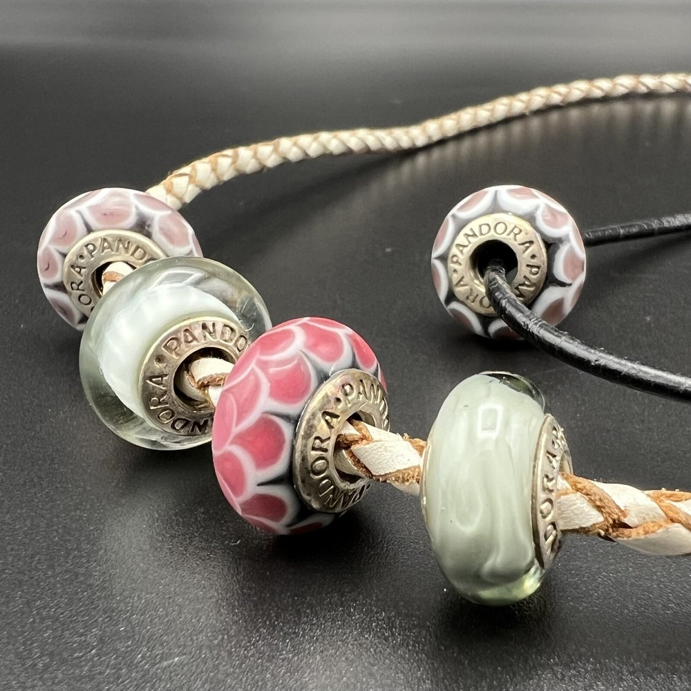 A huge find for Pandora collectors! 2 leather cords with sterling clasps and 5 Murano glass beads. ALL signed with the Pandora and the S925 ALE hallmark. Sellers best guess of age of components is around 2010. Modern Pandora beads may not be compatible with these vintage pieces. Please review photos carefully; they are considered part of the description. Photos may be enhanced to show detail. Priced to move quickly! Bid now!