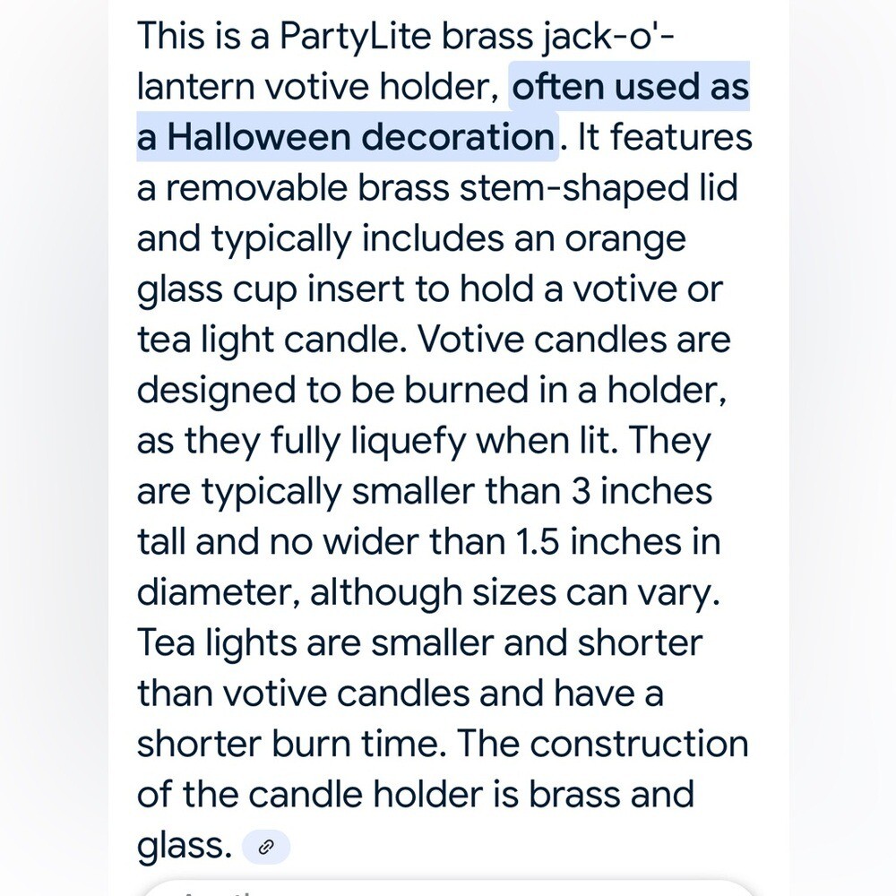 Occasion: Halloween/fall Material: Brass Color: Gold MPN: Na Suitable For: Votive Candle, Tea Light, Flameless/LED Candle Brand: PartyLite Department: Adults Character: Jack O Lantern Type: Candle Holder Country/Region of Manufacture: Unknown