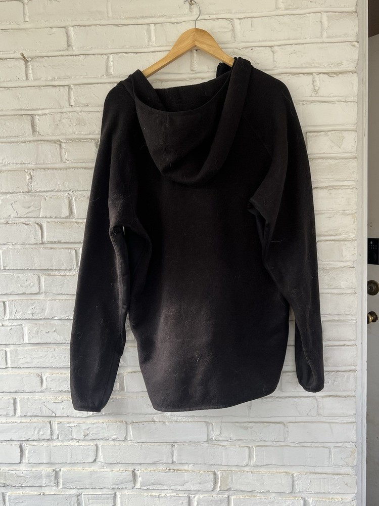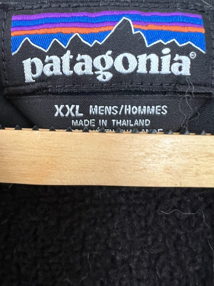 The product is a vintage Patagonia black fleece jacket in men's size XXL. This long overcoat features a zip closure and is made of polyester fleece fabric, making it cozy and comfortable for colder weather. The classic black color and iconic Patagonia branding give it a timeless and stylish look perfect for any casual or outdoor setting. Ideal for those looking for a warm and versatile jacket with a vintage flair.