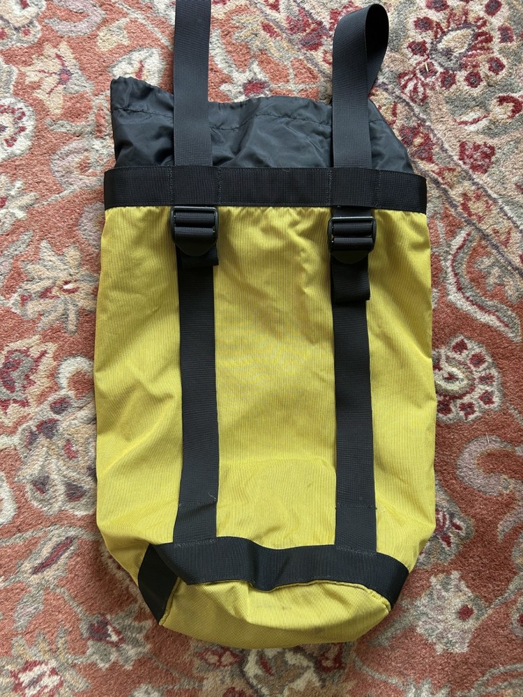 A vintage Patagonia climbing or work pack of some sort. Not much I could find on an exact model, but likely from the late 90s or early 00s. It looks like it might be a climbing pack that you could clip to an anchor. Shoulder straps retract into the top straps, which is a cool design. There is a slot that you can put rope through for a hip belt. In really great condition, kept in a box for a long time and likely never saw the light of day. I would guess maybe 15-20L of capacity.There are no visible tags I could find to confirm a year.
