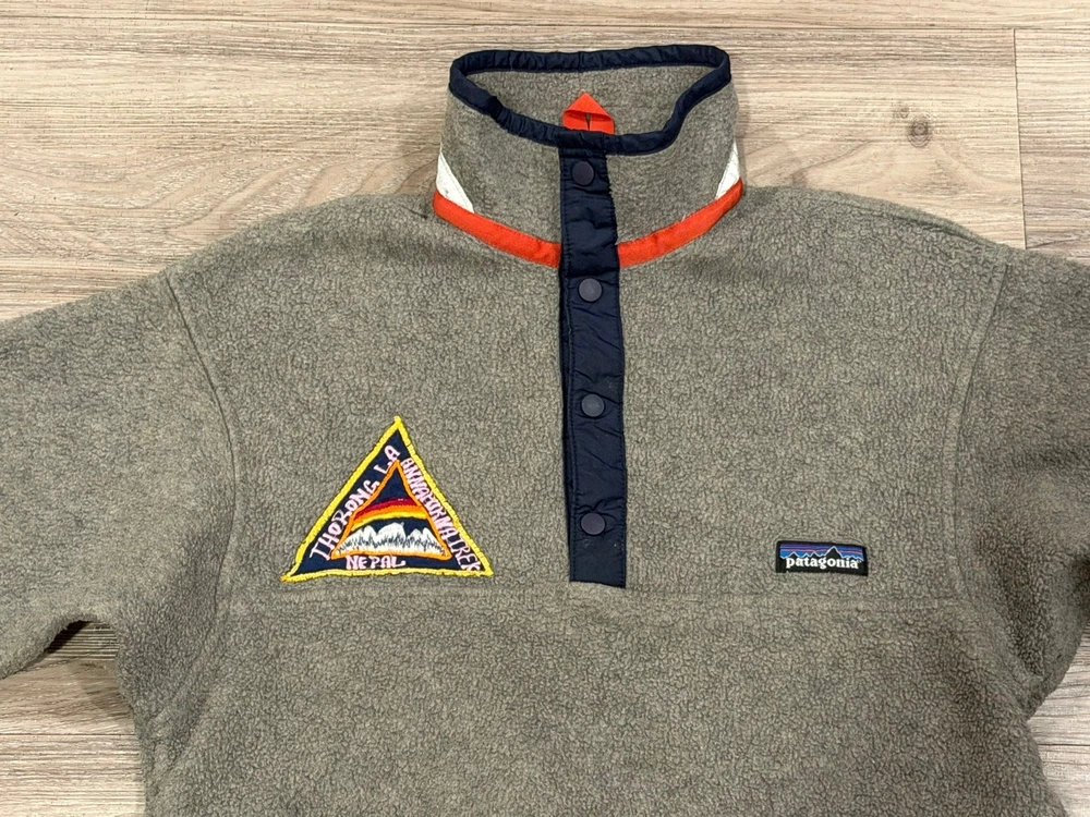 The Vintage Patagonia Synchilla Snap Fleece Pullover is a colorful and patriotic sweatshirt perfect for kids. Made in the USA with fleece fabric, this pullover features a snap closure and a unique Peru patch design. The multicolor exterior with USA theme makes it a stylish and comfortable choice for both boys and girls in size 6. Celebrate the spirit of Americana with this classic and timeless piece from a reputable brand like Patagonia.