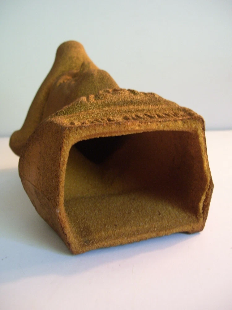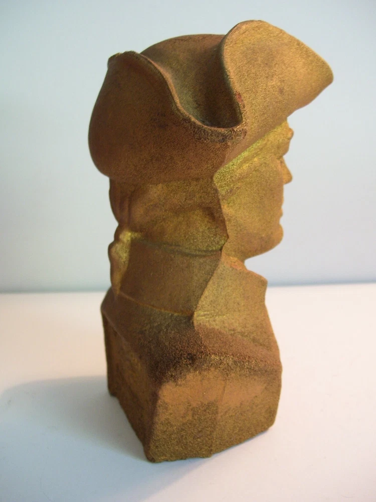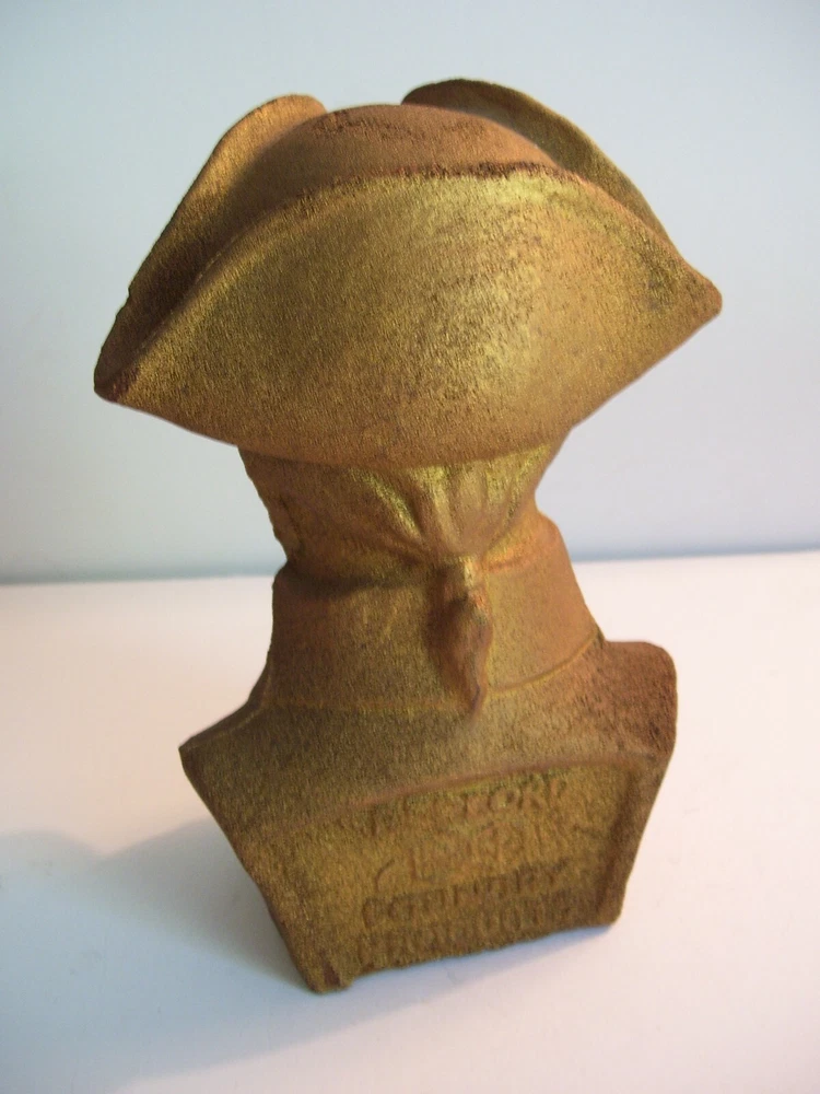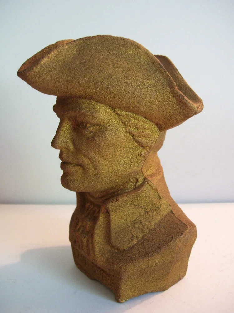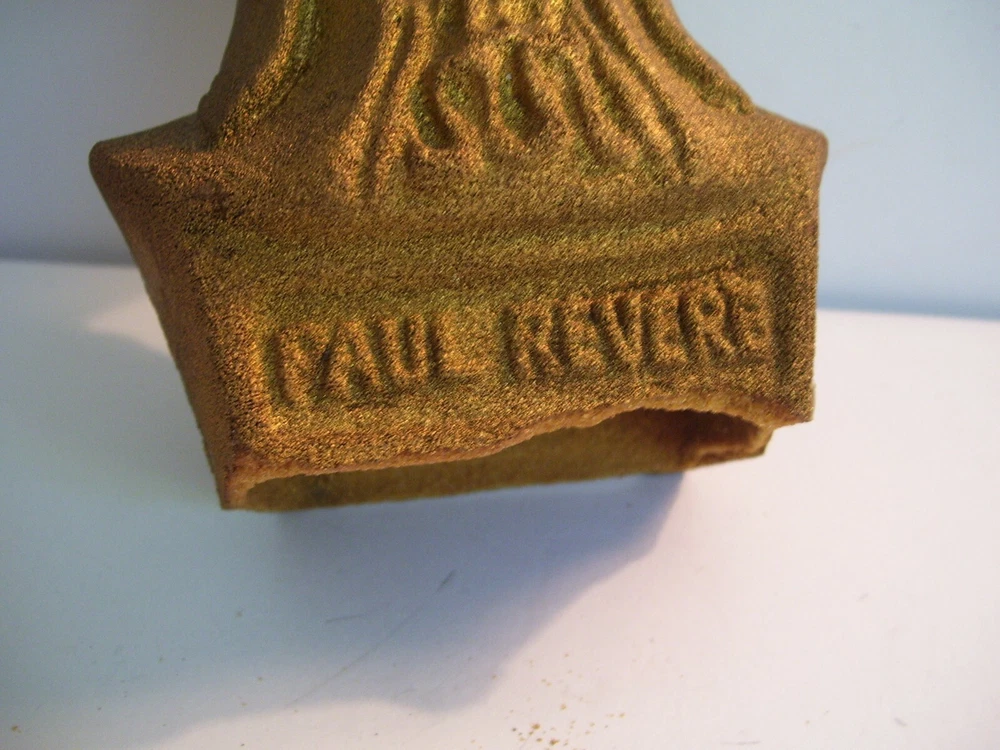 This is what I believe to be a sand casted mold of a head/bust figurine of the head of Paul Revere. This is stamped Redford Foundry Products on the reverse side. Sand casted molds are created for the casting of metal products. This sandy-textured and gritty mold is copper-colored with a sparkly or metallic finish. It measures approximately 6 1/2" tall and is about 4 1/3" across when measured at the corners of the tricorn hat. Nicely detailed down to the eye pupils, eyebrows, neck cravat, and hair wig that peeks out from beneath the tricorn hat. Bottom says "PAUL REVERE." Has a small break/chip in casting mold at bottom front edge and some wear on top of hat but otherwise in very good condition. A scarce item. Sale final; no return. Thanks for looking! Now for the fine print… I am happy to entertain your best, fair offer! I use the United States Postal Service (USPS) for all shipping. Items get shipped either first class or priority mail depending on their weight and size. Please keep in mind that shipping is expensive. I never charge an excessive shipping amount though I may add $1 to help defray the cost of shipping supplies. I will gladly invoice you and combine shipping for multiple items purchased. I ship every day; Monday through Friday (except during snow and ice storms) but do not ship on Saturdays. Thanks for your purchase!