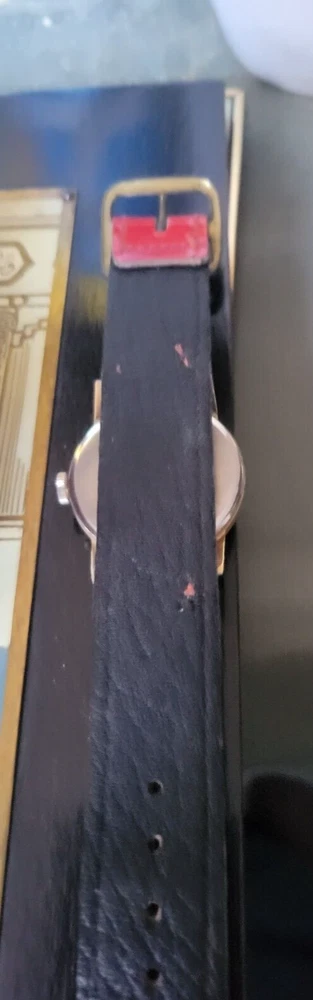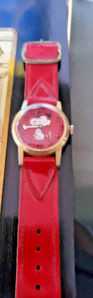 This vintage Timex wristwatch features a round, silver-bezeled dial with a red leather strap. The watch is a mechanical manual movement model, manufactured in 1958 in Hong Kong. It is a two-piece strap and has a red dial color. The watch is a casual style and has an analog display. The Snoopy model does not come with papers or the original box/packaging. It is a great addition to any vintage watch collection and perfect for children who love peanuts. The watch has a unique charm and character that makes it a valuable piece for any watch enthusiast.