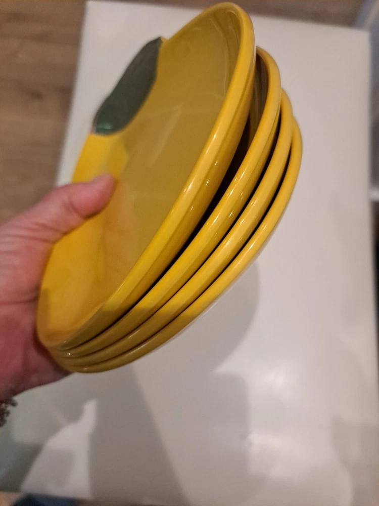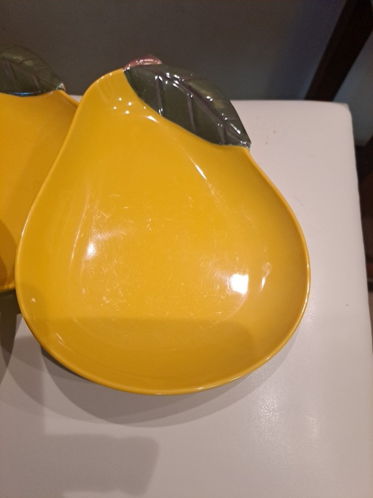 Thrse are a beautiful Estate Sale Find. Very good condition with minimal serface scratches, nothing deep , and not noticeable on first glance , without close inspection. Very beautiful overall. This set of 4 vintage pear-shaped snack plates is a stylish addition to any table setting. The melamine material plates feature a solid pattern with a yellow gold and green leaf color scheme, perfect for serving fruit appetizers. Each plate has one compartment and measures 8 inches in length and 5.75 inches in width, making them versatile for all occasions. With a contemporary style and shiny finish, these plates are both practical and eye-catching, adding a touch of charm to your dining experience. Perfect for entertaining guests or everyday use, these plates are sure to impress.