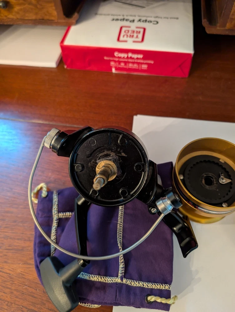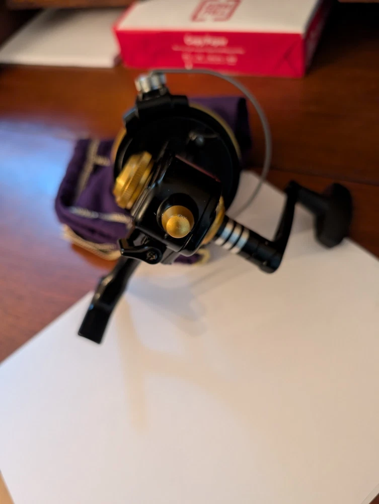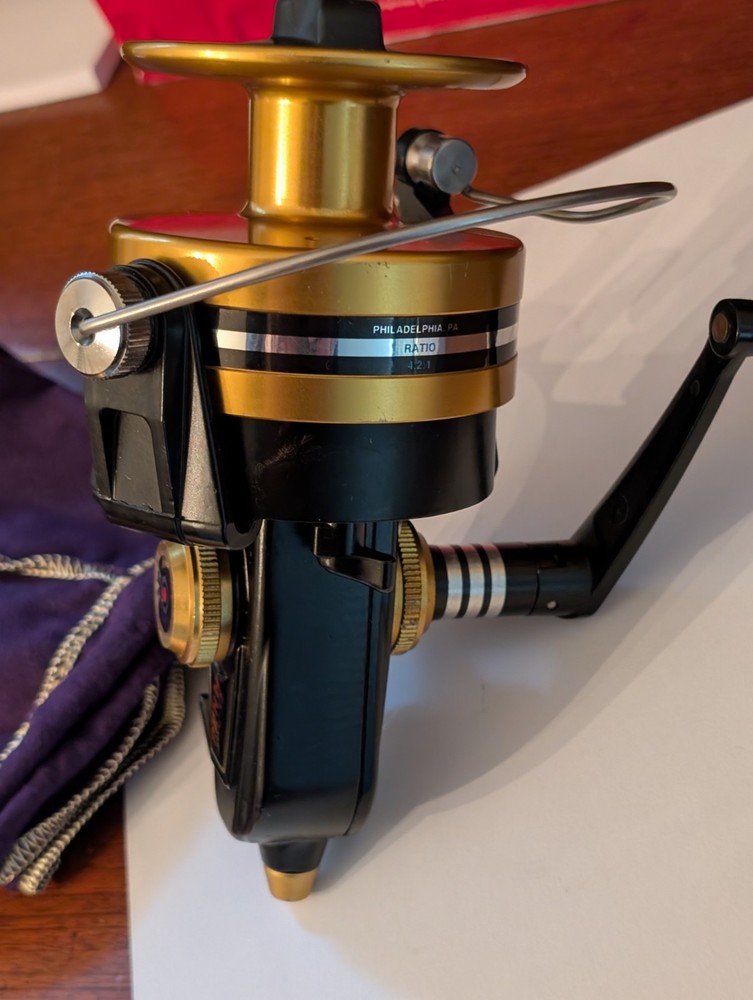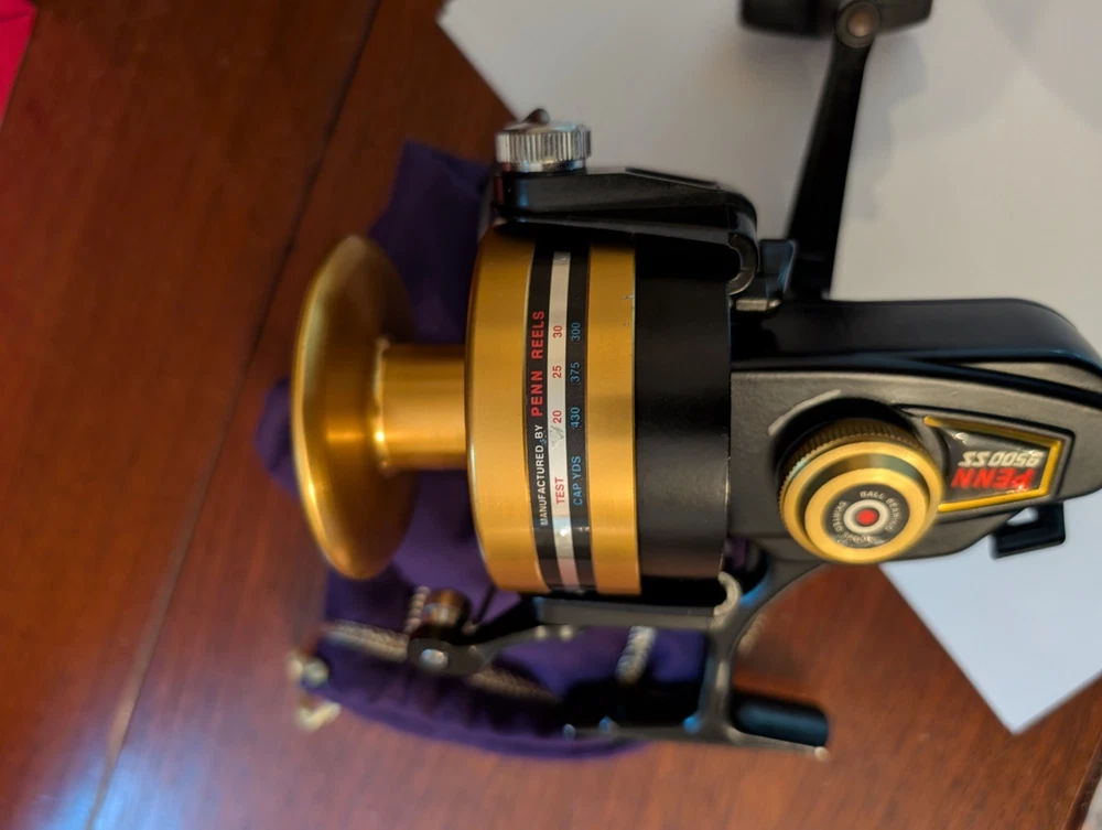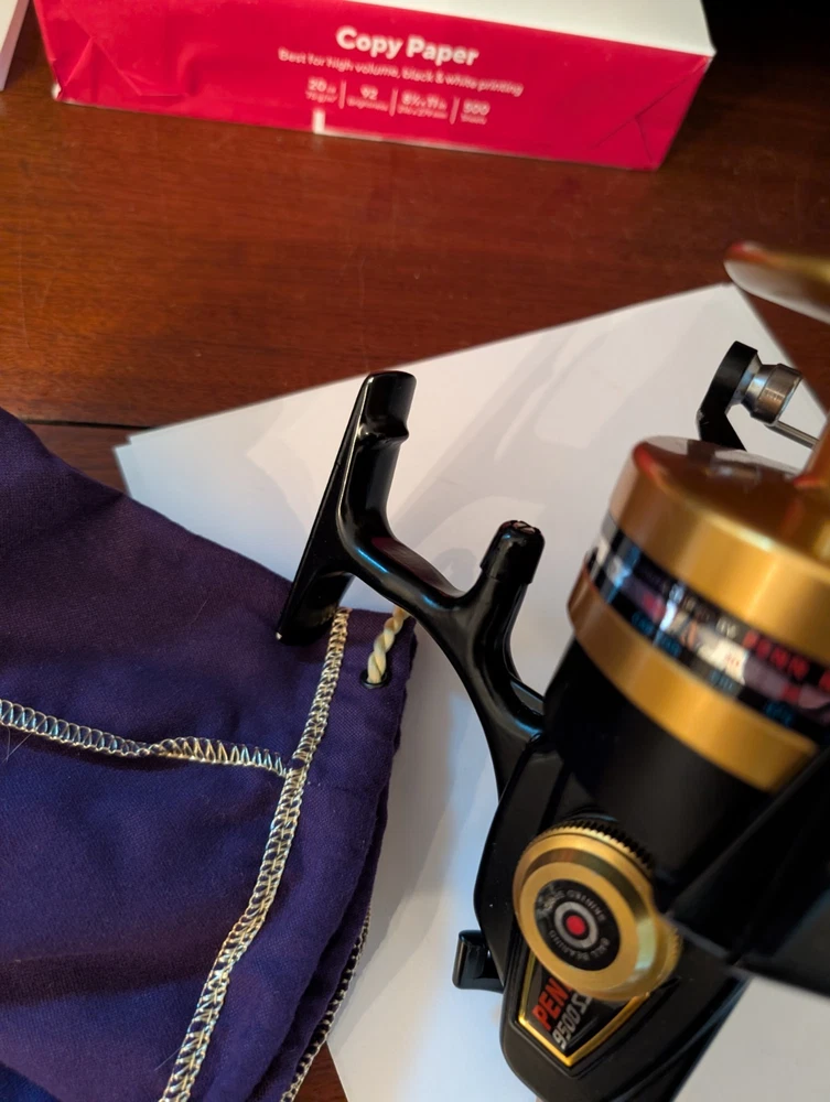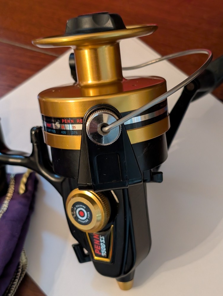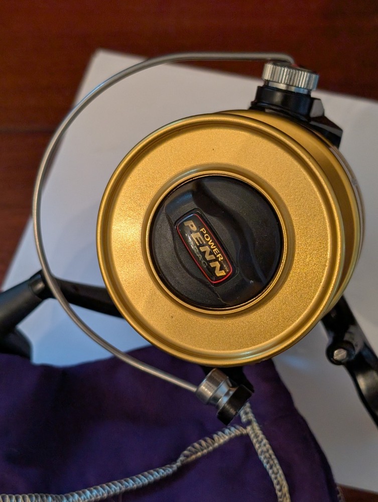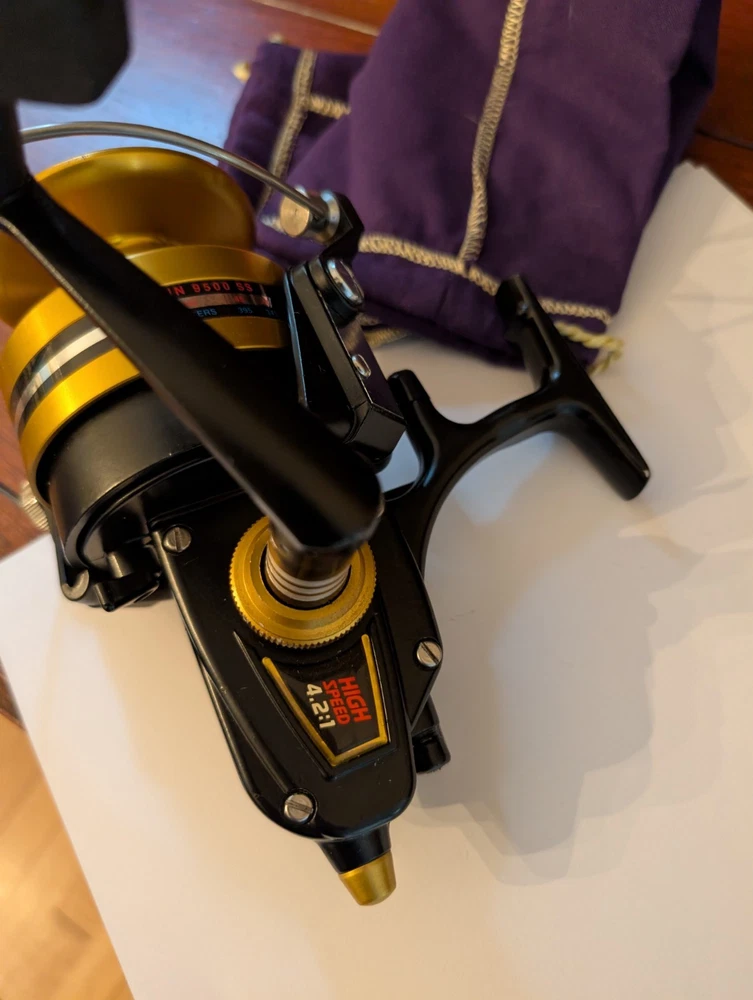 Really nice Penn workhorse 9500ss spinfisher black and gold spinning reel. Designed for larger game fish and used for surf fishing as well. Made in the USA to, it has a couple small marks on the line capacity label. Orherwise it is great working and cosmetic condition.