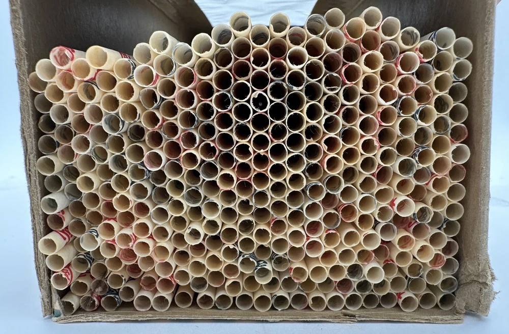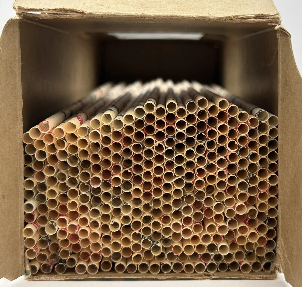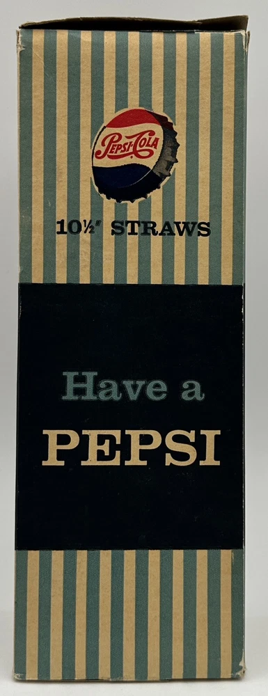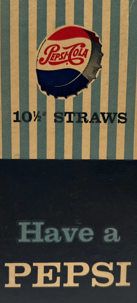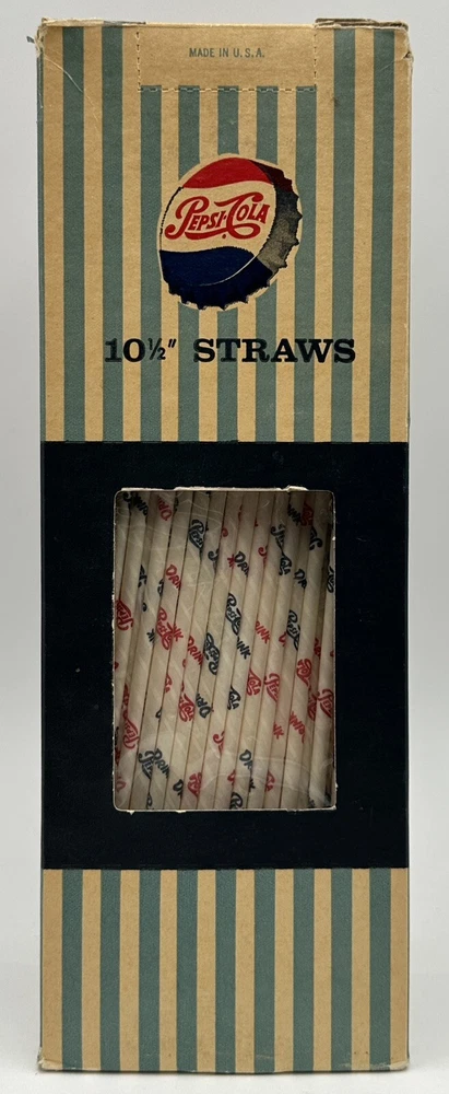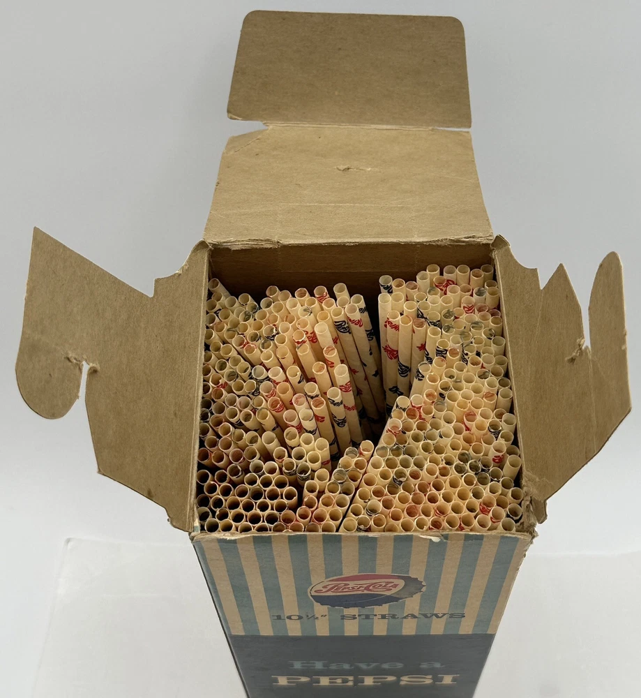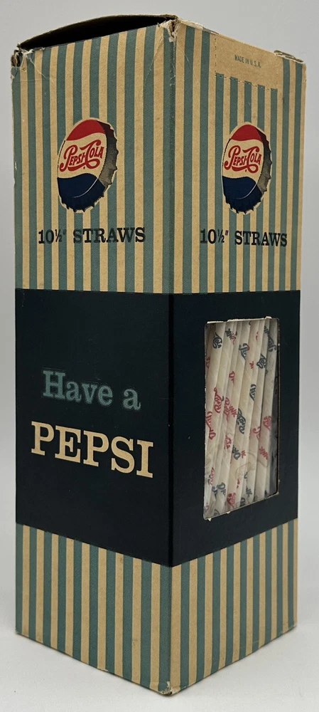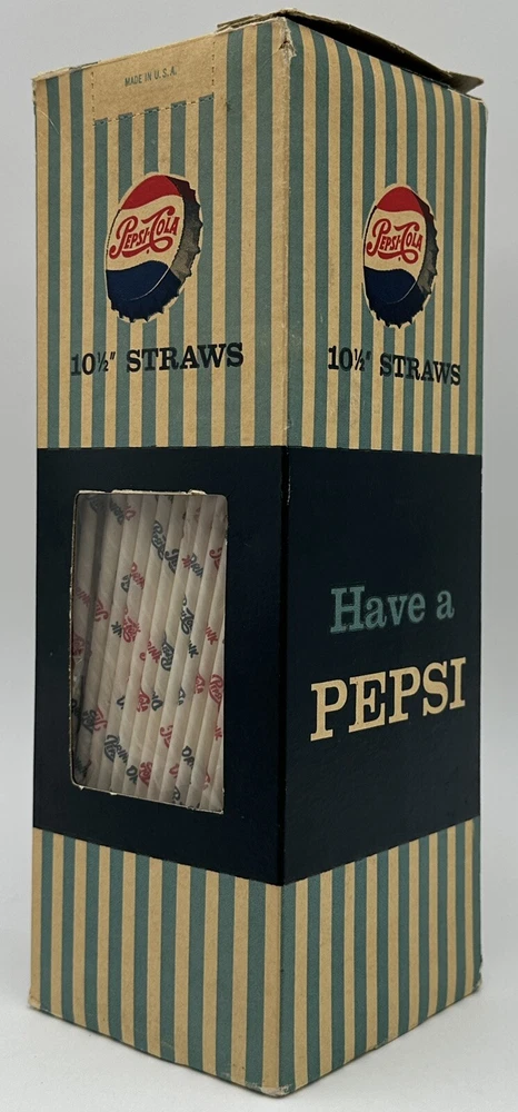 Box measures approximately 3 3/4 inches square and and 10 7/8 inches tall. Package contains approximately 320 vintage new old stock Pepsi Cola straws. Box shows storage wear as seen in pictures. Thanks for looking and happy buying! Follow this link to see all our ADVERTISING listings!