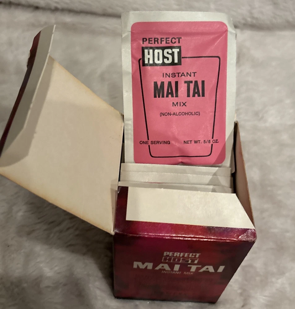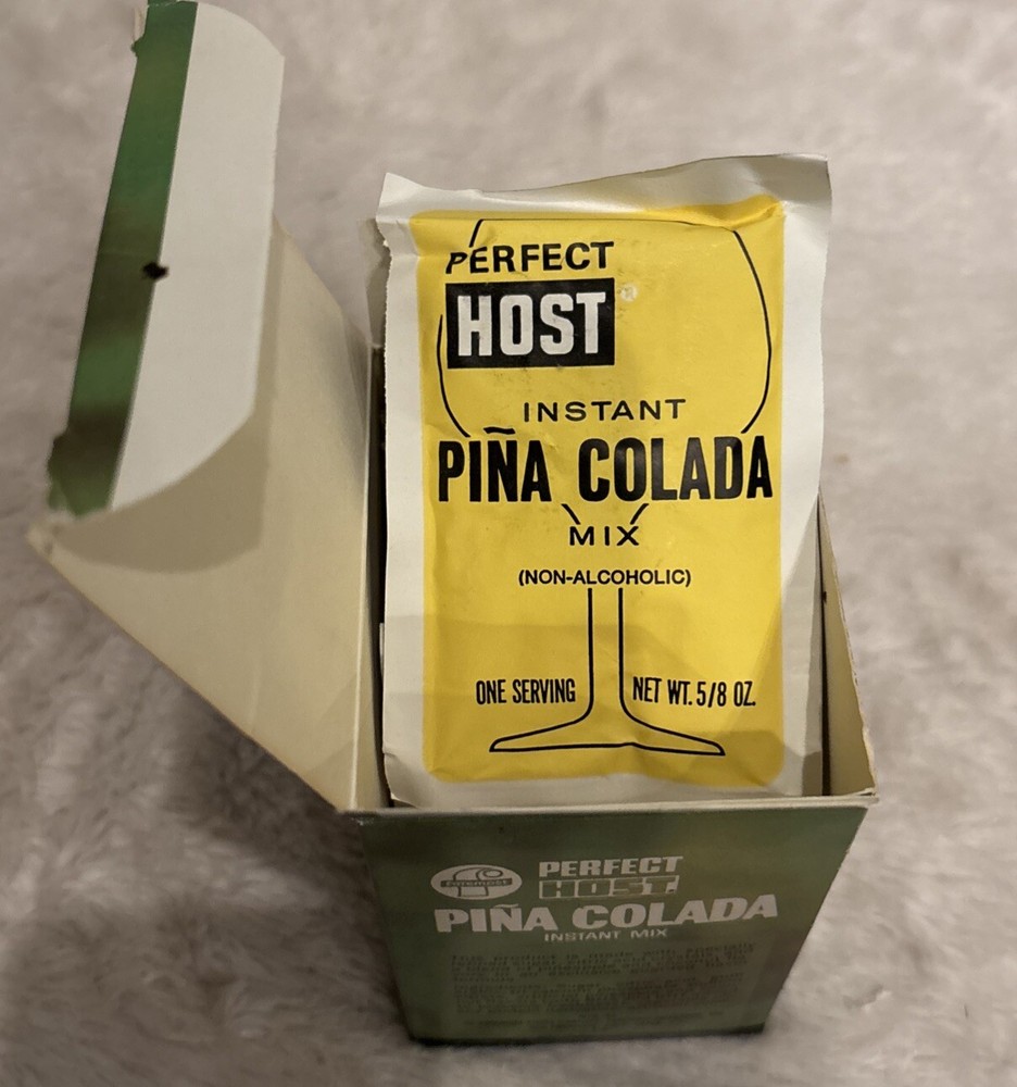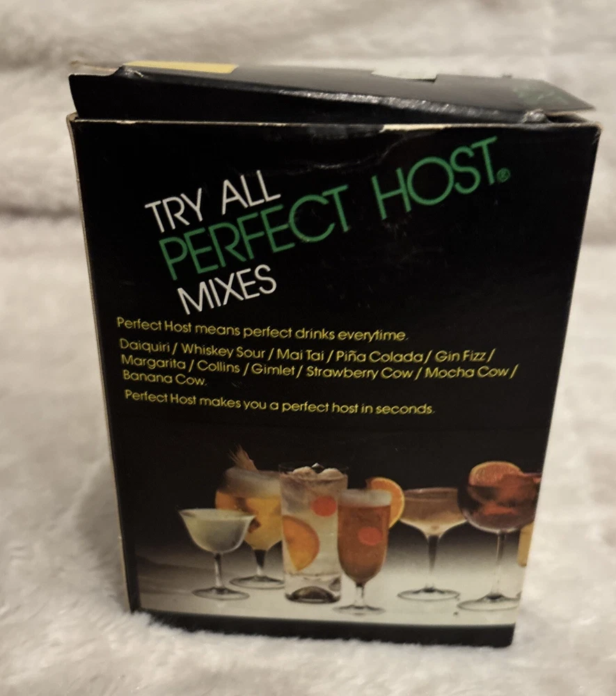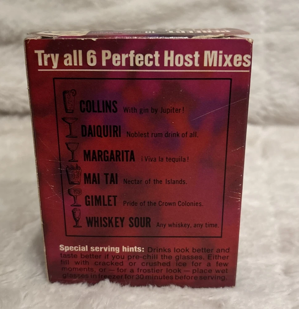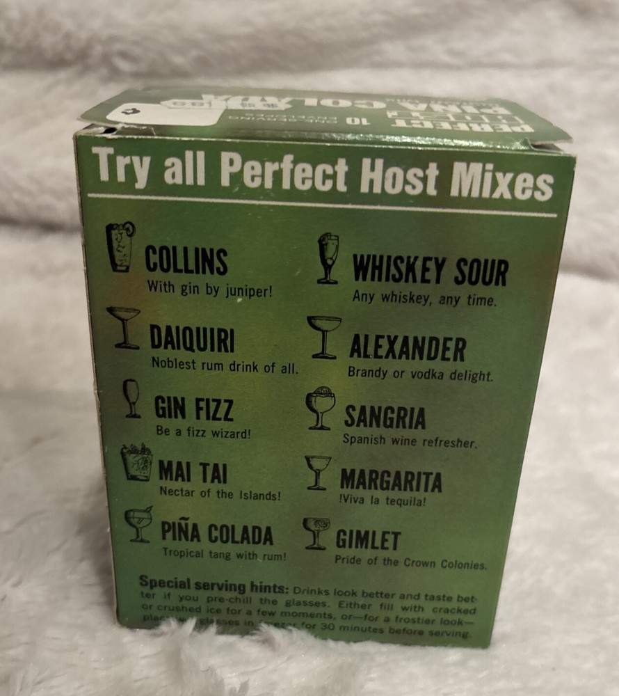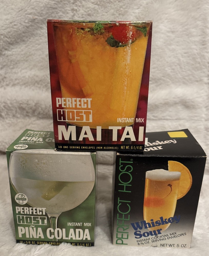 This is a vintage Perfect Host drink mixes collection featuring Whisky Sour, Mai Tai, and Pina Colada flavors. The product is an original and was made in the United States. The cocktail mix material is multicolored and perfect for adding to your barware collection. They are not for human consumption. These are old vintage drink mixes. Each box has the original amount of packs. This is a great prop or display
