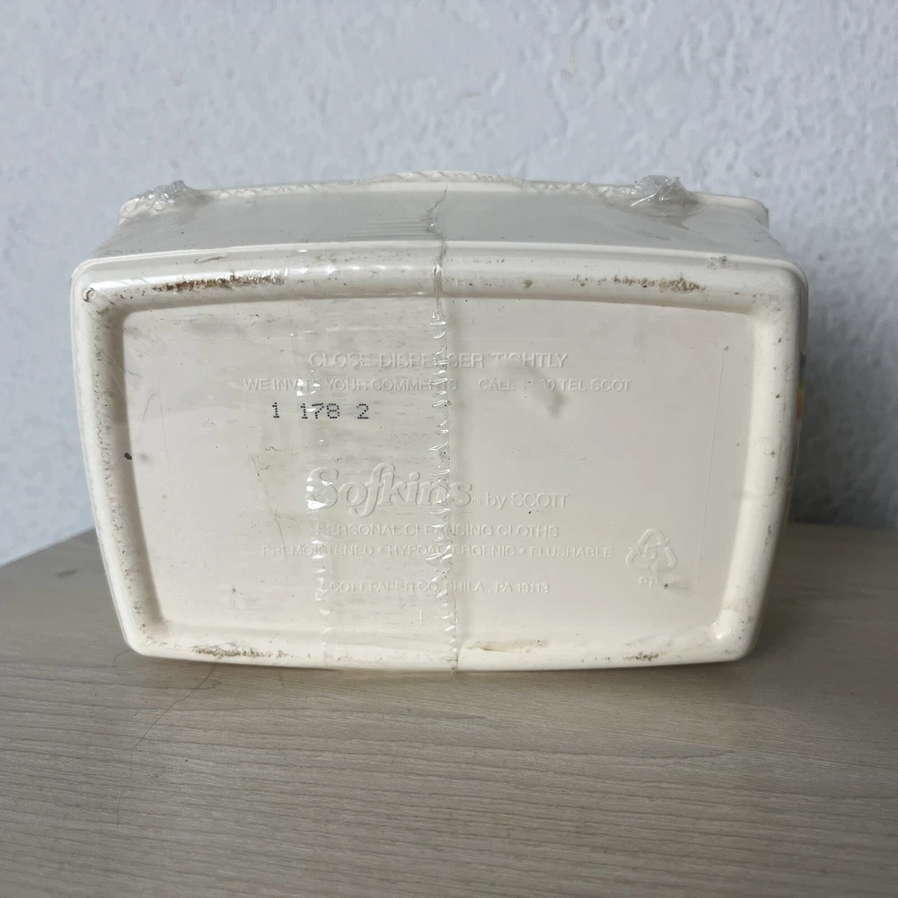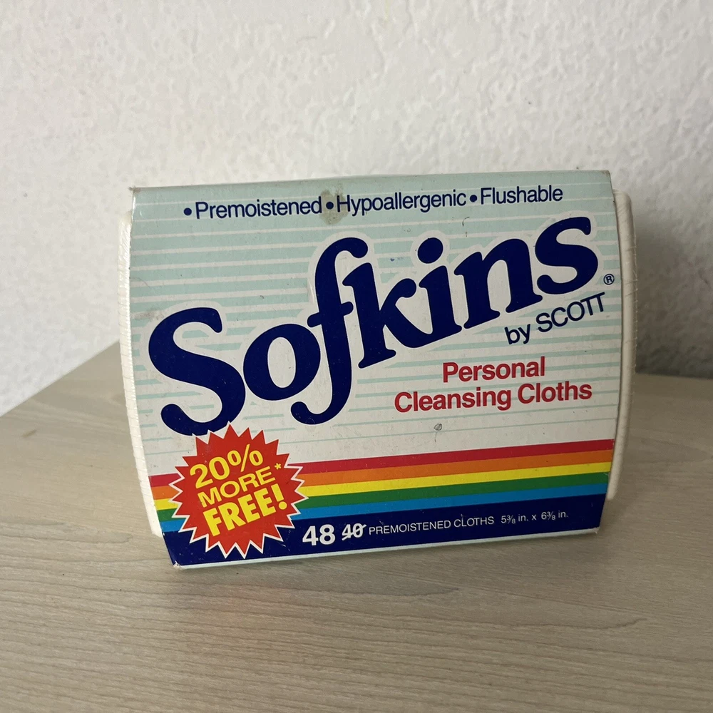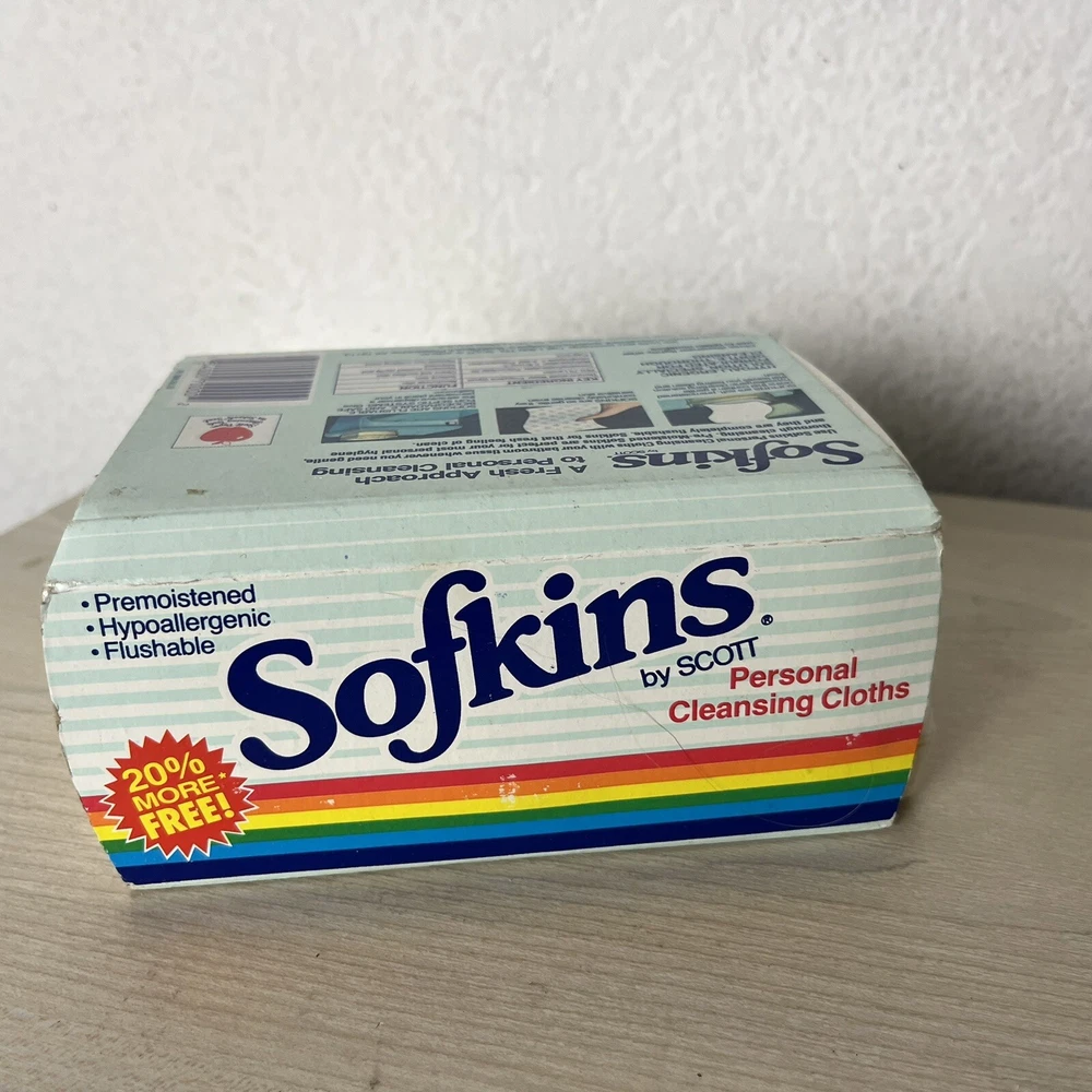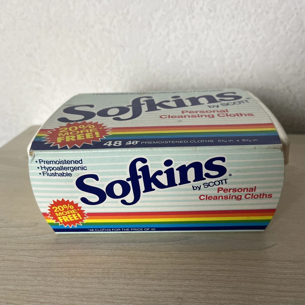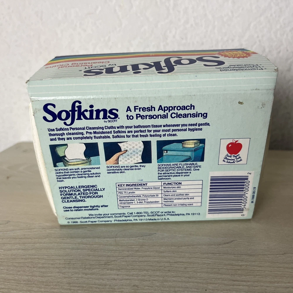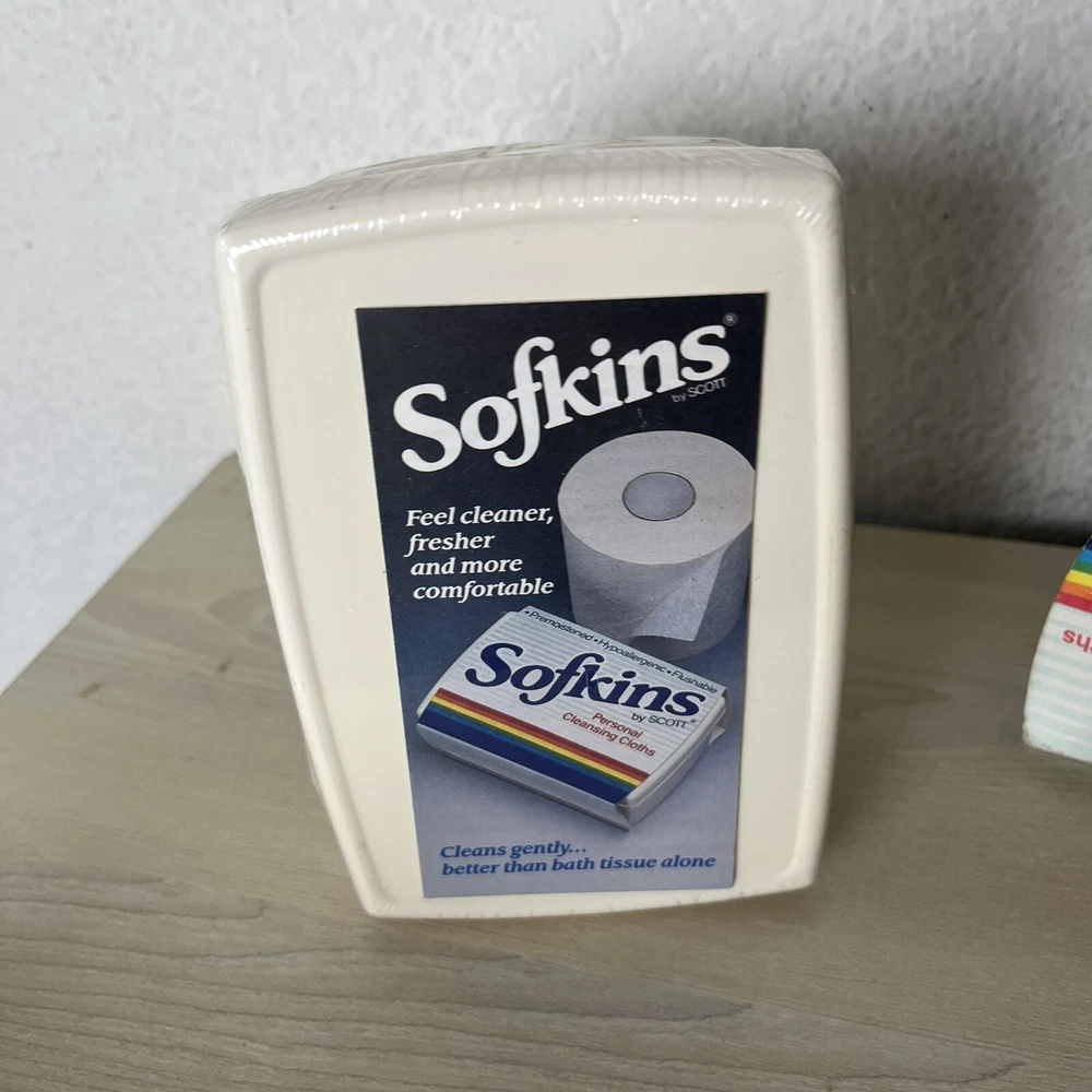 From 1988 sealed in package. There's some discoloration, in particular on the bottom, some of which may have gone through the seal to the plastic box 48 personal cleansing cloths in a plastic container box More than likely these are dried out inside ------- This vintage plastic container from Scott Paper Co. is a must-have for collectors of health and beauty advertising. The container is marked with the Sofkins Personal Flushable logo and is an original piece. The white color of the container adds to its aesthetic appeal. This item is perfect for those interested in the history of advertising and the beauty industry. It was made in the United States and is a rare find. The plastic box type of advertising is unique and adds to the overall charm of the item. Add this to your collection of other health and beauty ads, health and beauty items, or advertising memorabilia today.